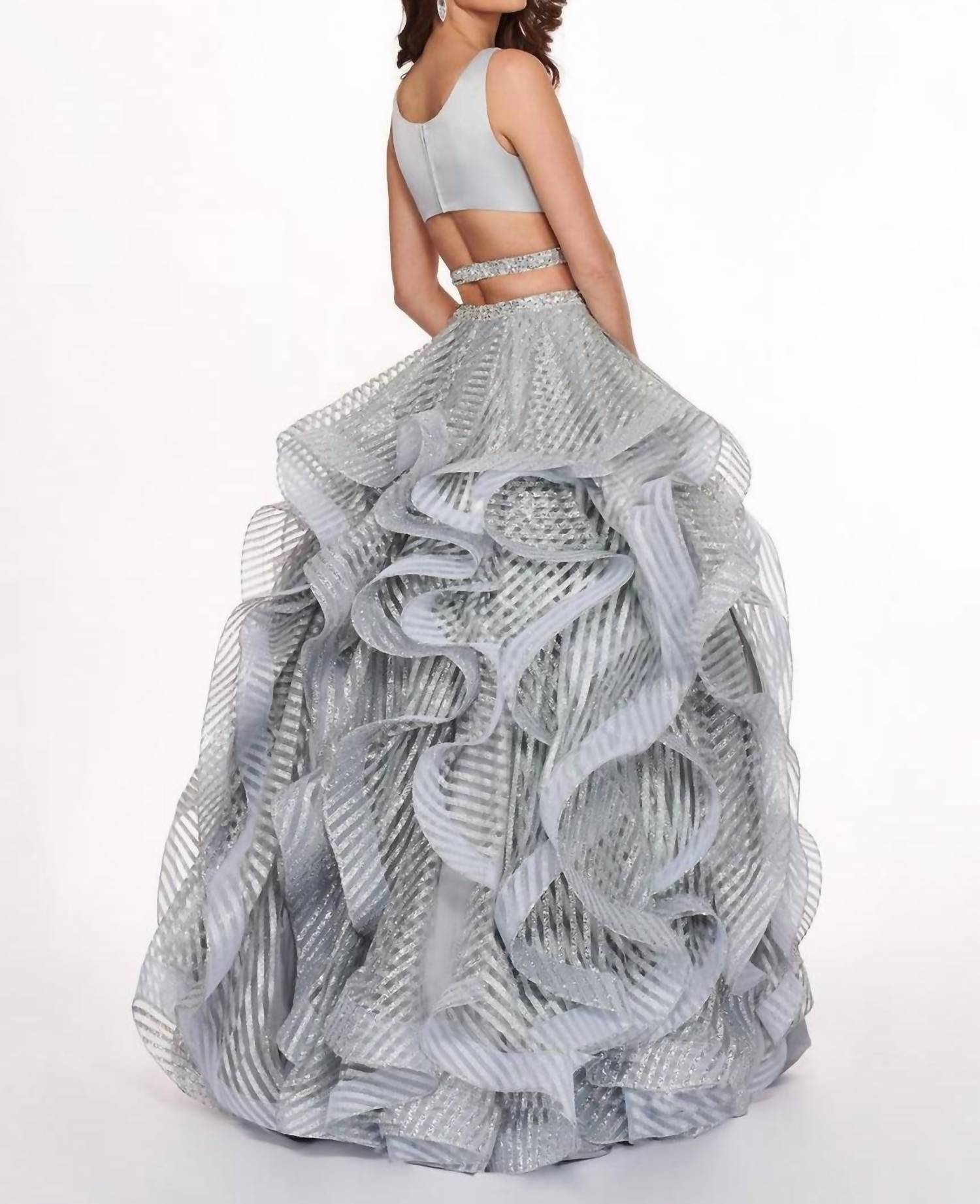 Just add a cute little clutch and a matching heel for the perfect event look. Introducing the Two-piece Matte Satin Ruffled Gown by RACHEL ALLAN, a stunning choice for your next prom event. This sleeveless gown in a shimmering silver features a v-neckline with a mesh inset and ruffled ball gown skirt, expertly crafted from a combination of matte satin and glitter tulle. The design includes side and back cutouts, enhancing its elegant silhouette. Easy to wear with a zip closure, this A-line gown is sure to make a lasting impression.