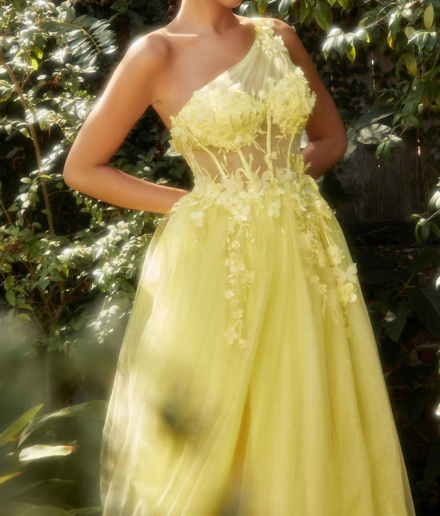 This one-shoulder evening gown boasts a sheer illusion corset bodice, offering a modern and elegant touch. Adorned with intricate floral appliqués and embellishments, the design is elevated by a daring high leg slit. Crafted from 100% polyester, the gown is floor-length, providing a dramatic and sophisticated finish. Perfect for making a statement at any formal event.