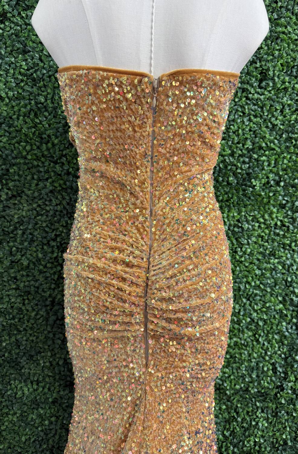 Turn heads in the cutest and most flattering evening dress. This strapless gown features stretch sequin overlaying a luxurious velvet fabric. The base color is a rich gold/yellow, enhanced with gold iridescent sequins and a silver-embellished neckline for a touch of elegance. A stunning long train flows gracefully, while the ruched detailing at the back accentuates the silhouette. The dress is completed with a full zipper closure at the back.