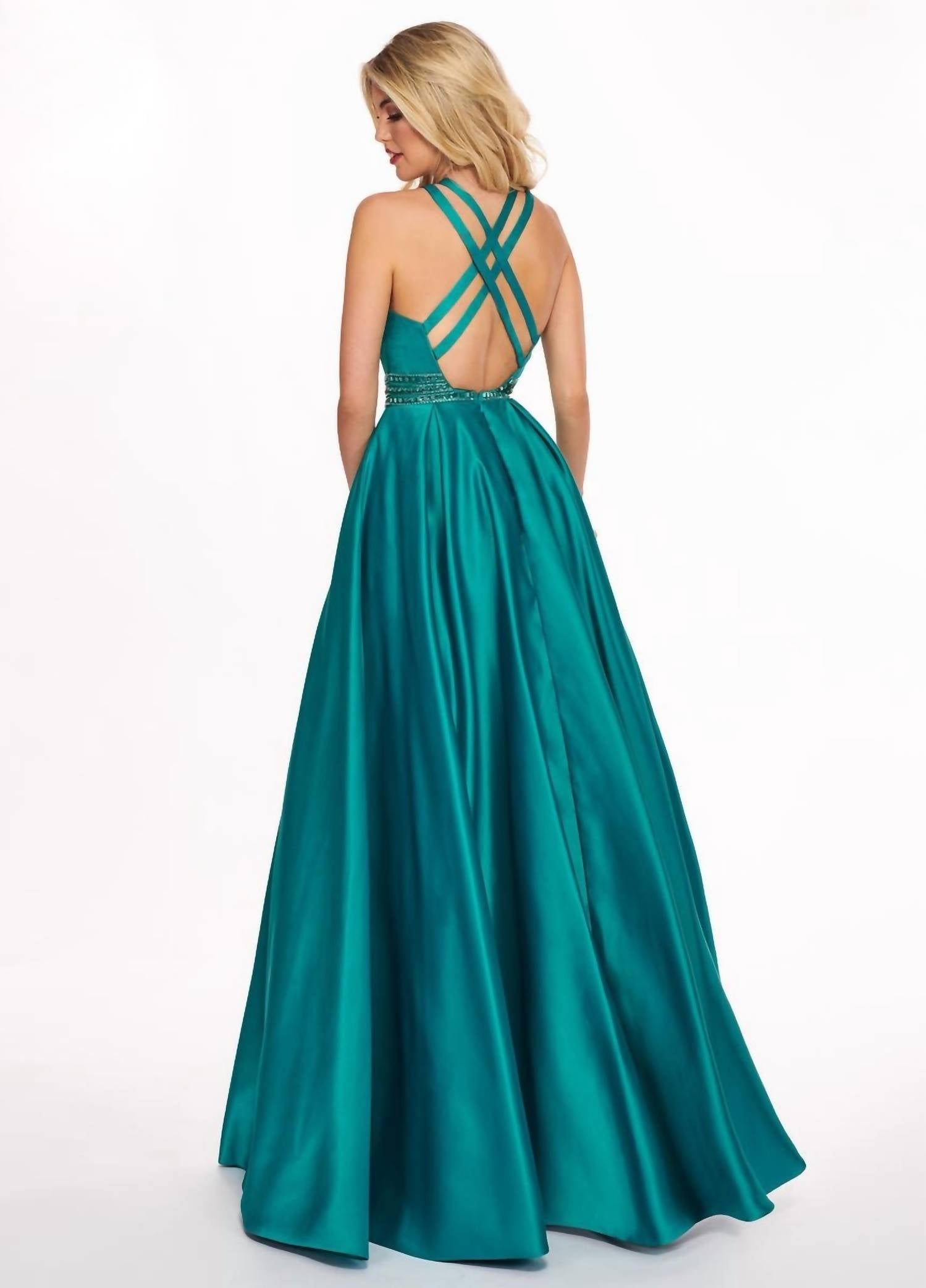 Turn heads in the cutest and most flattering evening dress. Make a statement at prom with the Rachel Allan Matte Satin Halter Neck Prom Gown in royal blue. This sleeveless, standout piece features a halter neckline with a keyhole front, a strappy back, and an embellished waistline, all crafted from luxurious satin. The full-length ball gown skirt is not only elegant but also practical with side pockets. Closure: Zip closure. Perfect for making unforgettable memories, this gown seamlessly combines style and function.