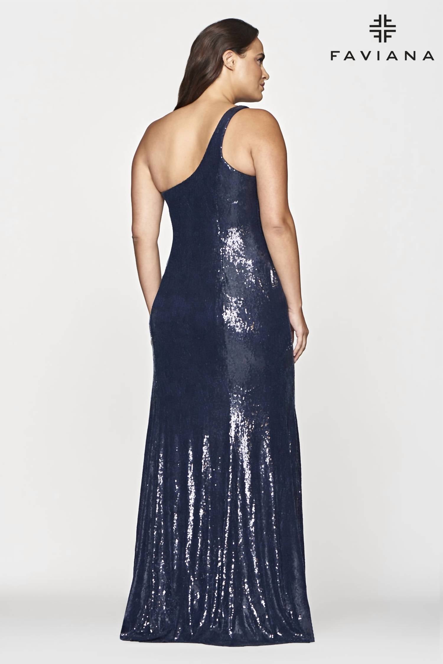 Just add a cute little clutch and a matching heel for the perfect event look. Step into elegance with the Plus One Shoulder Sequin Dress by FAVIANA, a show-stopping piece in a mesmerizing Midnight hue. This sleeveless sheath silhouette features an off-the-shoulder neckline and eye-catching asymmetrical ruching. Meticulously textured with sequins, it offers a luxurious feel and a perfect fit secured by a zip closure. Ideal for prom, this dress promises a striking and sophisticated presence for any formal occasion.