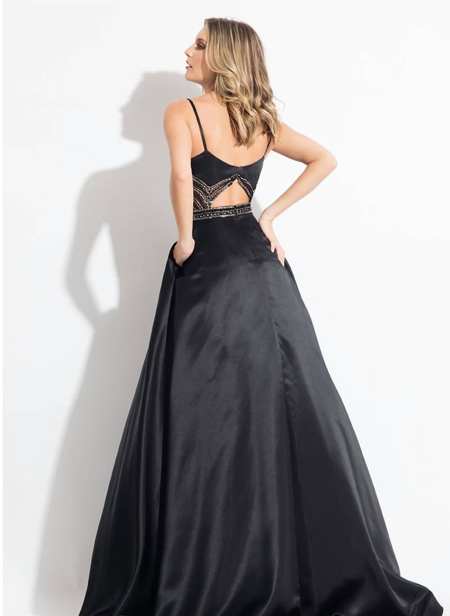 Just add a cute little clutch and a matching heel for the perfect event look. Introducing the Matte Satin Beaded V-neck Prom Gown by RACHEL ALLAN, an enchanting choice for your special occasion. Designed with elegant spaghetti straps and a bead-embroidered bodice, this gown makes a captivating statement with its open back detail. The silhouette is perfectly A-line, crafted from luxurious satin, and includes practical side pockets. Closure: Zip closure. Color: Black. This women's patterned gown, ideal for prom, combines sophistication with ease.