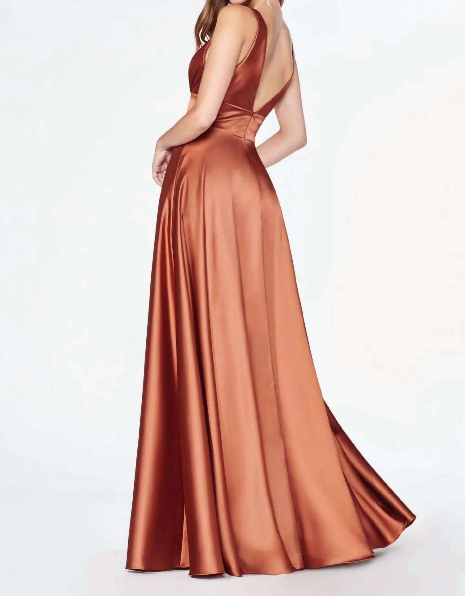 Turn heads in the cutest and most flattering evening dress. The Satin V-neck Dress With Slit by Cinderella Divine is a stunning choice for formal occasions. Crafted from soft satin in a minimalist nude tone, this A-line dress features a deep V-neckline and an empire waistline that flatters many body types. It has a sleeveless design and a fitted bodice that transitions seamlessly into a gracefully gathered skirt, making it ideal for bridesmaids or wedding guests. Closure: Zip closure.