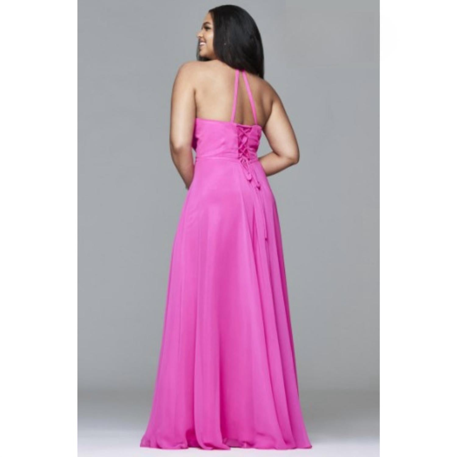Looking for that perfect event dress? Look no further... Introducing the Dakota Gown by FAVIANA, an embodiment of understated luxury in a striking hot pink hue. This sleeveless dress features a deep V-neckline with a sheer insert, and elegant thin straps, complemented by a corset-style tie closure at the back. Its A-line silhouette gracefully cascades to the floor, with a leg slit adding a touch of drama to its solid pattern. Ideal for prom and other formal events, this gown promises to make a statement with its quietly luxurious design.