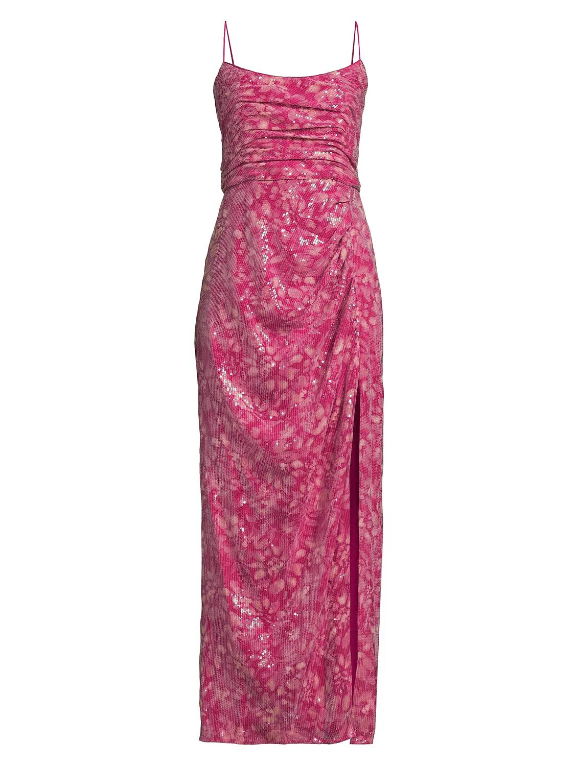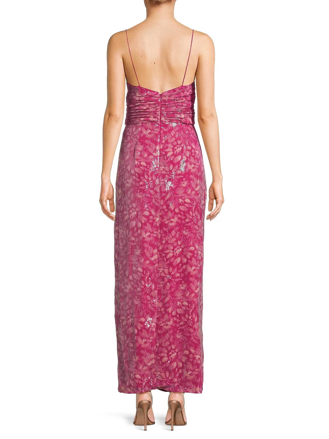 Just add a cute little clutch and a matching heel for the perfect event look. Step into elegance with Hutch's Luxe Gown, a stunning choice for any formal occasion. This fuchsia Shibori floral gown features sleeveless spaghetti straps, beautifully crafted with draping that adds a touch of drama to its silhouette. Made from 100% polyester, the dress boasts an iridescent sequin finish for a sparkling nuance, all while ensuring comfort with its self-lining. Closure: Back-zip closure. Care: Dry clean. Imported and designed for a flattering fit with a garment length of 59 inches.