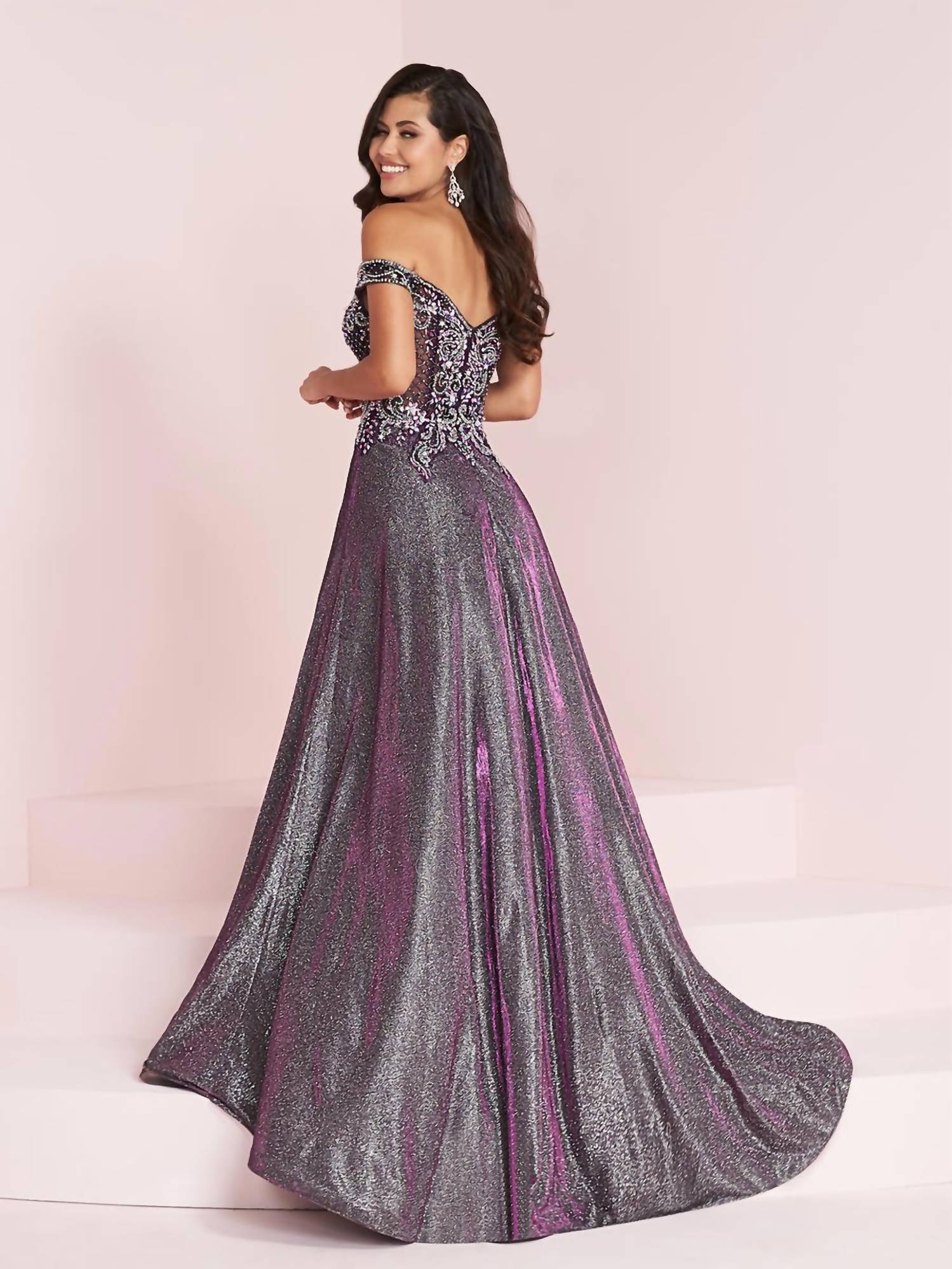 Looking for that perfect event dress? Look no further... The Women's Beaded Off Shoulder Shimmer Gown by Panoply is a show-stopping choice for prom with its elegant A-line silhouette and V-neckline. This sleeveless gown in a textured purple silver hue is designed to make a statement. Closure: Featuring a secure zip closure. Perfect for a maximalist approach, this gown captures the essence of spring occasions with its luxurious off-the-shoulder design.