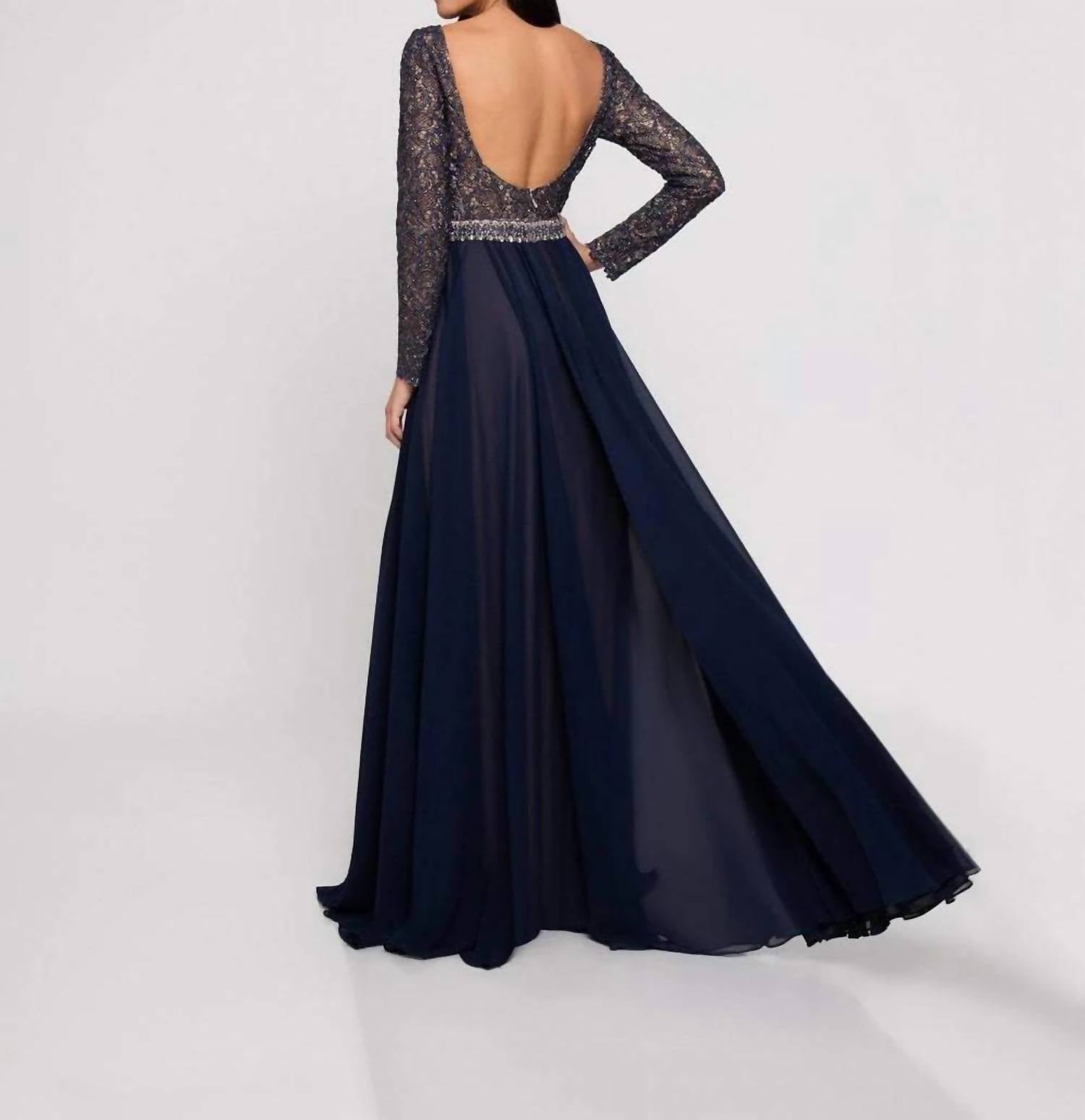 Just add a cute little clutch and a matching heel for the perfect event look. Introducing the exquisite Terani Couture Lace Long Sleeved A-line Gown, a stunning choice for any prom or New Year's Eve celebration. The gown boasts long sleeves, a delightful illusion bateau neckline, and a flowy A-line silhouette accentuated by a low scooped back and an embellished waistline. Crafted from luxurious lace in an elegant navy hue, this gown exudes quiet luxury. Closure: Zip closure.