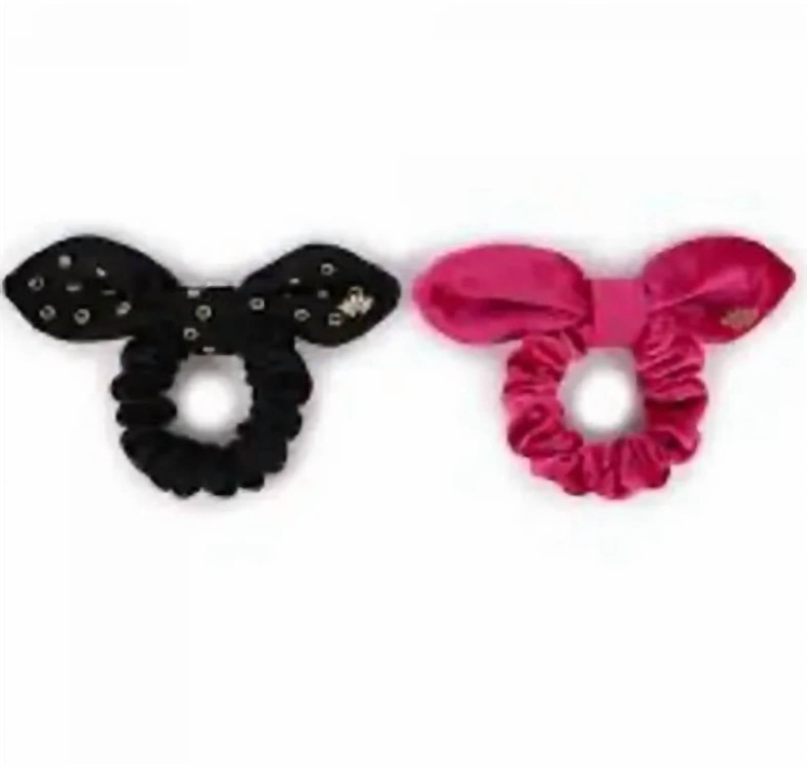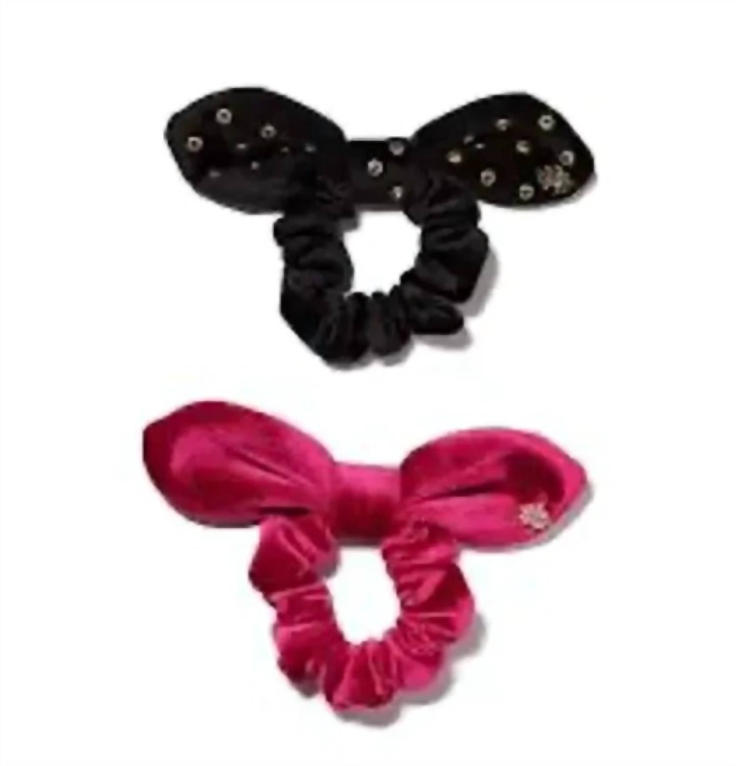 Set of two scrunchies in jet black and fuchsia embellished velvet. Stylish enough to wear as a wrist bracelet, each features the signature logo.