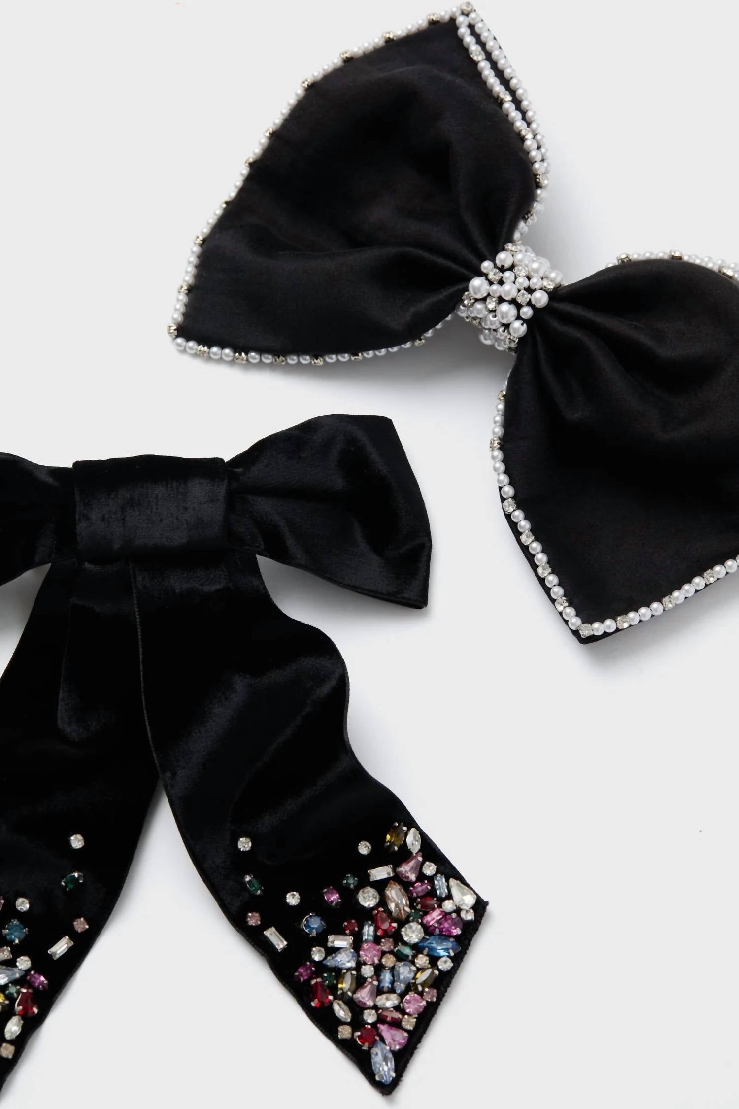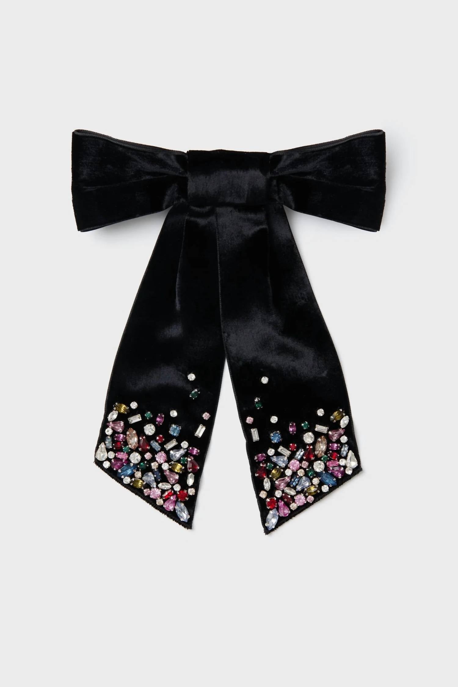 This elegant hair accessory showcases a classic black velvet bow silhouette adorned with clusters of irregularly shaped crystals. Crafted from velvet, imitation rhodium plated brass, and cotton thread embroidery, it adds a festive, feminine touch to creamy silks and cozy knits.