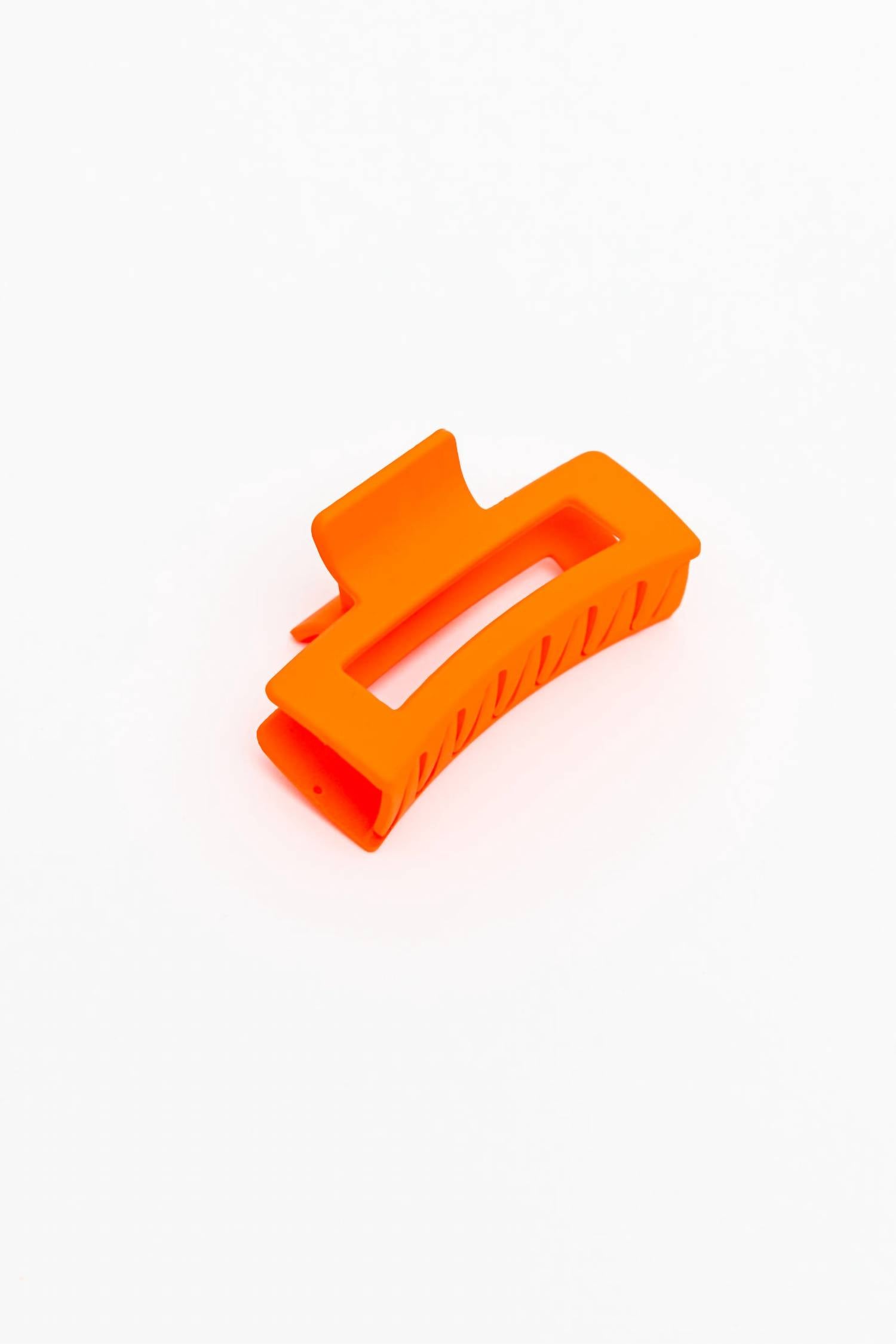 Claw Clip set of 4. Citrusy orange. Four stylish clips is designed to elevate your everyday look with minimal effort. Featuring a variety of sizes, from a large 4.5” twist clip to smaller rectangular clips measuring 4”, 3.5”, and 2”. Each clip boasts a hinged metal closure and interlocking claws to ensure a secure hold.