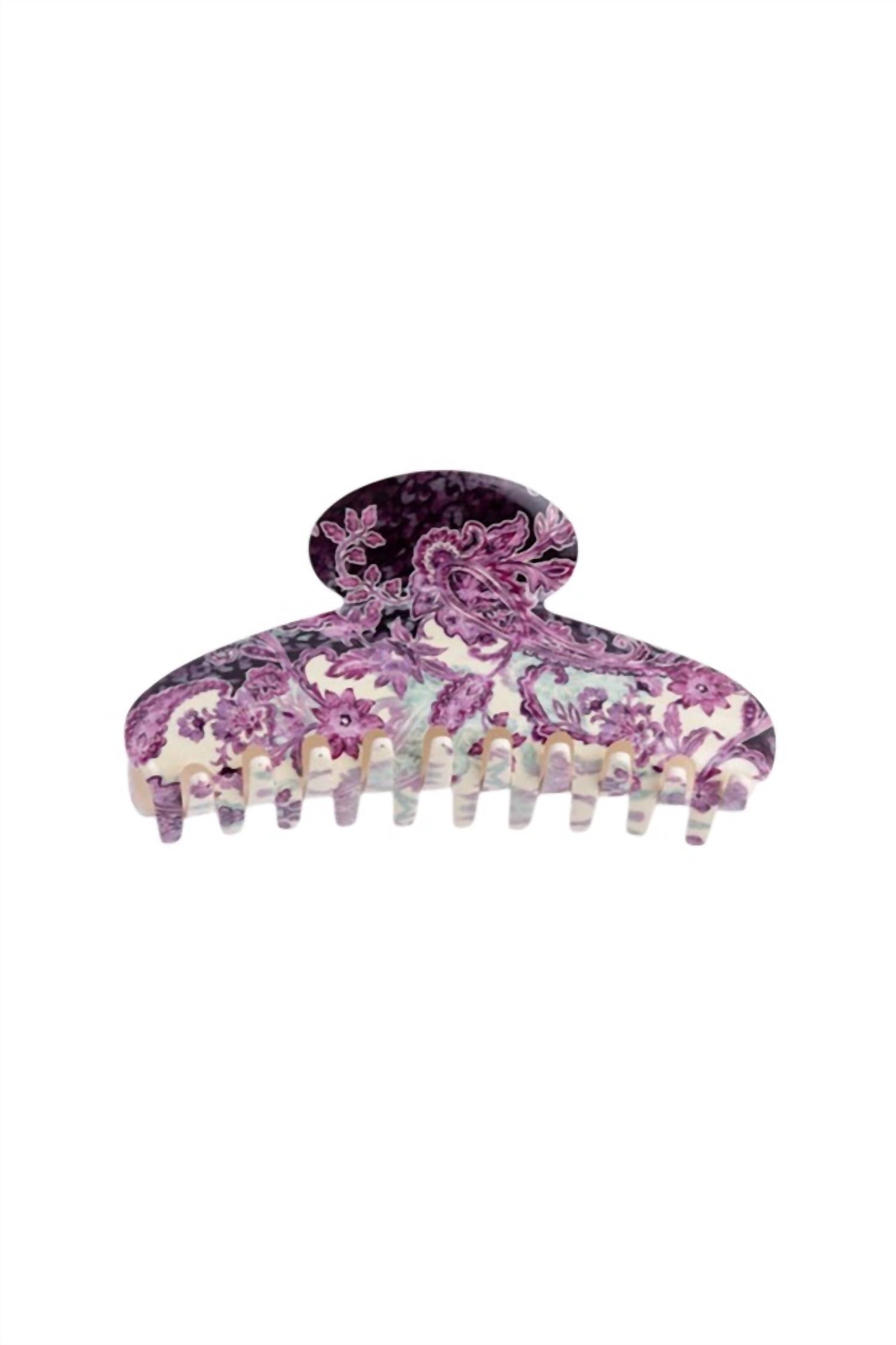 The Women's Anzio Hairclip by Johnny Was in deep purple brings a touch of elegance to everyday hairstyles. Crafted from 100% Cellulose Acetate, this accessory showcases bold floral and paisley designs. Measuring 2 1/4" L x 4 7/8" W, it's perfect for securing a variety of hairdos, adding both functionality and a glossy finish to your look.