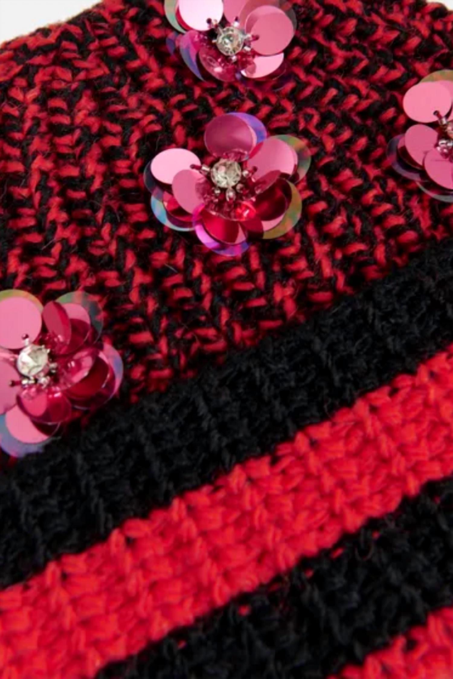 Not only will this hat get you tons of compliments, but it will also keep the sun out of your face which is a must! Wear it with any outfit for the perfect finishing touch. Discover the Ishadow Embroidered Knit Hat by ESSENTIEL ANTWERP, a chic accessory in an eye-catching Poppy Field hue. This ribbed beanie is crafted from a 50% wool and 50% acrylic blend, providing excellent insulation and a lightweight knit. Adorned with flower-shaped sequin embellishments and glass rhinestones, it features a contrast striped fold-over brim for added style. Perfect for adding a touch of elegance to any ensemble.