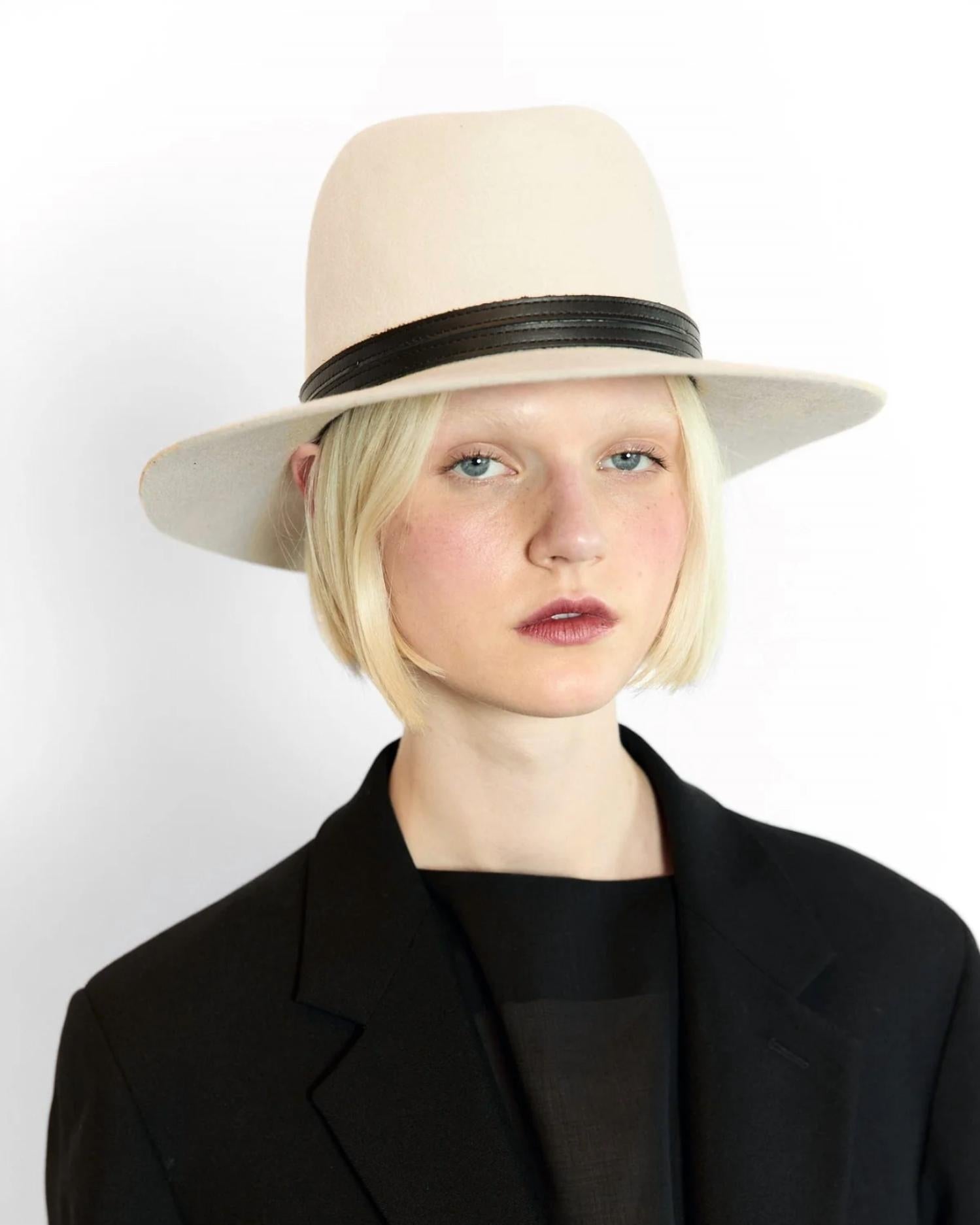 Elevate your accessory collection with the Women's Corinne Hat by Janessa Leone, crafted in a fog hue for a touch of sophistication. This 100% wool fedora features a 3-inch brim and a 4.75-inch crown, offering a classic silhouette enhanced by a 3/8-inch double-stacked regenerative leather band. The refined silver buckle closure adds a contemporary edge to its timeless design. This hat is a perfect blend of sustainable craftsmanship and effortless elegance.