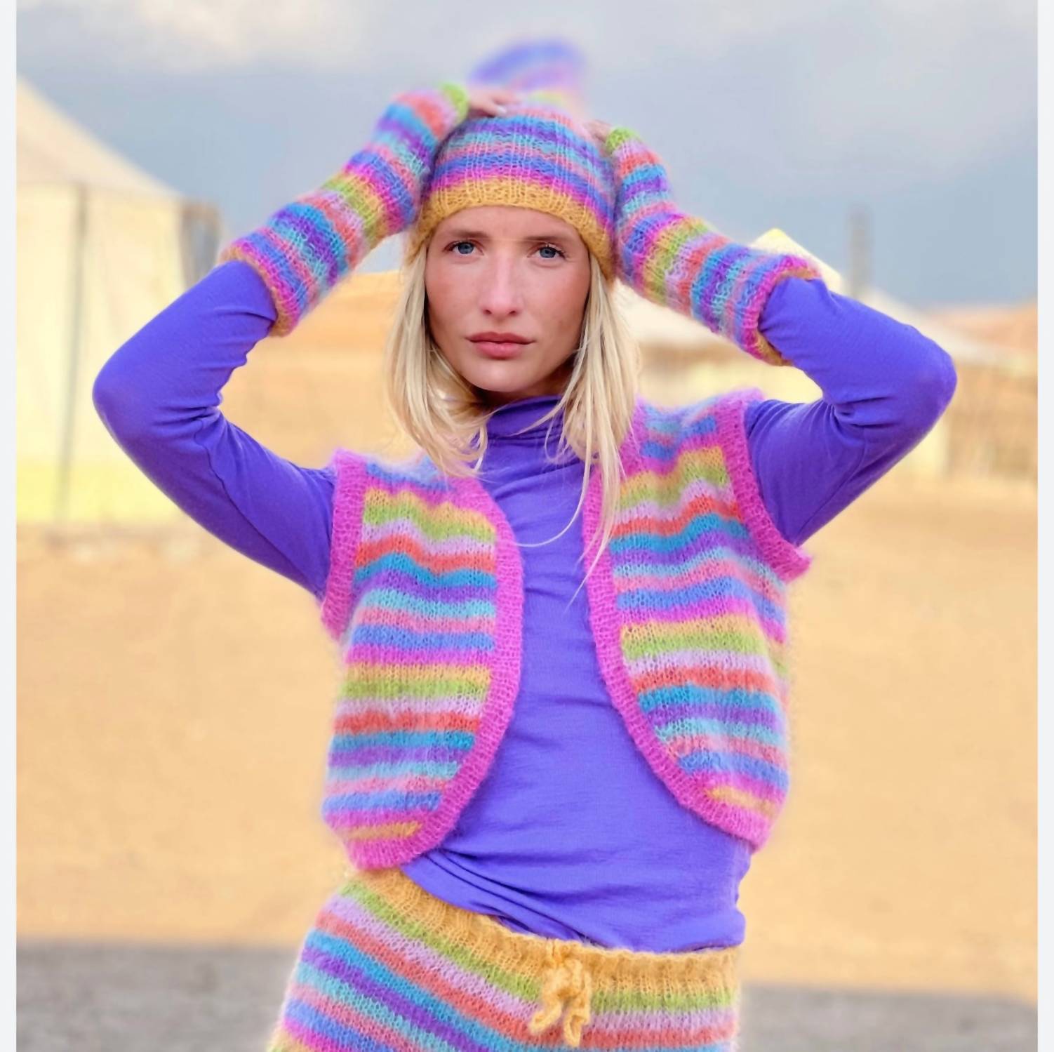 Not only will this hat get you tons of compliments, but it will also keep the sun out of your face which is a must! Wear it with any outfit for the perfect finishing touch. The Baby Mohair Striped Hat by Rose Carmine is a delightful accessory in a soft pastel hue that adds a cheerful touch to any outfit. Crafted from a luxurious wool blend (75% Mohair/20% Wool/5% Polyamide), this hat provides warmth and style in one sophisticated package. A perfect blend of comfort and elegance, it is an essential addition to your headwear collection.