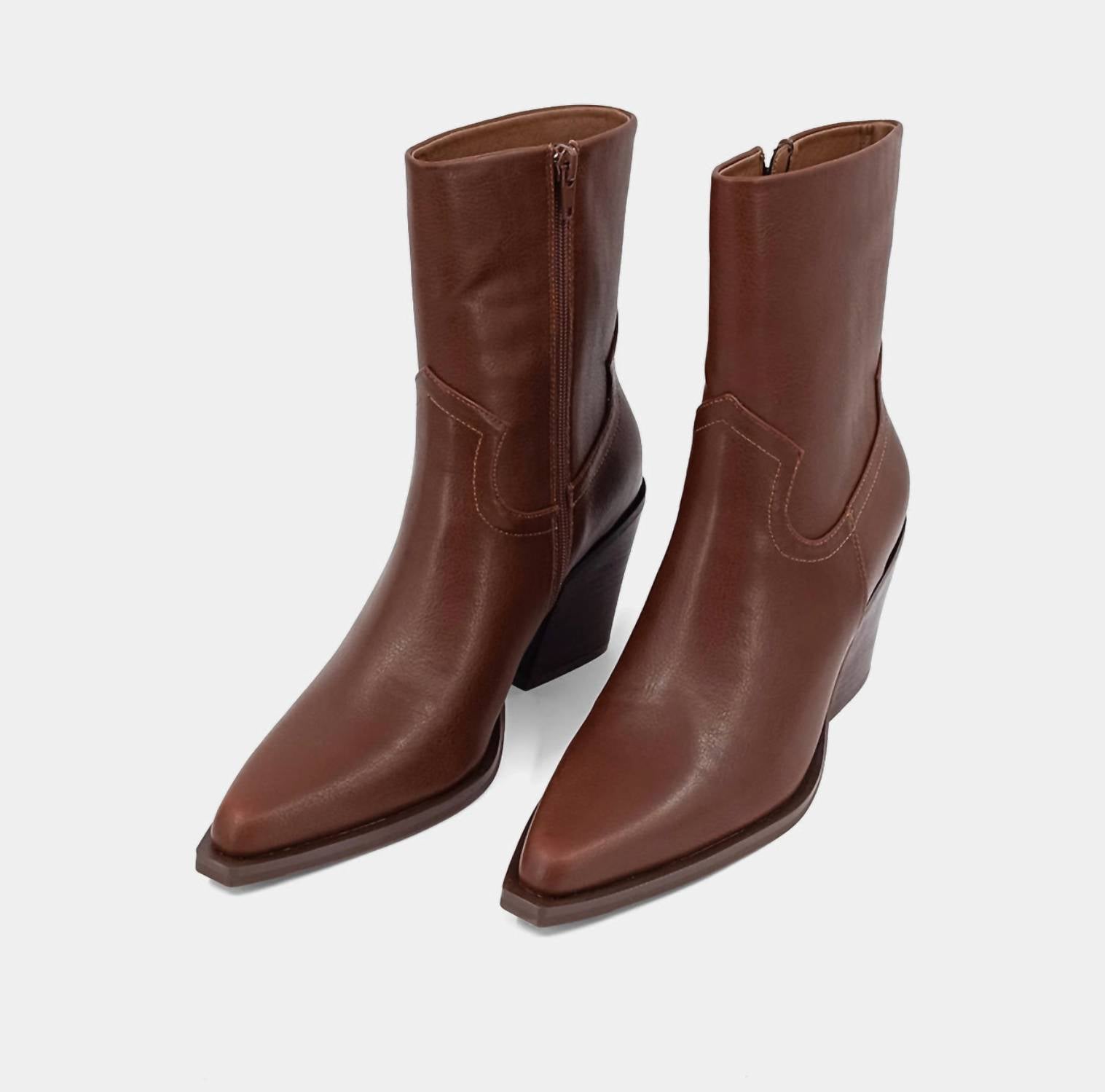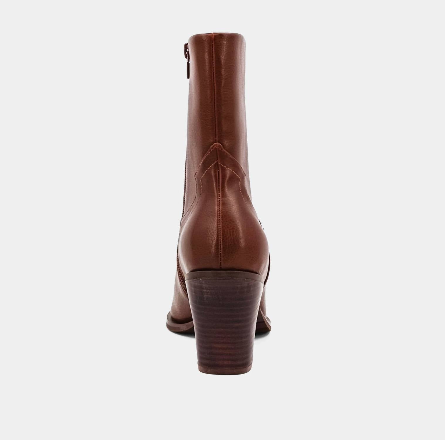Upgrade your shoe game with these classic heeled boots, designed to merge sophistication and style. Comfortable enough for long days or a night out on the town. Introducing the SHU SHOP Women's Victoria Boot, a must-have for the modern minimalist's wardrobe. These heels feature a striking angular block heel with an almond toe shape, perfect for dinner parties. Crafted from premium faux cognac leather, they promise all-day comfort with a cushioned insole and flexible sole. Effortlessly elevate your spring style with this elegant piece.