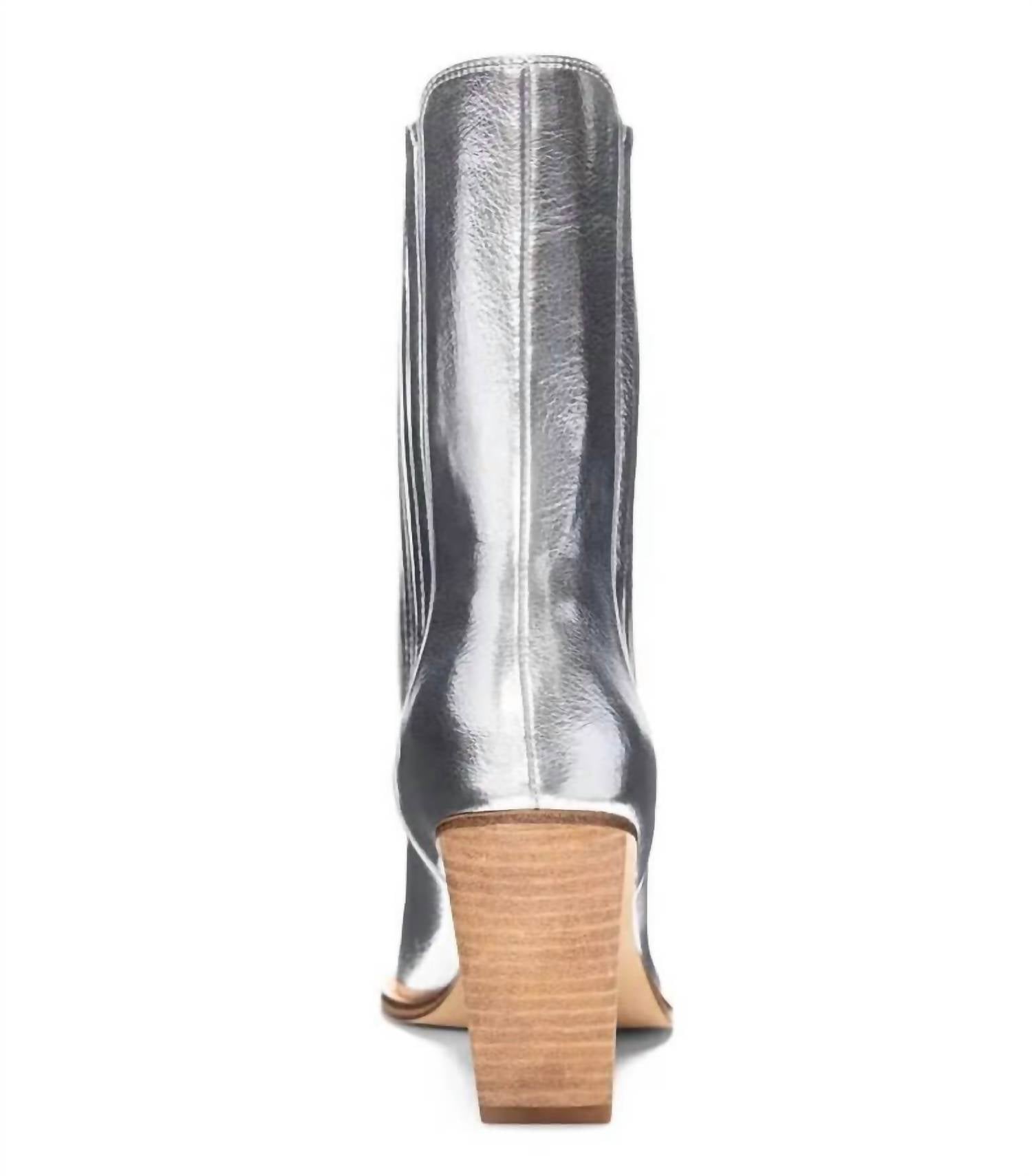 A stylish boot with a comfortable fit and the perfect amount of height. These classic boots are the perfect addition to any outfit and can be worn season after season. Step into style with the Women's Metallic Western Casual Boot by Chinese Laundry, a head-turning piece in shimmering silver. Featuring a pointed toe and a bold 3.25" stacked block heel, these mid-calf boots incorporate stretch panels for a comfortable fit. Made from durable rubber, they are perfect for a true-to-size fit in sizes 6 to 10. Elevate your wardrobe with this western-inspired fashion statement.