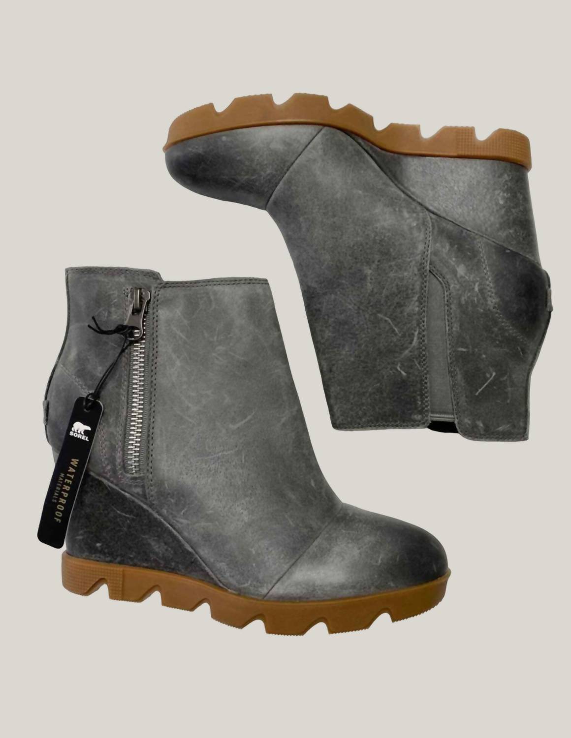 Zip bootie in waterproof full grain leather. Metal zipper on lateral side with gore on medial side for adjustability. Pigskin lining. PU like EVA footbed with pigskin top cover. Molded BPU-ABS wedge with leather wrap. Molded rubber with iconic SOREL scallop design with light texture for increased traction. Heel height: 3 1/2". Platform height: 1/2". Shaft height: 3 3/4". Shaft Circumference: 9 3/4".