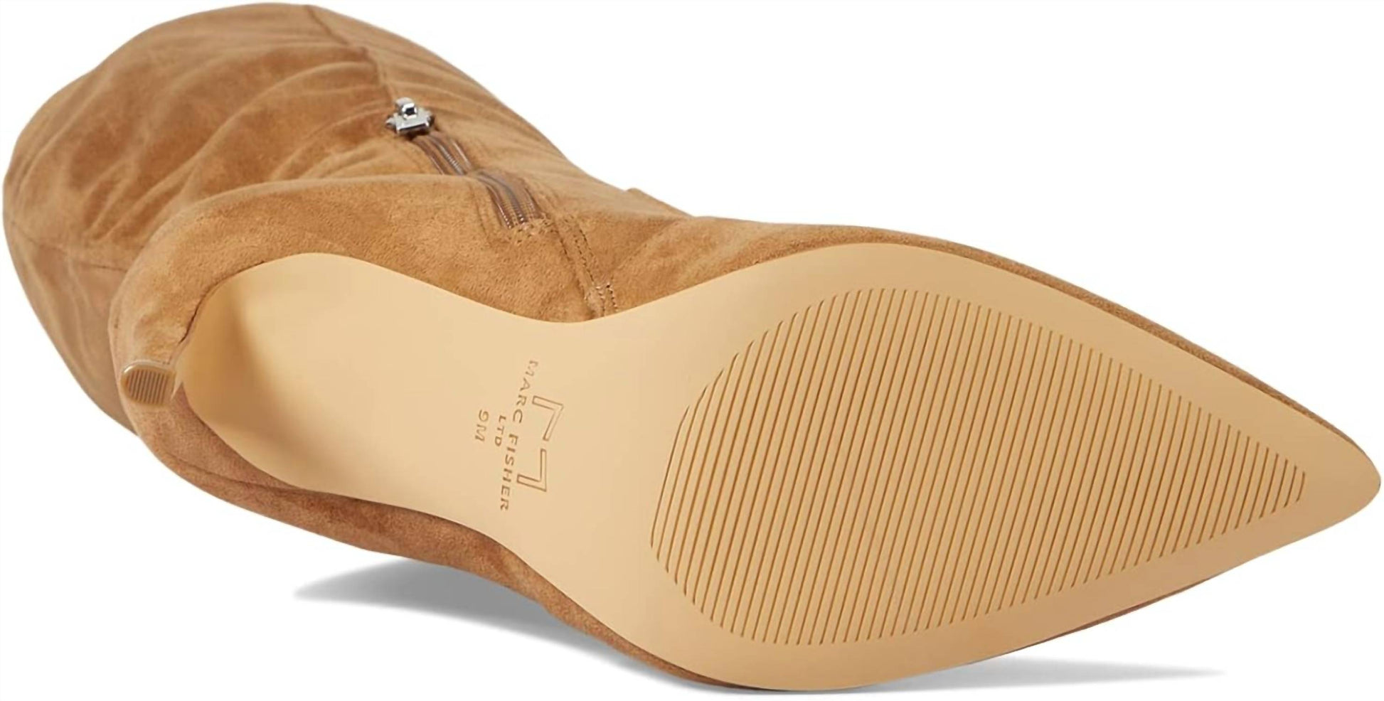 A stylish boot with a comfortable fit and the perfect amount of height. These classic boots are the perfect addition to any outfit and can be worn season after season. Introducing the MARC FISHER Women's Ltd Rumina 3, a sophisticated pair of knee-high heeled boots in Medium Natural. Crafted from faux suede, these boots feature a pointy toe and a stiletto heel with a height of 4.5 inches. They include an inside zipper closure for a secure fit and have a shaft height of 19 inches with a circumference of 14 inches. Perfect for evening events, these boots embody quiet luxury, making them an ideal choice for the fall season.