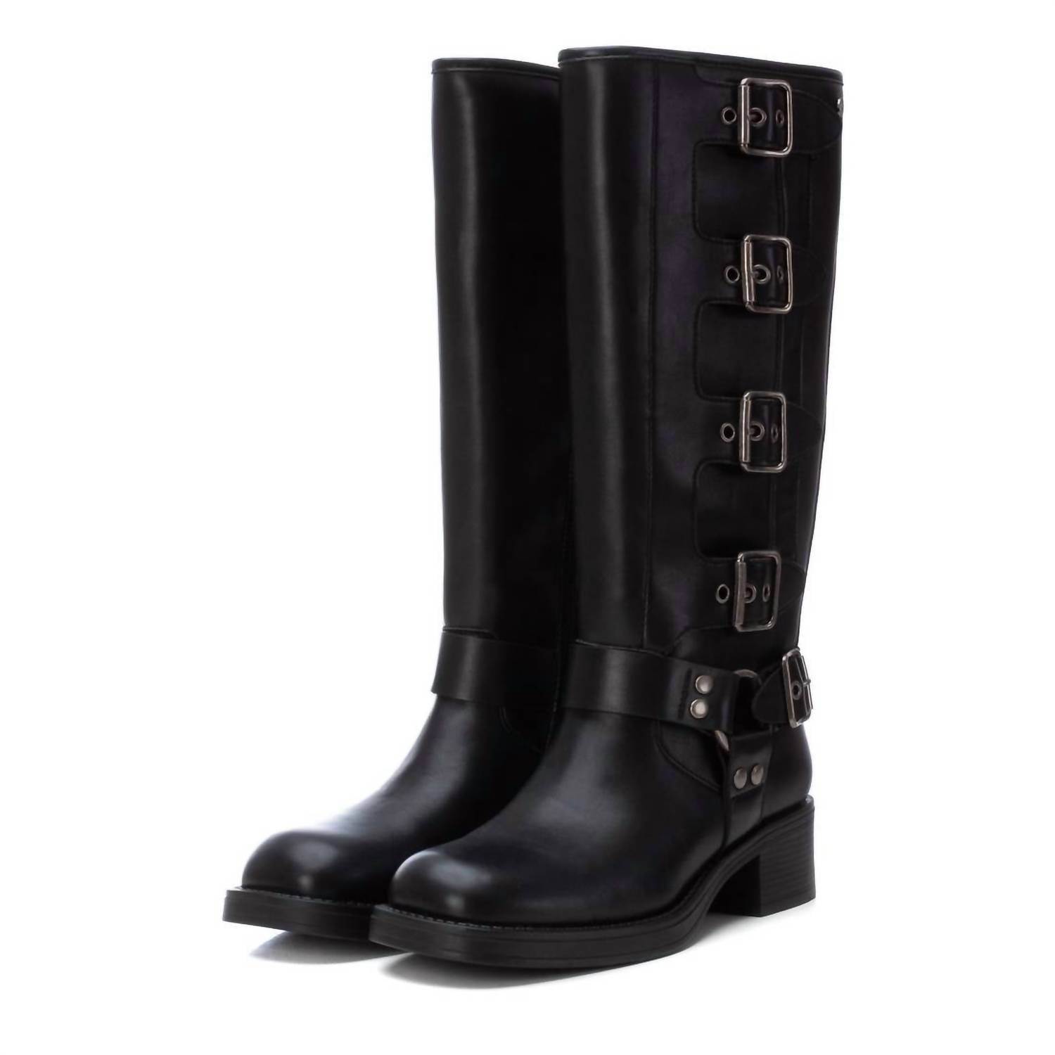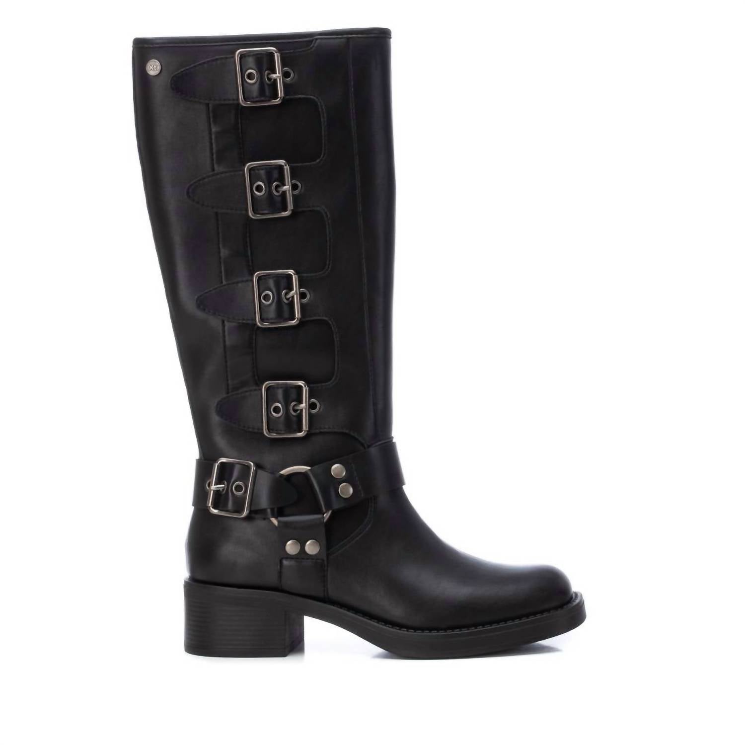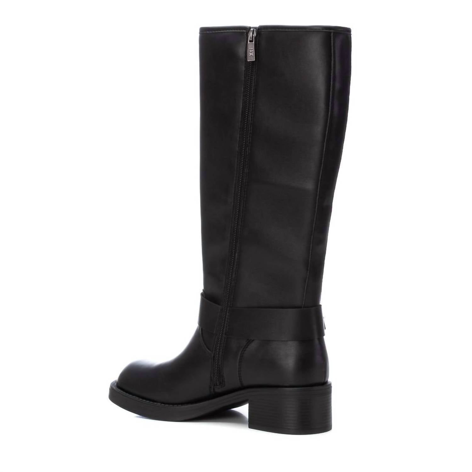 Step out in confidence and showcase your impeccable taste with these fashionable and versatile boots. Their classic style will have you reaching for these boots season after season. Elevate your fashion with the Women's Tall Boots by Xti, crafted in elegant black faux leather. These boots showcase a musketeer style with a high cane and decorative buckles, complemented by a convenient side zip closure. Designed for comfort and style, they feature a 1.96-inch block heel and a non-slip rubber sole. The breathable material and padded insole ensure lasting comfort, making them a certified vegan choice by PETA.
