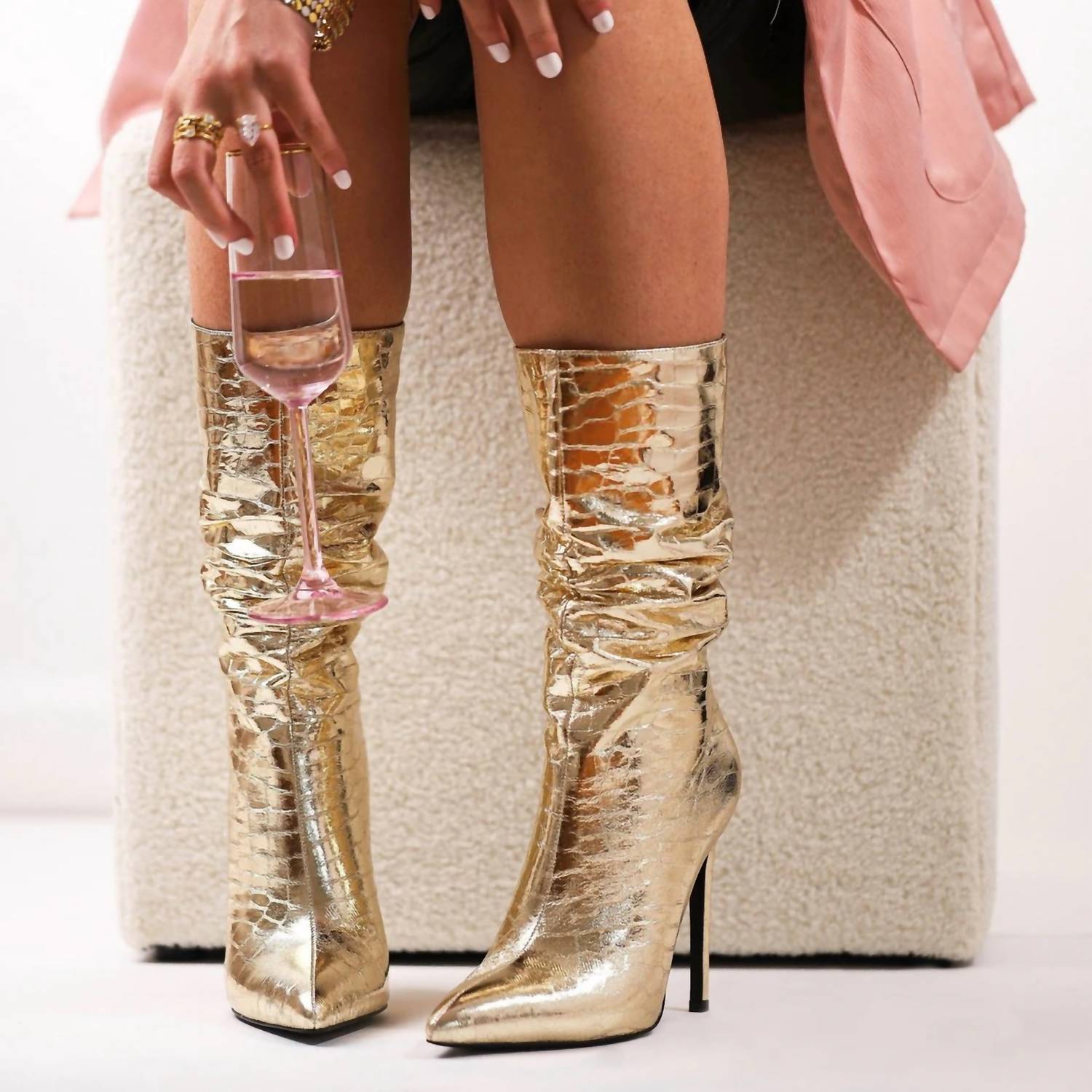 Upgrade your shoe game with these classic heeled boots, designed to merge sophistication and style. Comfortable enough for long days or a night out on the town. Step into luxury with the 90210 Boots by Allison Avery, crafted in a striking metallic snakeskin leather furnish. These gold stiletto-heeled boots feature a mid heel height of 3 inches, coupled with a pointed toe for a sharp, sophisticated look. Ideal for women looking to make a statement, they come with a dust bag and branded shoe box for safe storage.