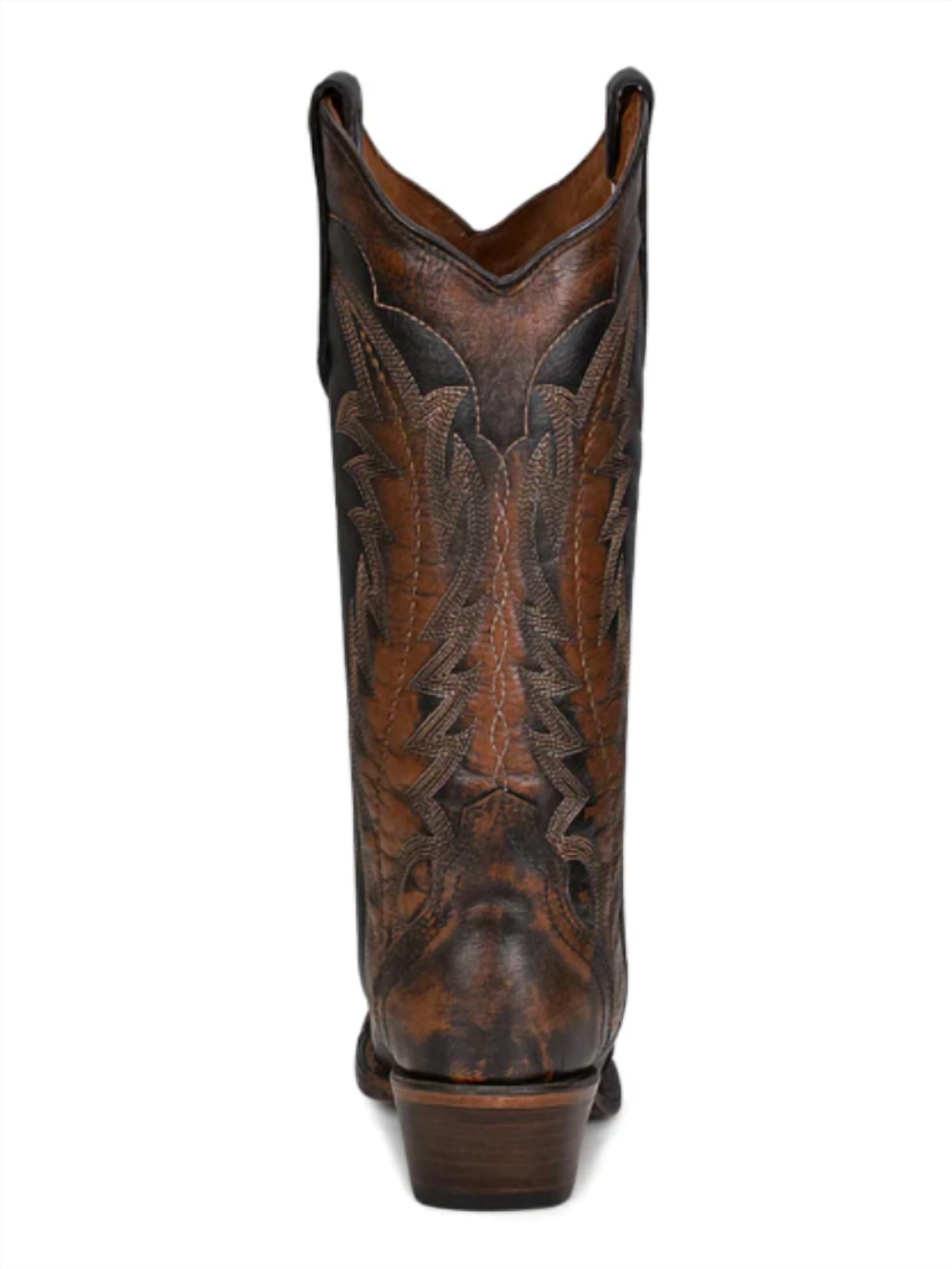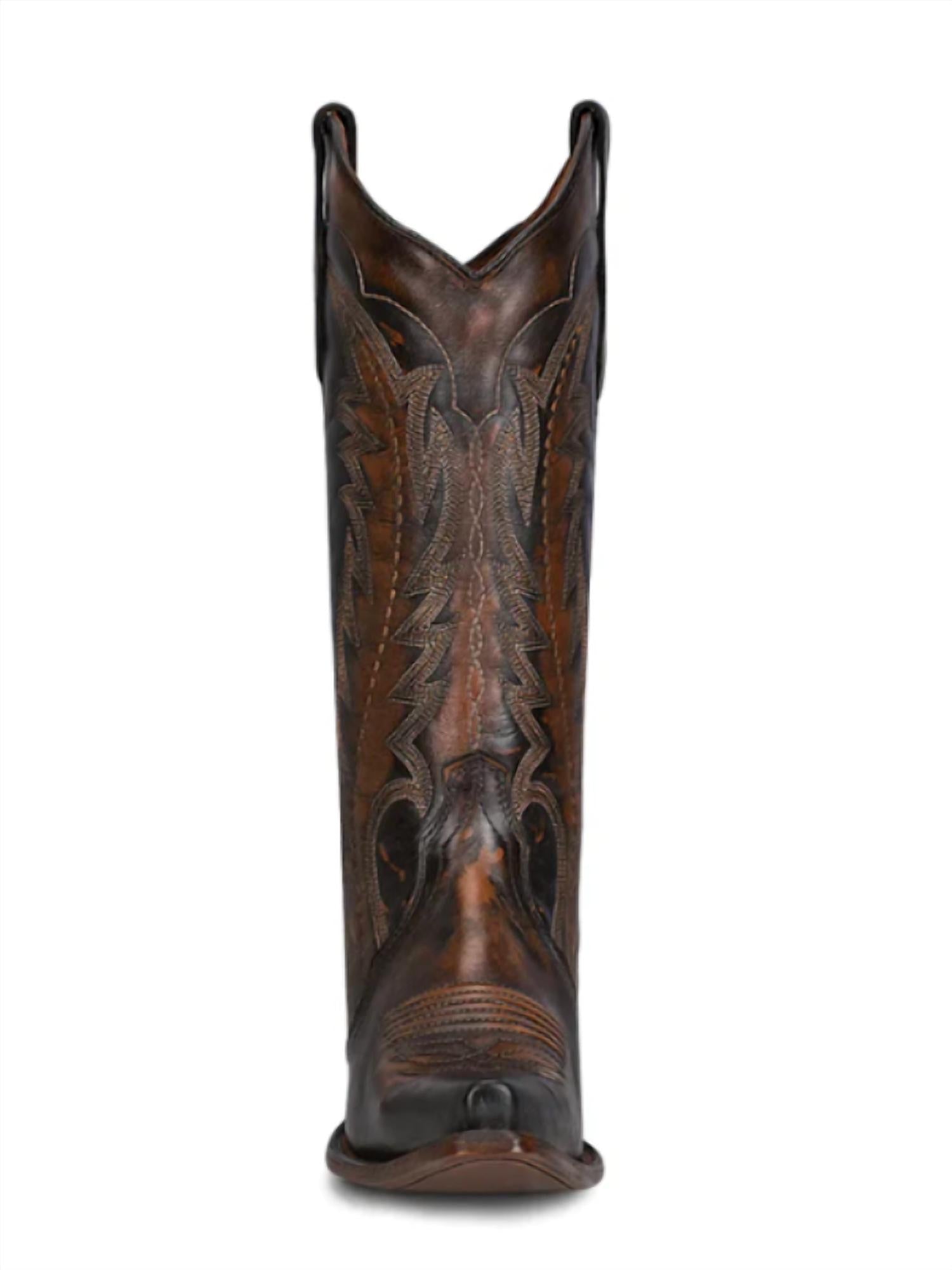 Upgrade your shoe game with these classic heeled boots, designed to merge sophistication and style. Comfortable enough for long days or a night out on the town. The Corral Women's Triad Western Boots blend durability and style with a touch of modern flair. Made from high-quality cowhide leather, they feature intricate feather embroidery and a snip toe design for a classic Western look. The boots have a cushioned insole for all-day comfort, a sturdy leather outsole with a rubber heel cap for traction, and traditional pull tabs for easy wear. With a 13-inch height and a solid dark brown design, these imported boots are both stylish and practical.