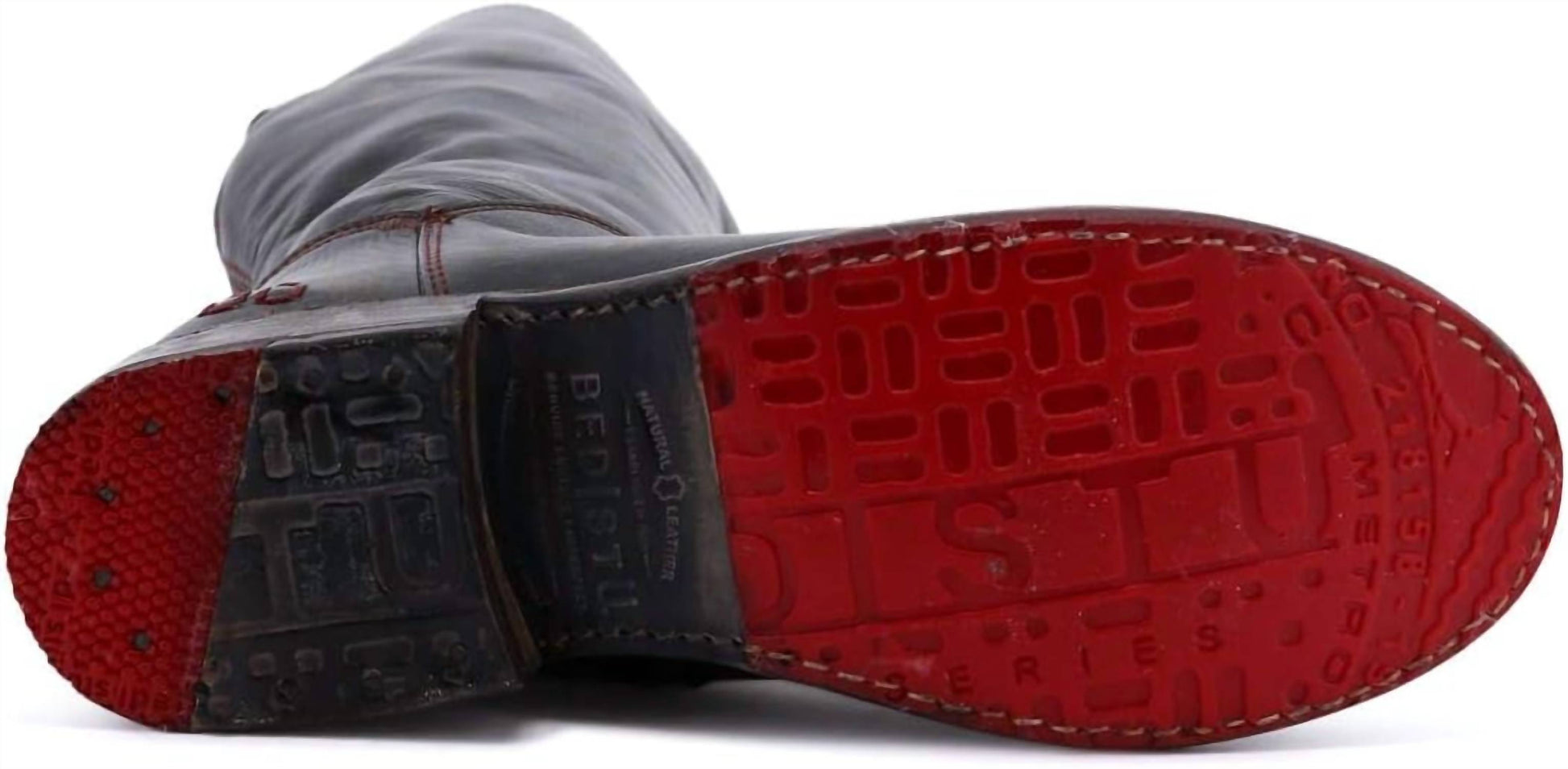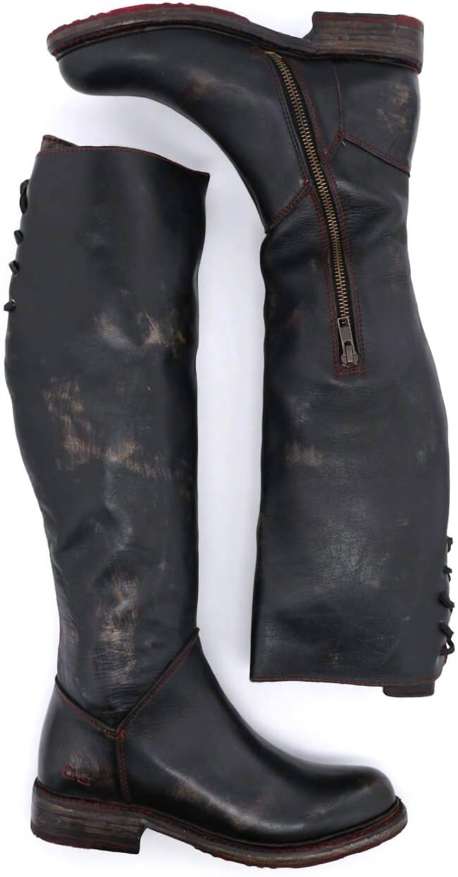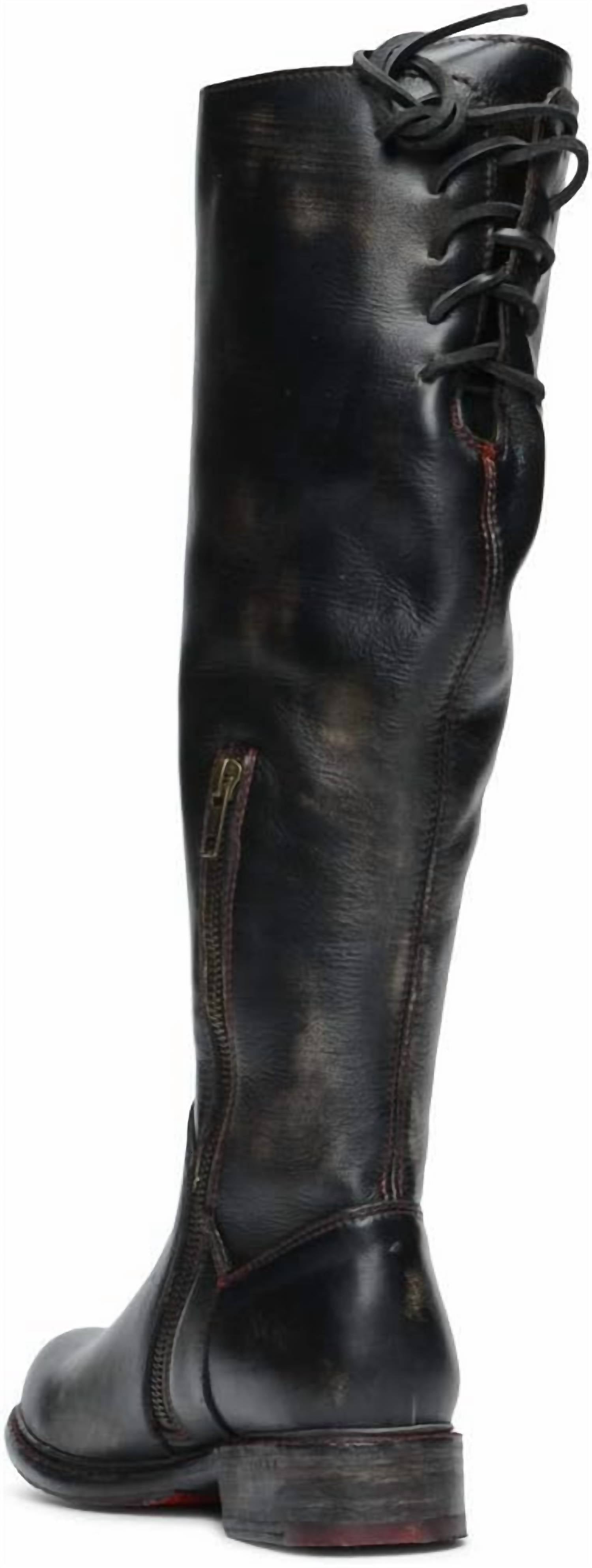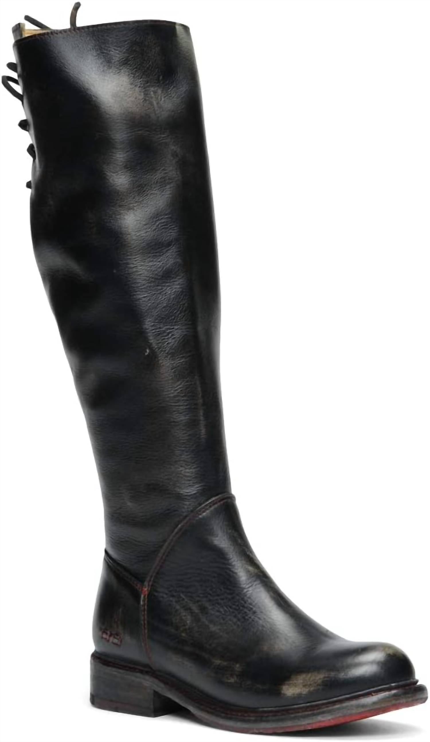 A stylish boot with a comfortable fit and the perfect amount of height. These classic boots are the perfect addition to any outfit and can be worn season after season. MANCHESTER. Modern classic. Tall riding boot. Classic lines. Flat heel. Alluring lacing. Inside zipper. Great fit. Essential. Handmade leather. Handfinished. Round toe. Ankle zipper. Back laces. Goodyear welted sole. 17.5" shaft height. 1.25" heel. 14" circumference. Snug fit. Stretch to shape.