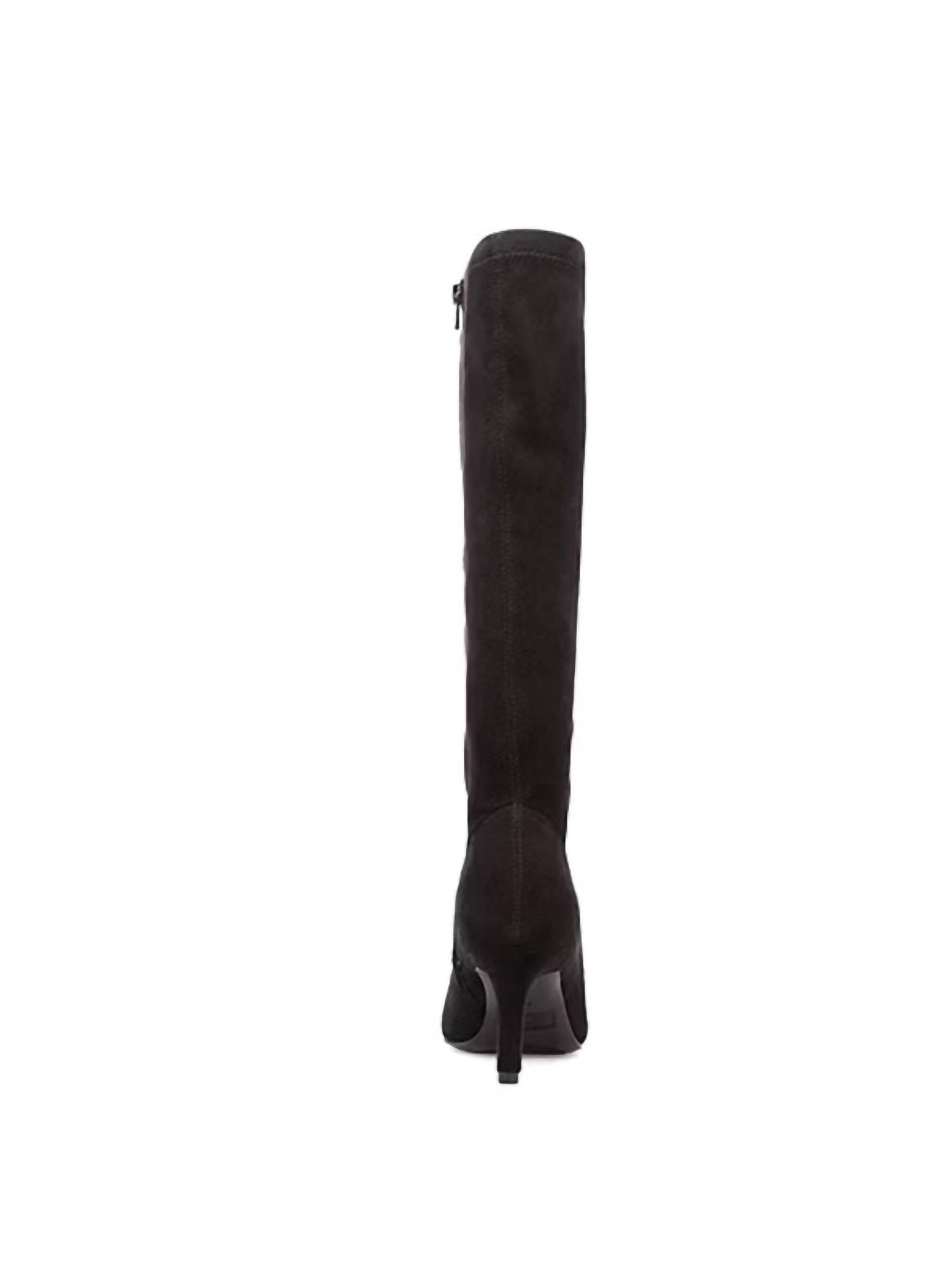 Upgrade your shoe game with these classic heeled boots, designed to merge sophistication and style. Comfortable enough for long days or a night out on the town. Step up your fall fashion with the Women's Virgilie Dress Boots by Mia Shoes. These knee-high boots in classic black boast a chic design with a stretchy faux suede composition and a sultry pointed toe. Set on a stiletto heel with a 2.5-inch height and a shaft height of 14.25 inches, they're perfect for pairing with your favorite skirts. With a regular calf width and closure-free design, these boots blend comfort with luxury, making them ideal for cocktail parties or New Year's Eve celebrations.
