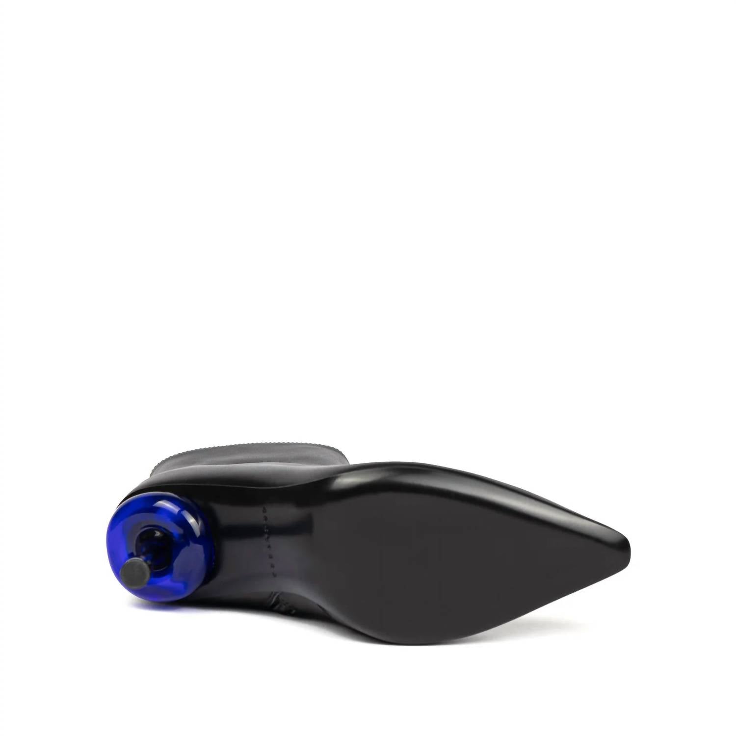 Step out in confidence and showcase your impeccable taste with these fashionable and versatile boots. Their classic style will have you reaching for these boots season after season. Step into elegance with the Osha Nox Hi ankle boots by 4CCCCEES, crafted in sleek Black Nappa. These heeled boots for women feature a pointed toe and contrasting pin-point stiletto heel, making them an ideal choice for formal occasions. A zipper fastening ensures ease of wear, while the metallic chrome and enamel-painted heel paired with an oversized top section add a touch of chic allure. Though not recommended for an athletic calf, these sculptural shoes are perfect for those seeking a refined, artistic look.