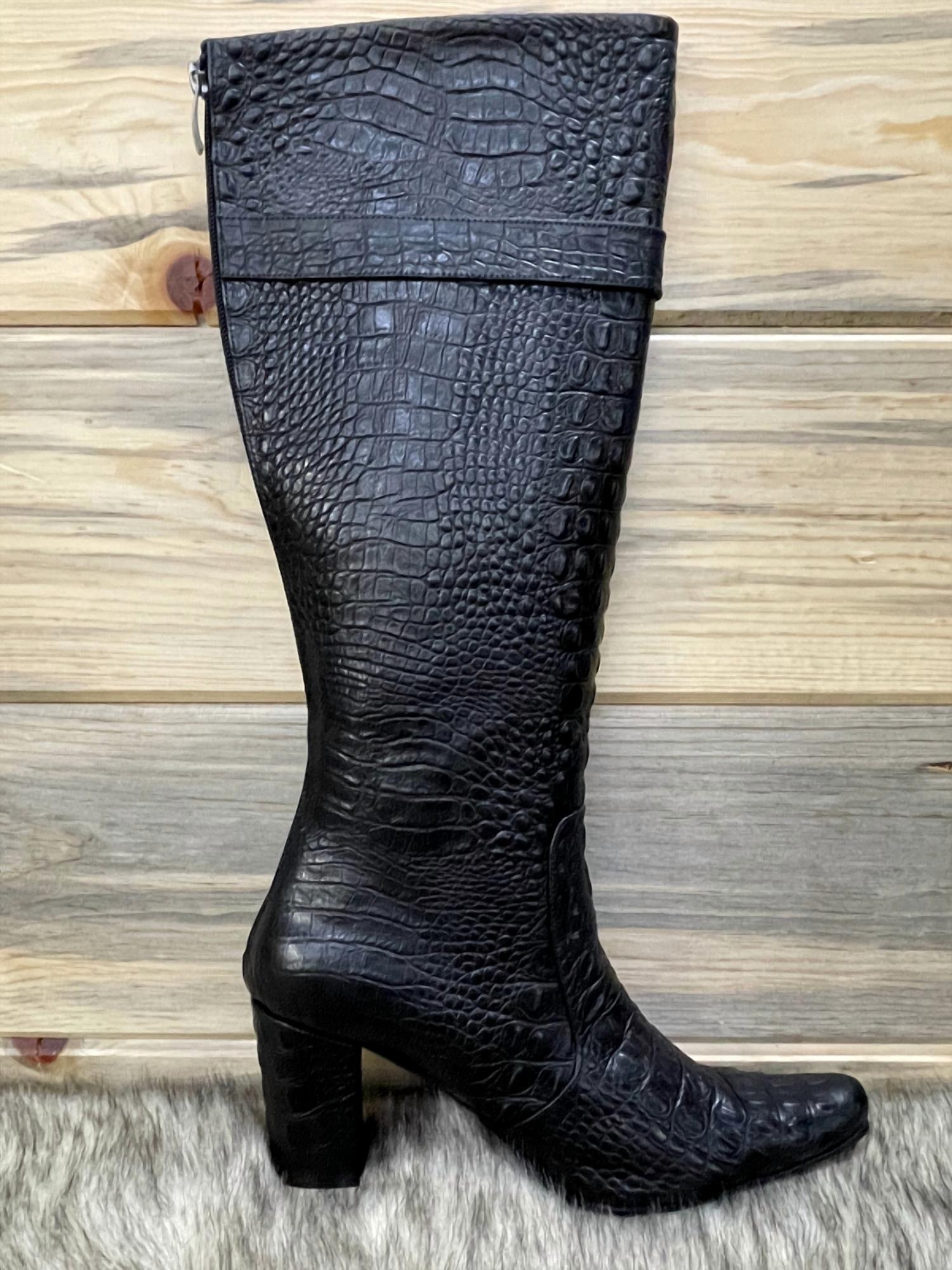 Looking for a Stunning Boot that is Comfortable and Classy? Rockwell Tharp's Manchester Black Knee High Cuban Heel Boot is exactly that! Such Sophistication in this Boot and All Leather with Embossed Design. Size Guide: 38= 7.5 - 8 US. 40= 9.5 -10 US