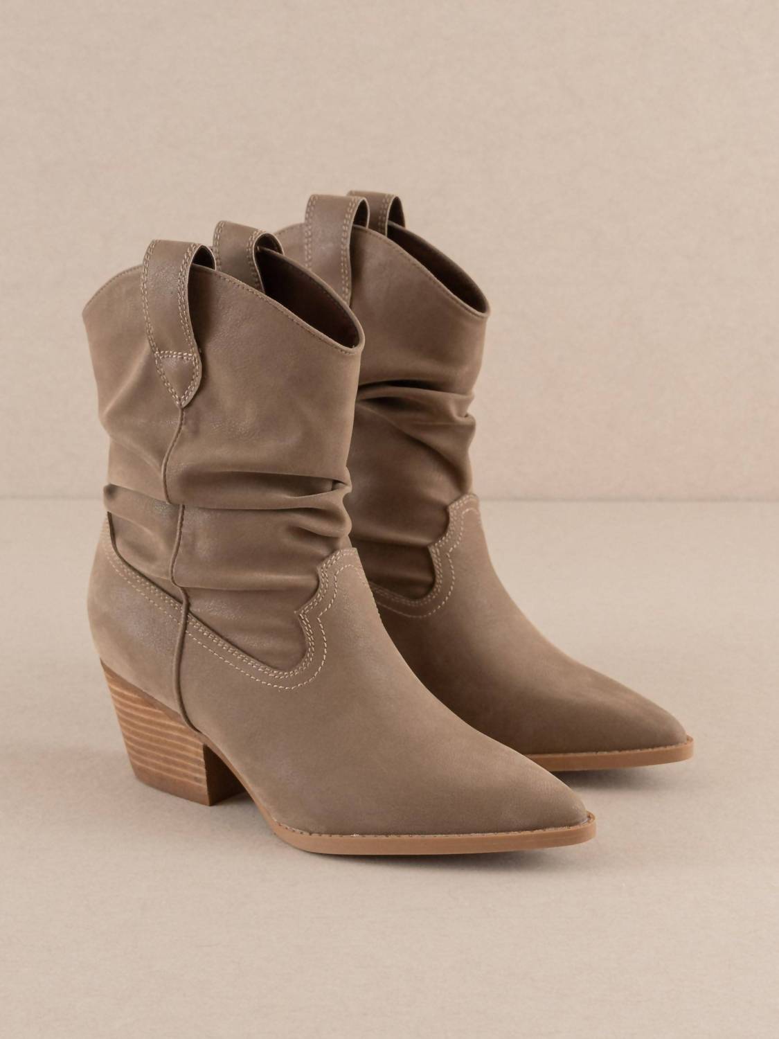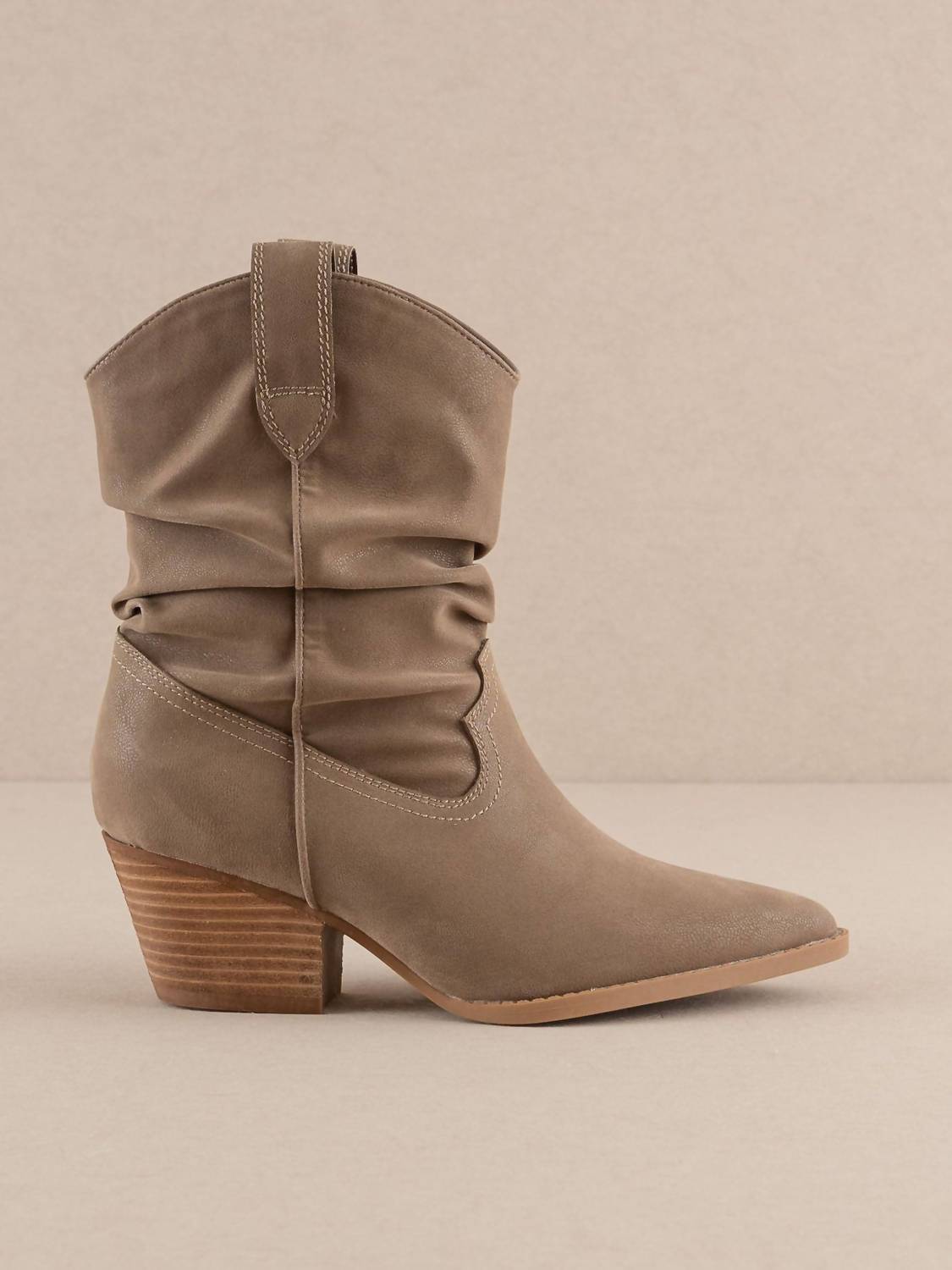 Step out in confidence and showcase your impeccable taste with these fashionable and versatile boots. Their classic style will have you reaching for these boots season after season. Elevate your footwear collection with the Women's Kit Slouchy Western Bootie by OASIS SOCIETY, offering both style and comfort in a dark taupe hue. Crafted with a vegan leather upper and a DreamCloud cushion insole, these booties are designed for all-day wear with a chic pointed toe. The block heel measures 2 inches, providing a stable yet fashionable lift, while the slip-on closure ensures easy wear. With an 8.25-inch shaft height and a 13.75-inch shaft circumference, these boots beautifully complement any ensemble.