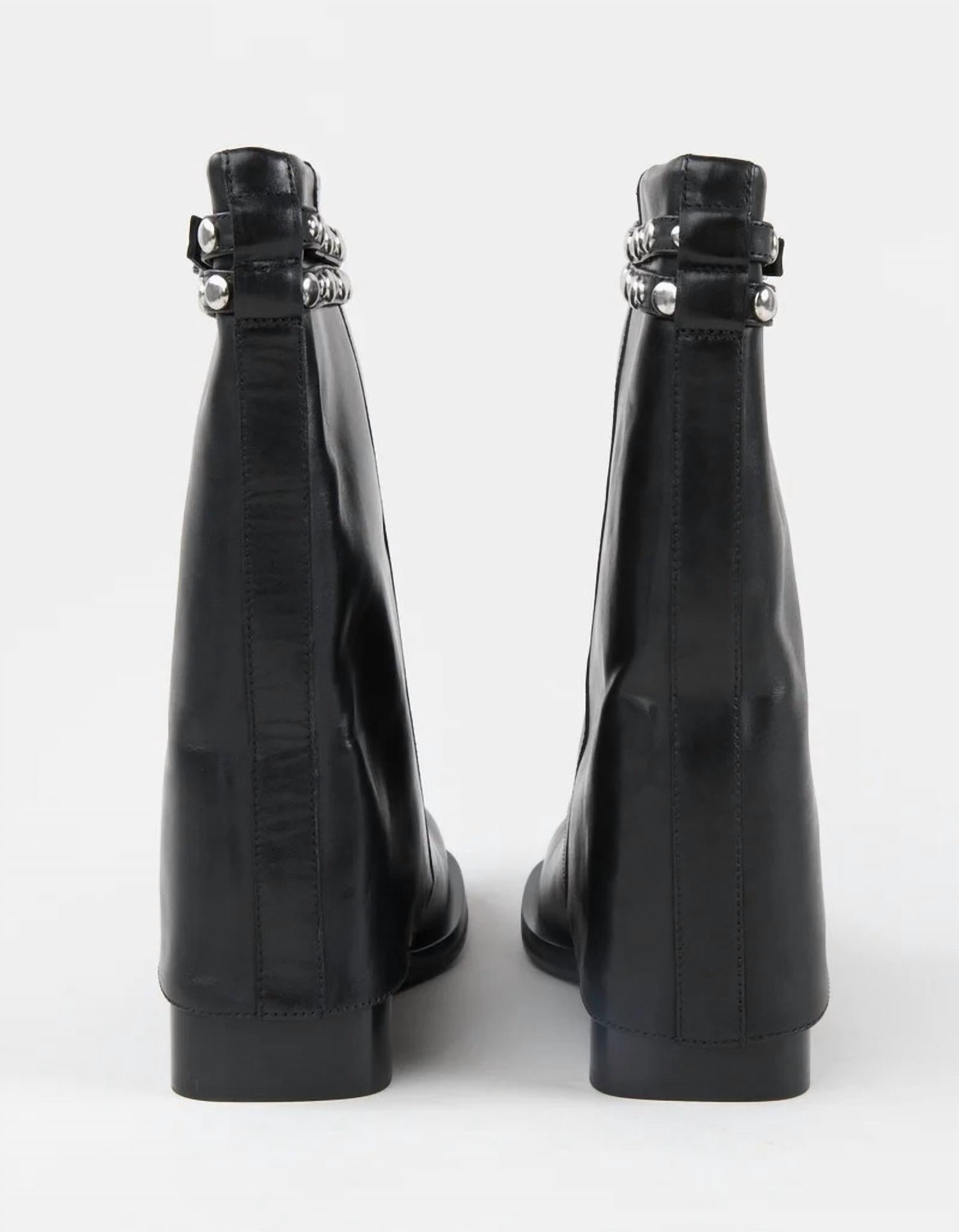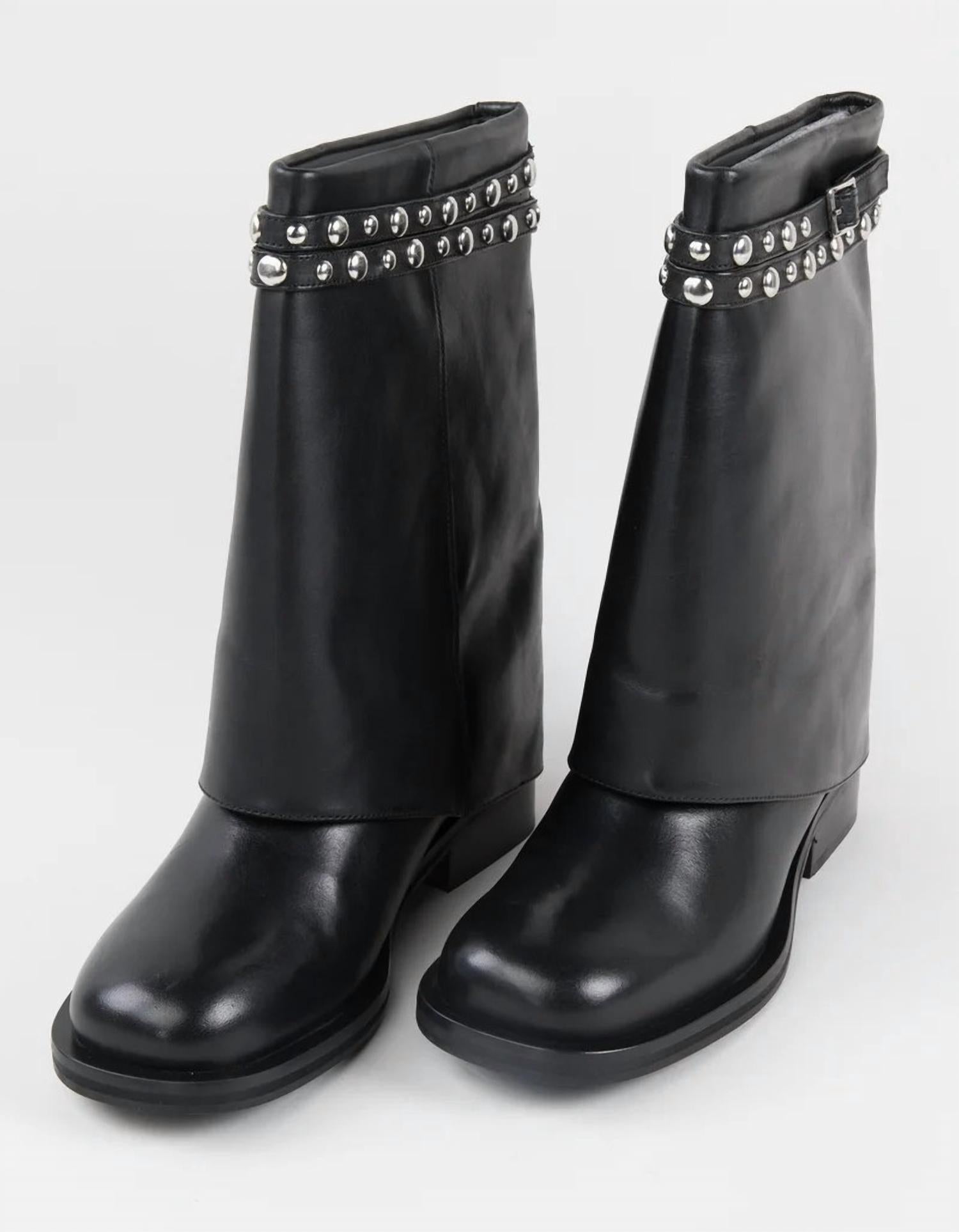 Upgrade your shoe game with these classic heeled boots, designed to merge sophistication and style. Comfortable enough for long days or a night out on the town. Step into style with the Women's Scorpio Studded Foldover Boots by Free People, perfect for your holiday parties this fall. These mid-calf height boots in classic black are crafted from soft leather with a chic western-inspired design. Featuring stylish studded straps with adjustable buckle detailing, they offer a pull-on style and a minimal block heel for comfort. Composition includes leather and rubber, with an imported origin. Heel height: 1.5 inches.