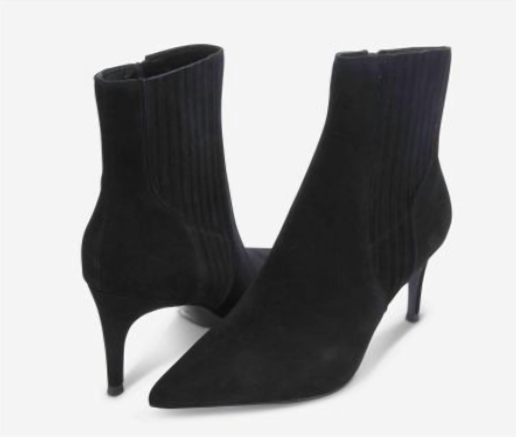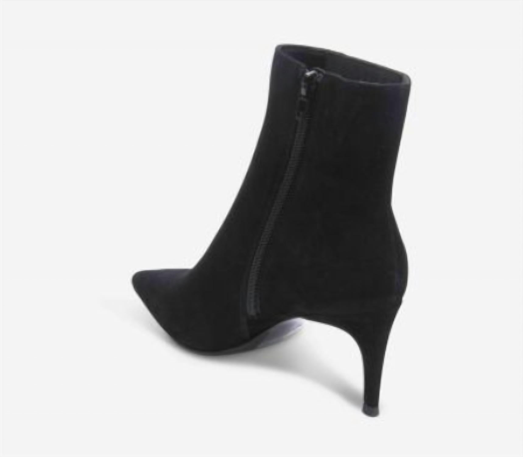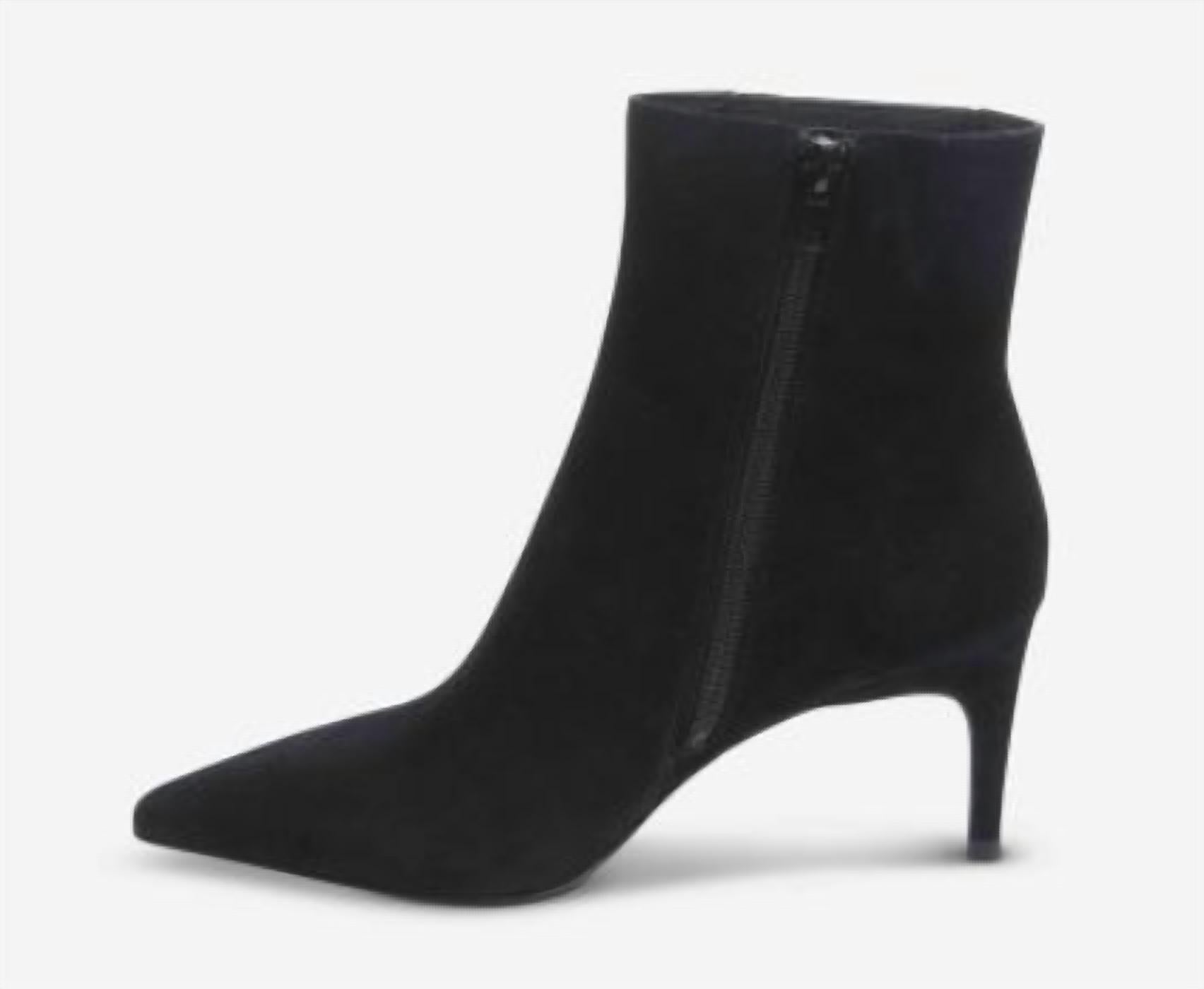 Step out in confidence and showcase your impeccable taste with these fashionable and versatile boots. Their classic style will have you reaching for these boots season after season. Step into elegance with the Women's Dearan Point-toe Suede Ankle Boot by VANELi, crafted in classic black. This chic ankle boot features a pointed toe and a 3-inch covered stiletto heel for a sophisticated silhouette. Designed with a convenient side zip closure, it is perfect for making a stylish impression at dinner parties or New Year's Eve celebrations. Embrace the maximalist trend this fall with a standout addition to your footwear collection.