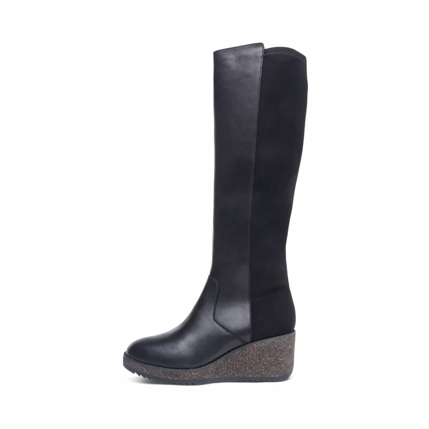 A stylish boot with a comfortable fit and the perfect amount of height. These classic boots are the perfect addition to any outfit and can be worn season after season. Step into style and comfort with the Women's Rose Wedge Boot by Aetrex, created for the modern woman. Crafted from genuine leather, this boot features a mid-heel wedge of 2.5 inches, providing the perfect blend of elegance and height. Enjoy the ease of a side zipper and stretchy gore for a comfortable fit, complemented by a durable rubber outsole and lightweight cork midsole. With a removable insole and medium shoe width, this black boot is perfect for concerts or any fall occasion.