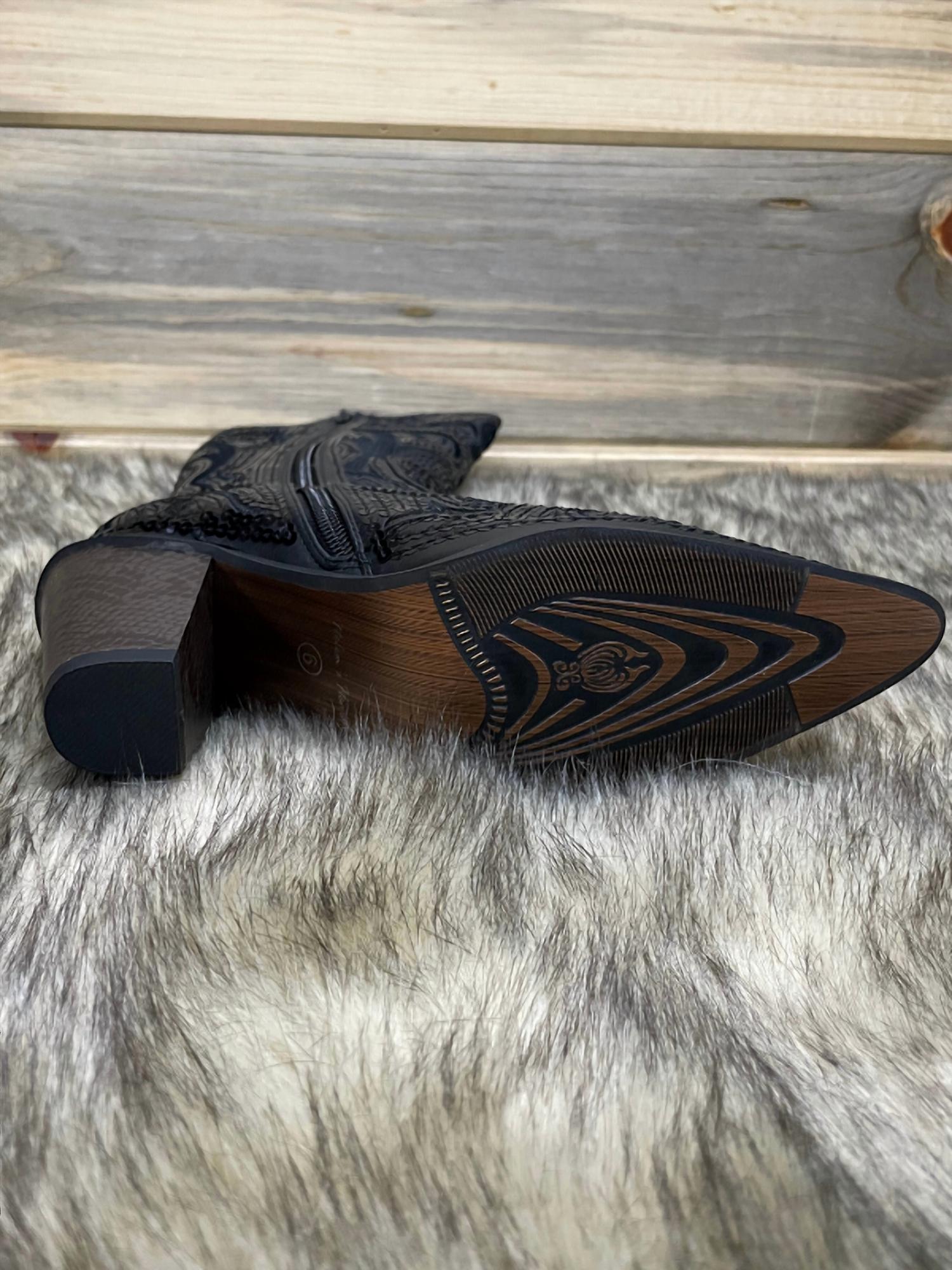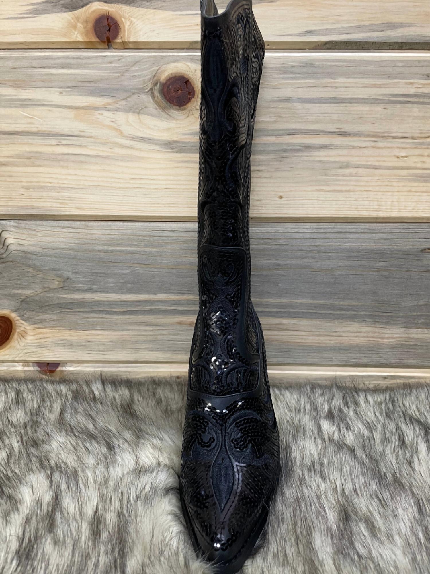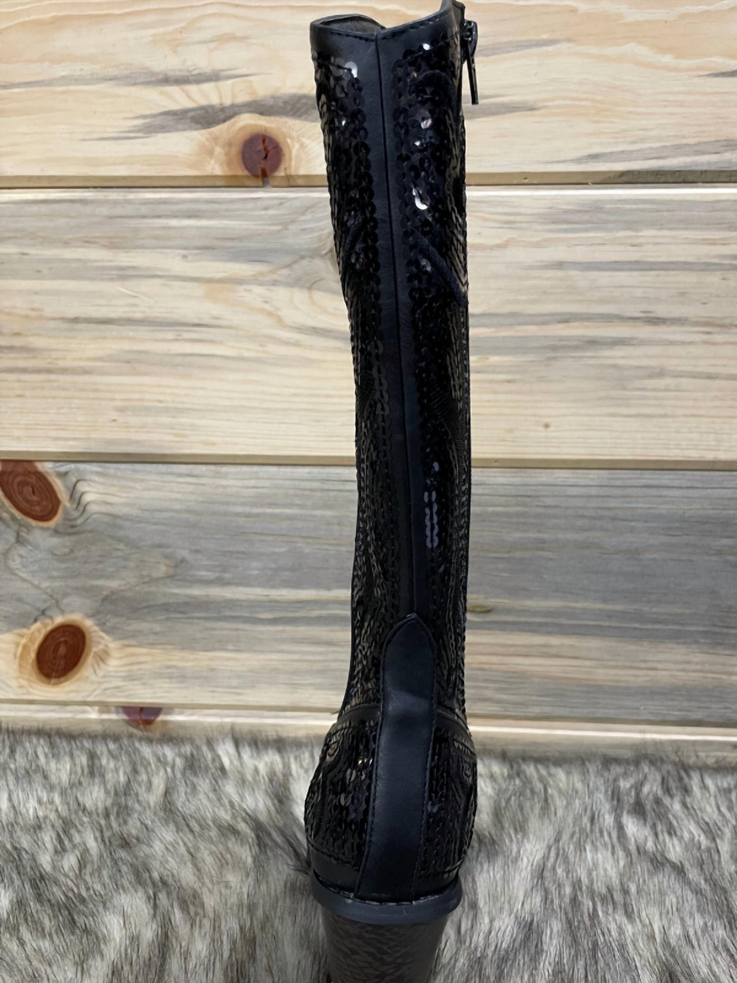 Tall sequin and embroidered boots with zipper. Lined interior. Heel: 3.0 inch.