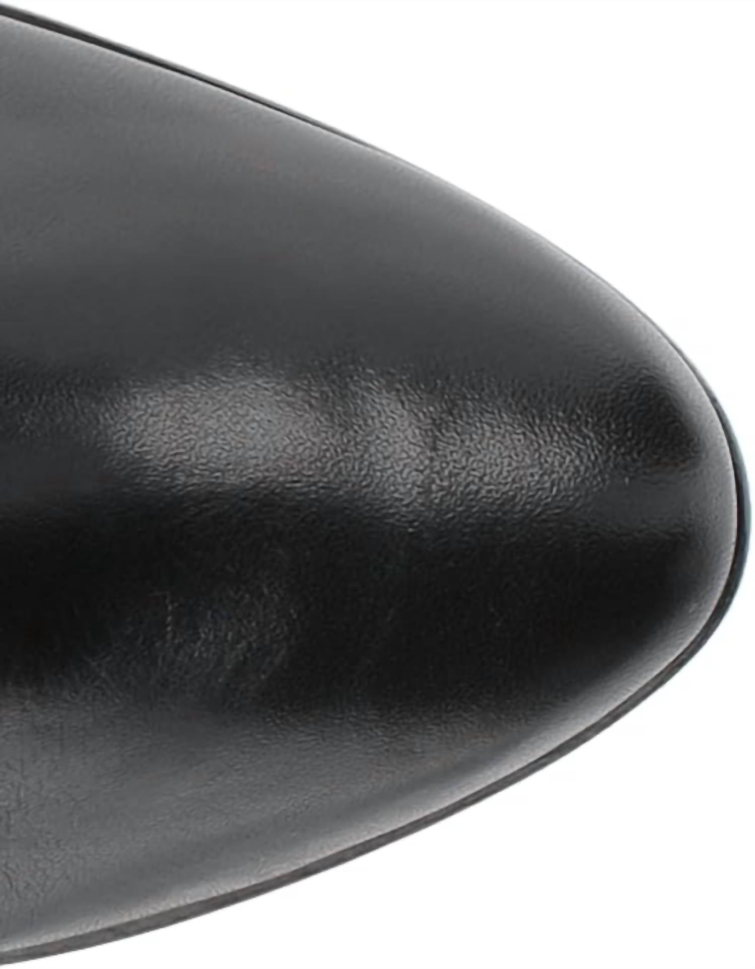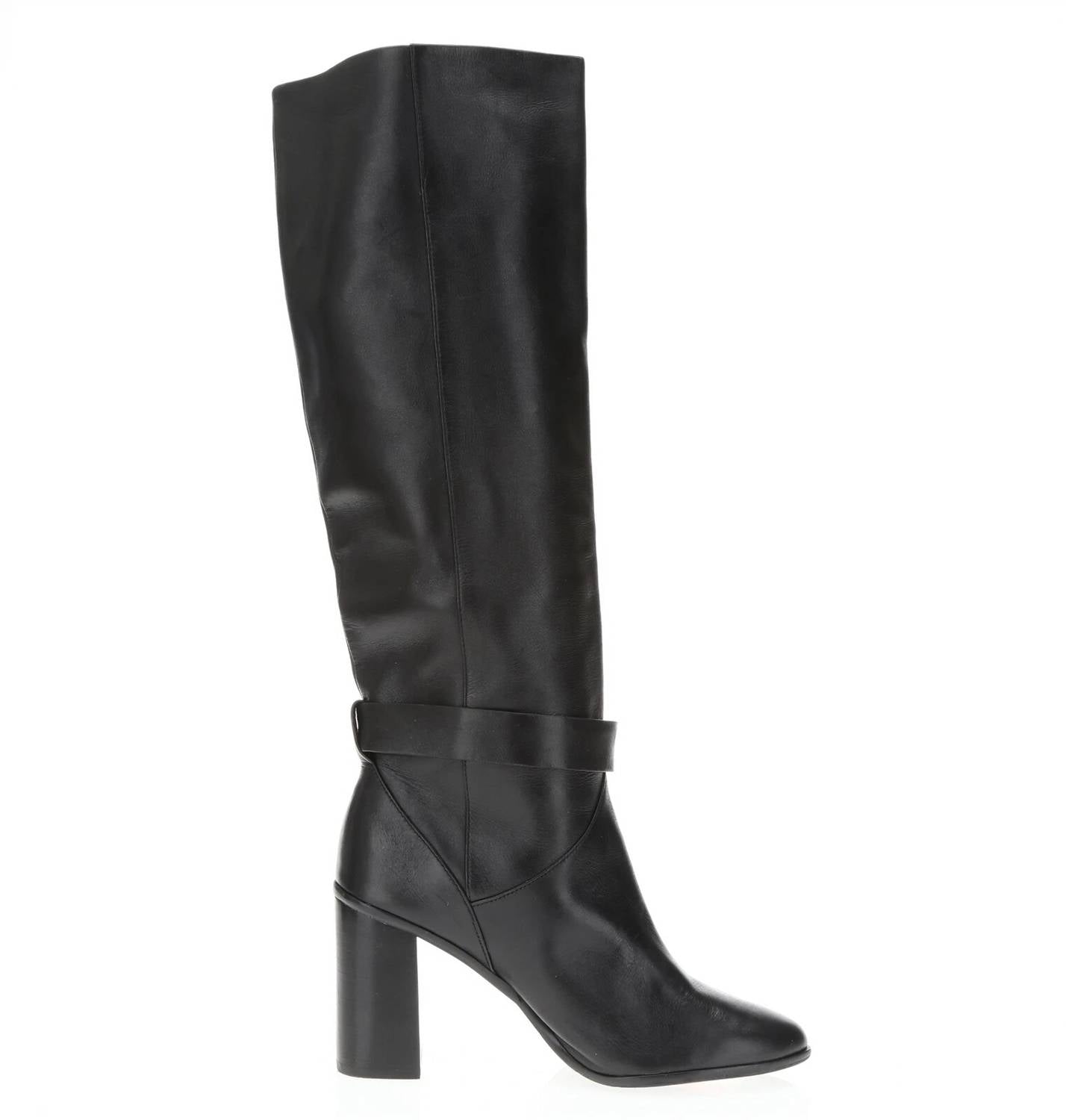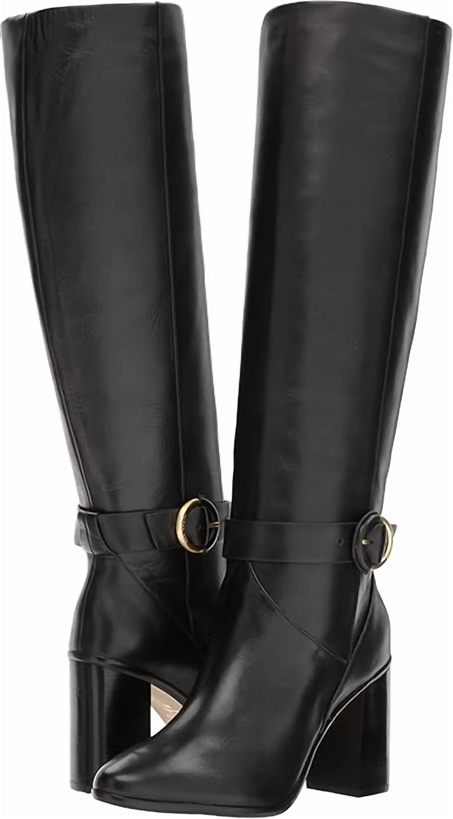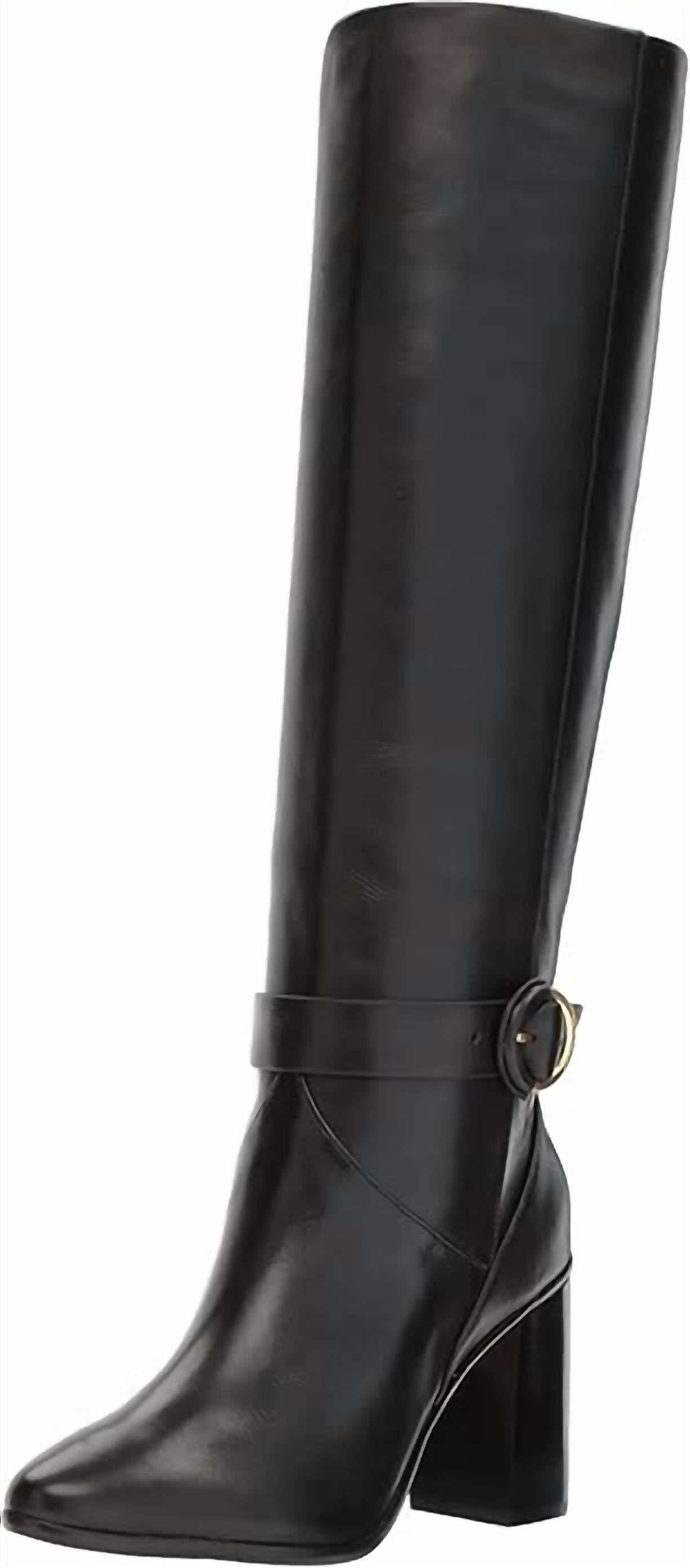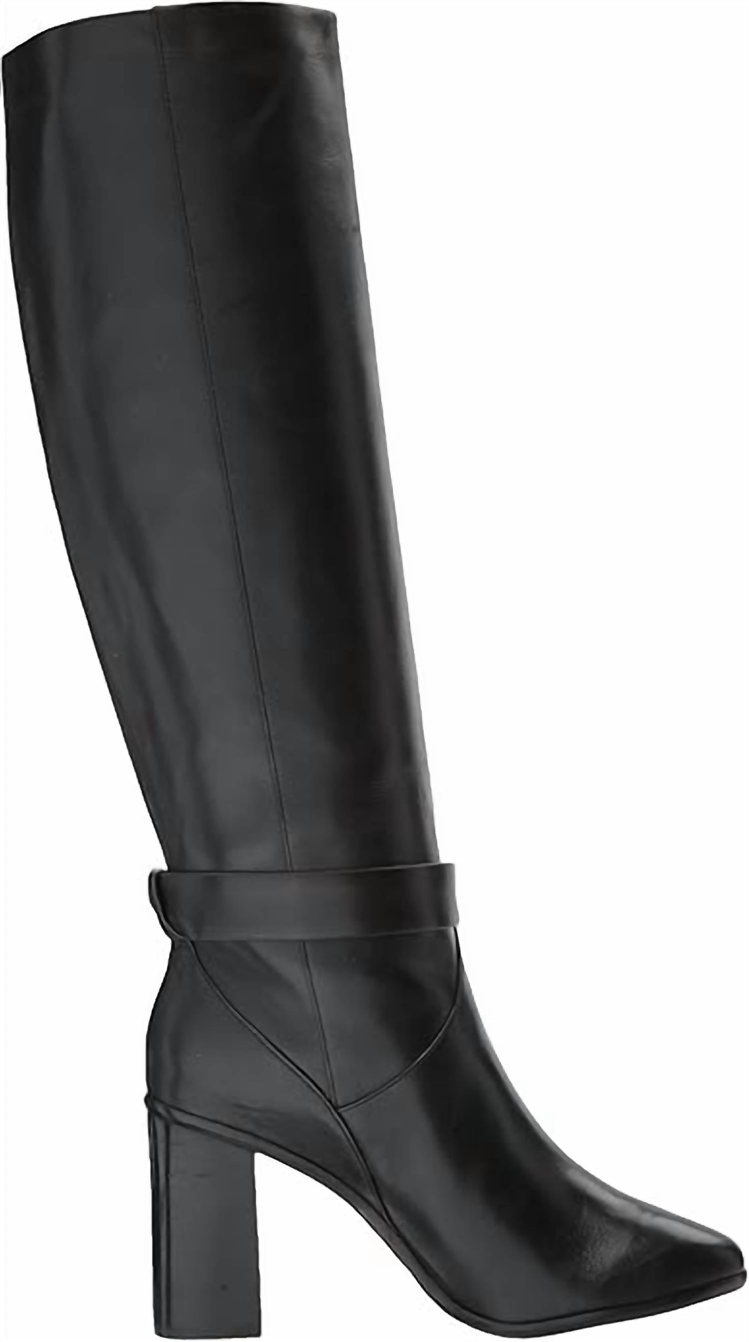 Upgrade your shoe game with these classic heeled boots, designed to merge sophistication and style. Comfortable enough for long days or a night out on the town. Dress up a casual look with this charming leather knee-high boot that features strap with rounded buckle detail a comfort padded insole for long-term wear Almond toe Leather construction Strap with round buckle detail Pull-on Comfort padded insole Stacked block heel Approx. 16.5" shaft height, 15" opening circumference Approx. 3.5" heel Leather upper, manmade sole M=medium width
