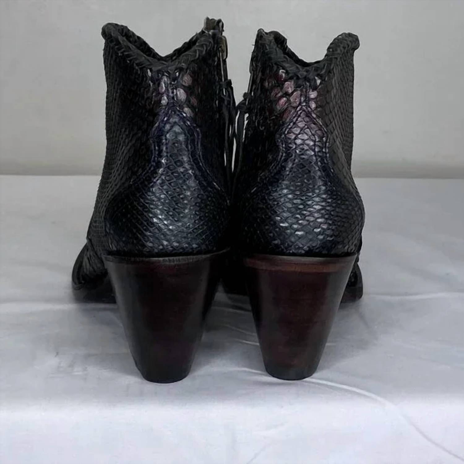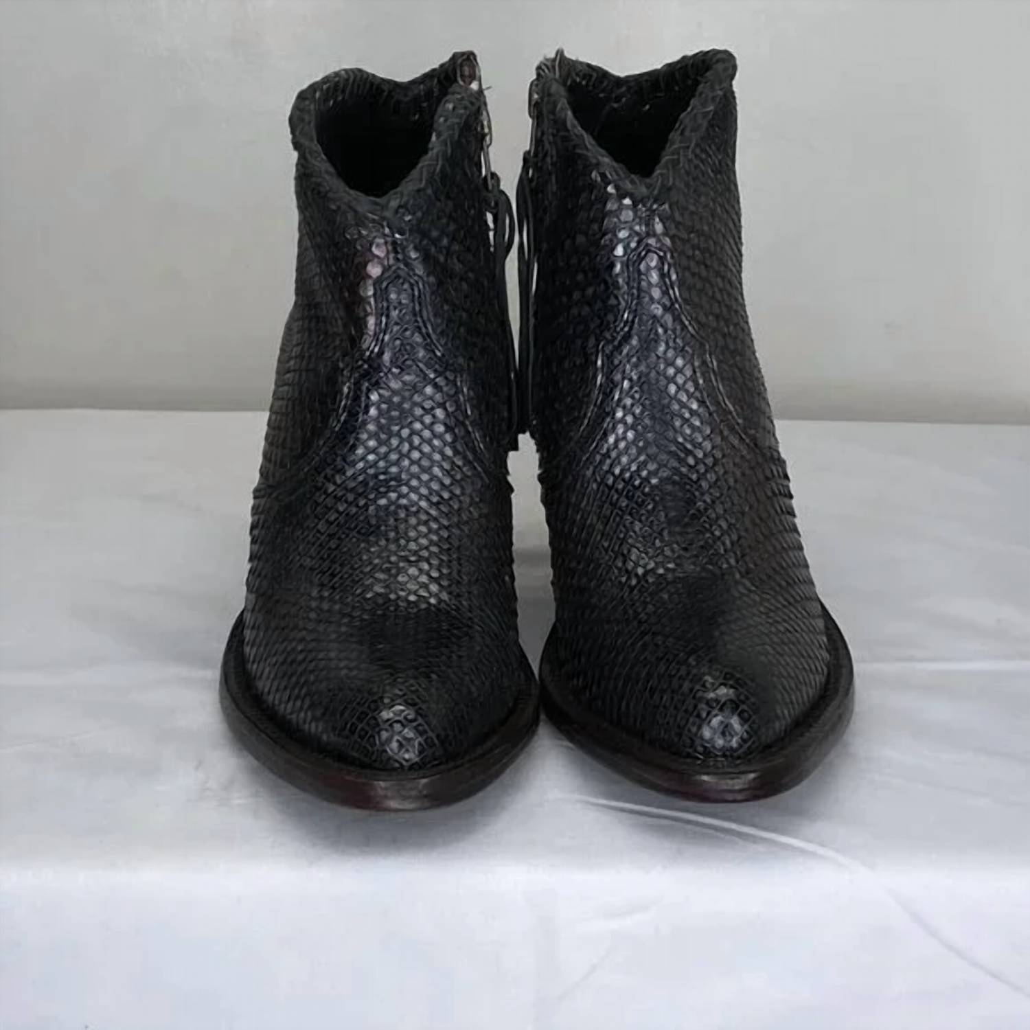 Introducing the Women's Kyra Boots by Allens Boots, the perfect statement piece for your fall wardrobe. These elegant black heeled boots feature an almond toe and a high block heel measuring 3 inches. Crafted with an exotic-textured python leather upper and a leather sole, they ensure both style and durability. The side zip closure offers easy wear, making them an ideal choice for your next concert outing.