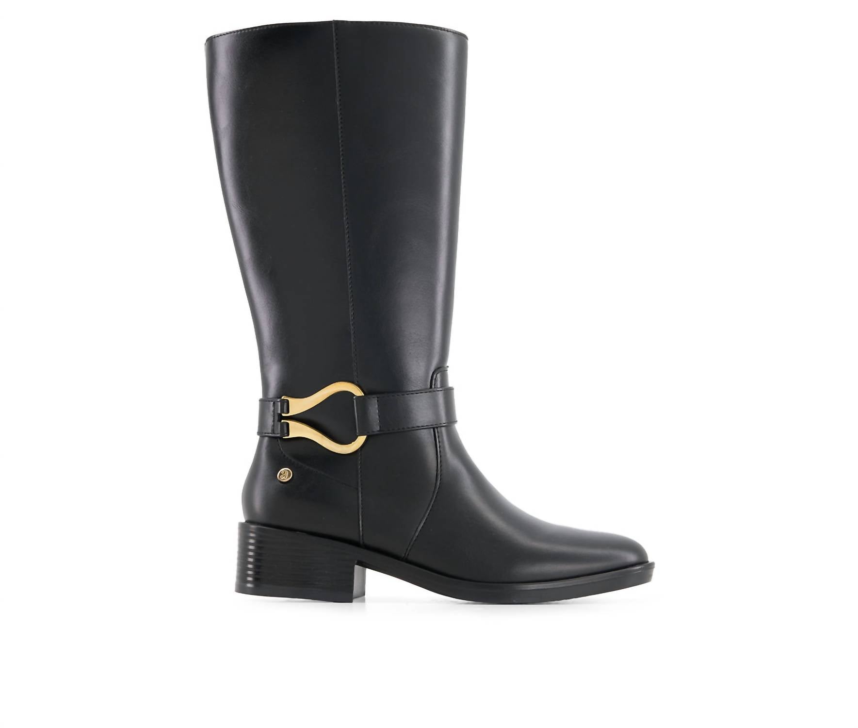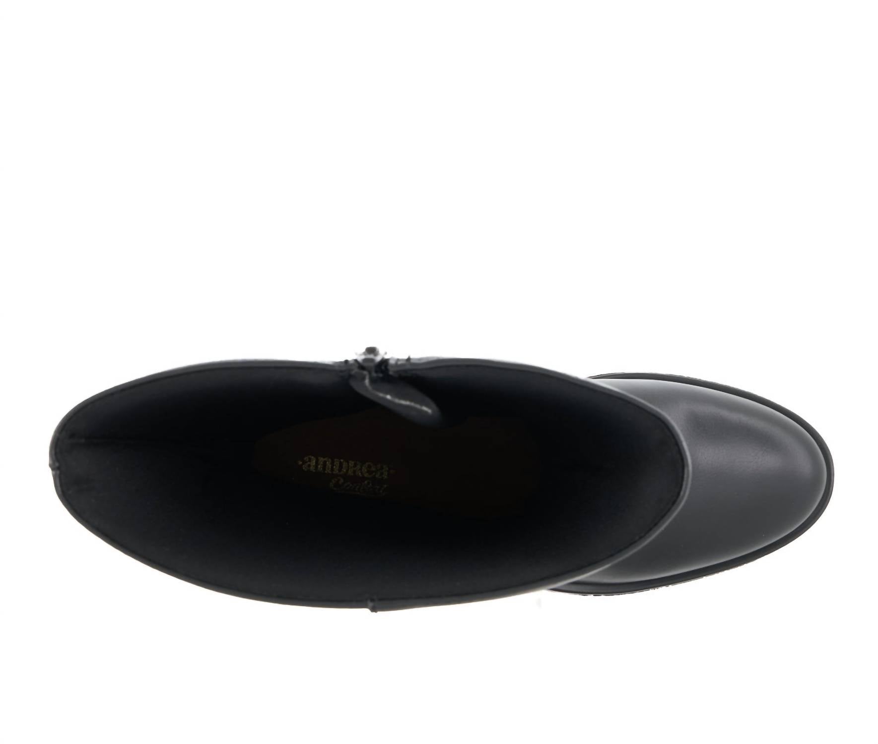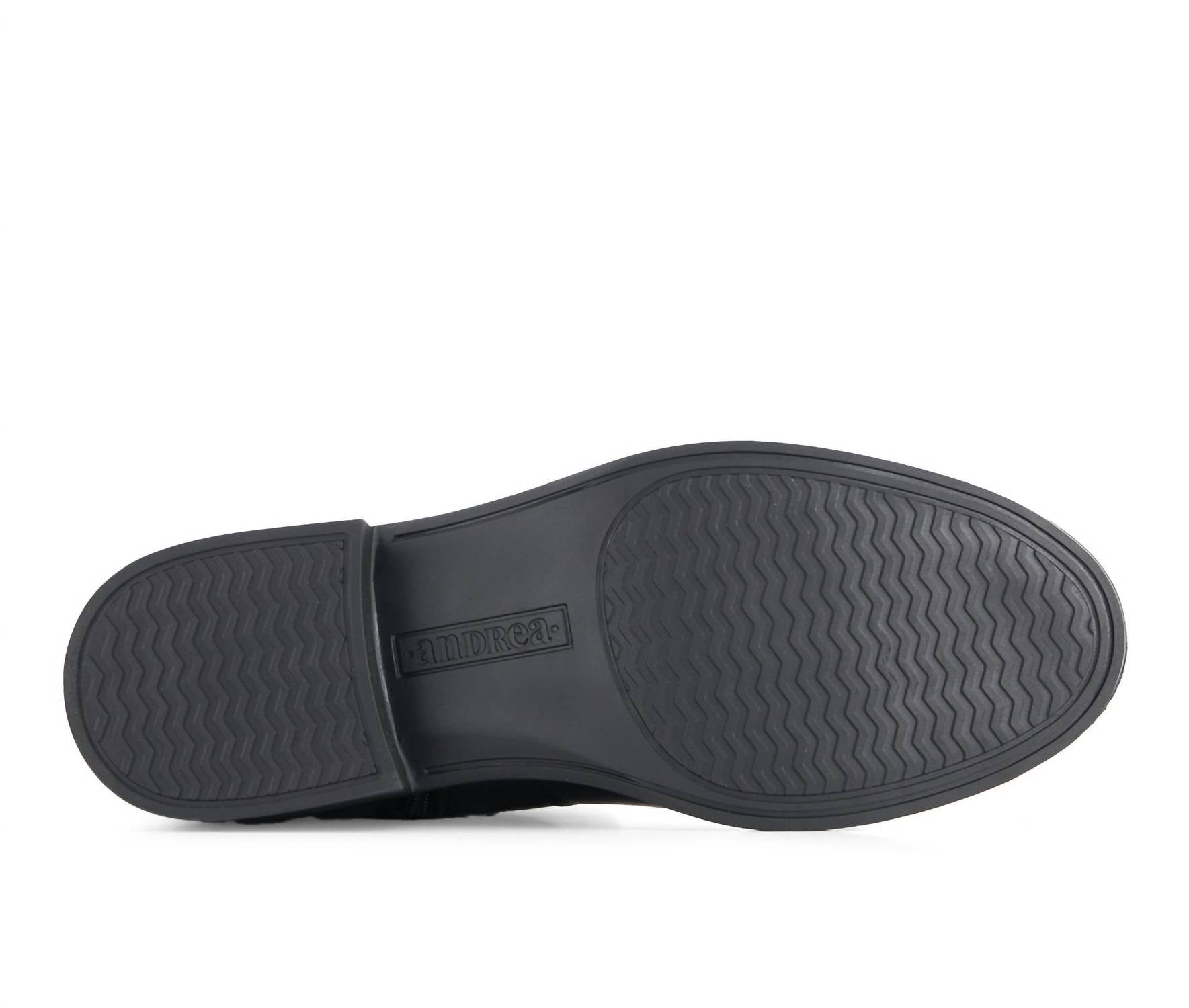 Step out in confidence and showcase your impeccable taste with these fashionable and versatile boots. Their classic style will have you reaching for these boots season after season. Step into sophistication with the Women's Tall Riding Boots by Andrea, crafted in a sleek black rubber material. Designed with an almond toe and a comfortable 2-inch block heel, these boots effortlessly blend style and practicality. Ideal for travel and minimalist fall trends, they're perfect for Thanksgiving gatherings or any stylish outing. Elevate your wardrobe with this must-have pair of heeled boots.