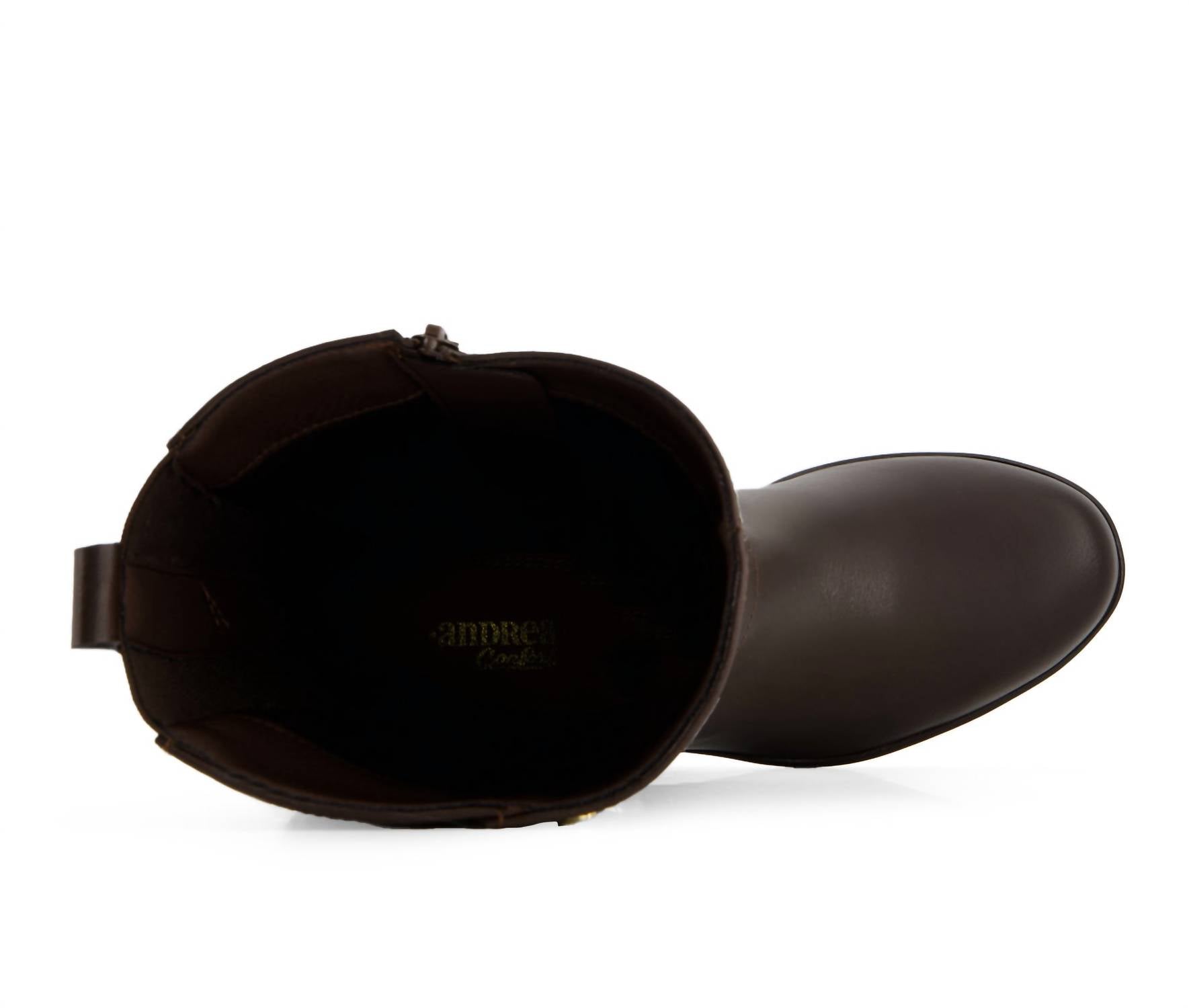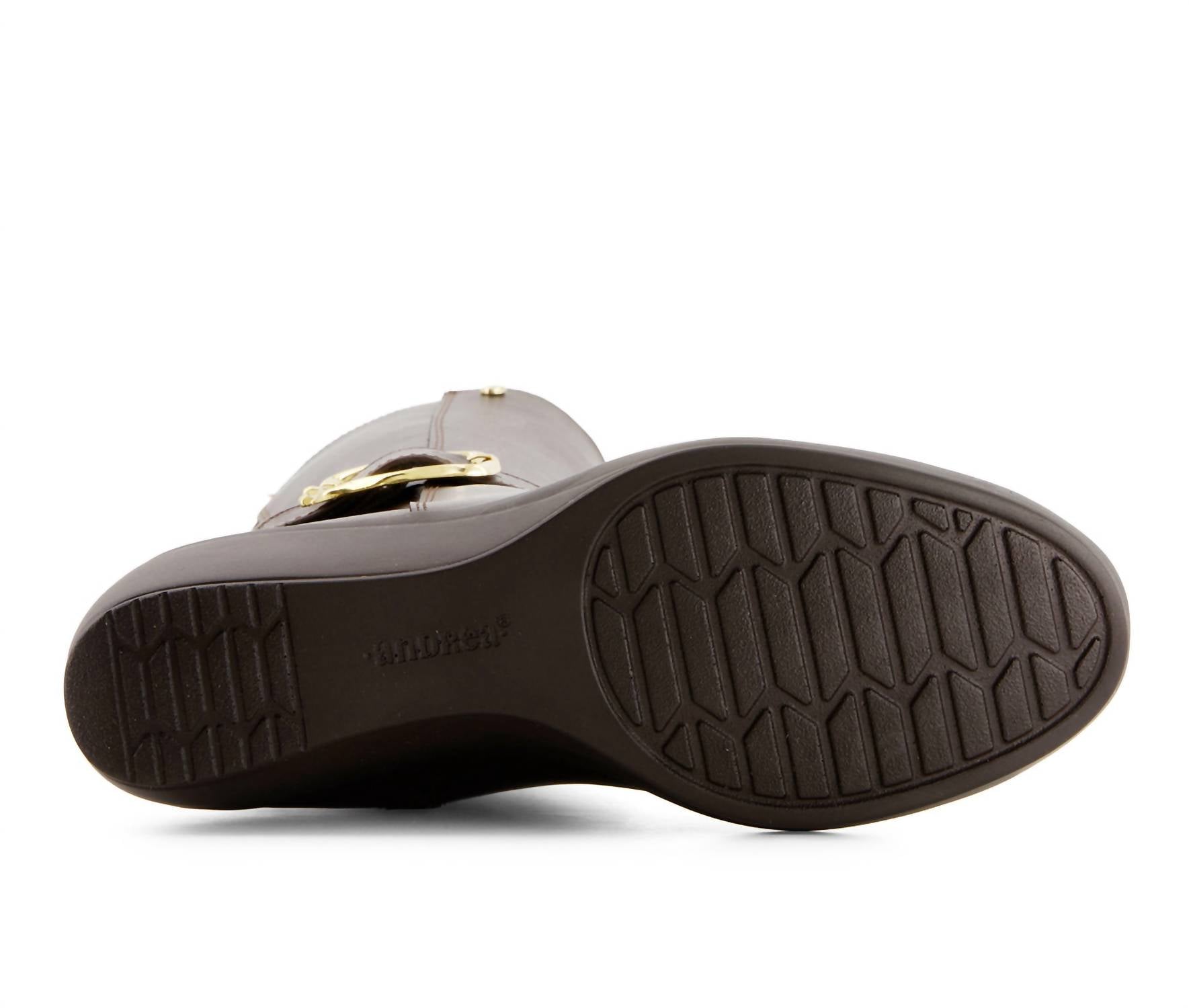 Upgrade your shoe game with these classic heeled boots, designed to merge sophistication and style. Comfortable enough for long days or a night out on the town. Elevate your style with Andrea Women's Tall Riding Boots in elegant brown, perfect for fall occasions like Thanksgiving. Crafted from luxurious rubber, these boots feature a comfortable cushioned foam insole and a lightweight design, complemented by a versatile block heel measuring 2 inches. The round toe shape and minimalist trend ensure they remain a sophisticated choice for travel or any day. Effortlessly blend style and comfort with these exclusive boots, adding charm to your collection.