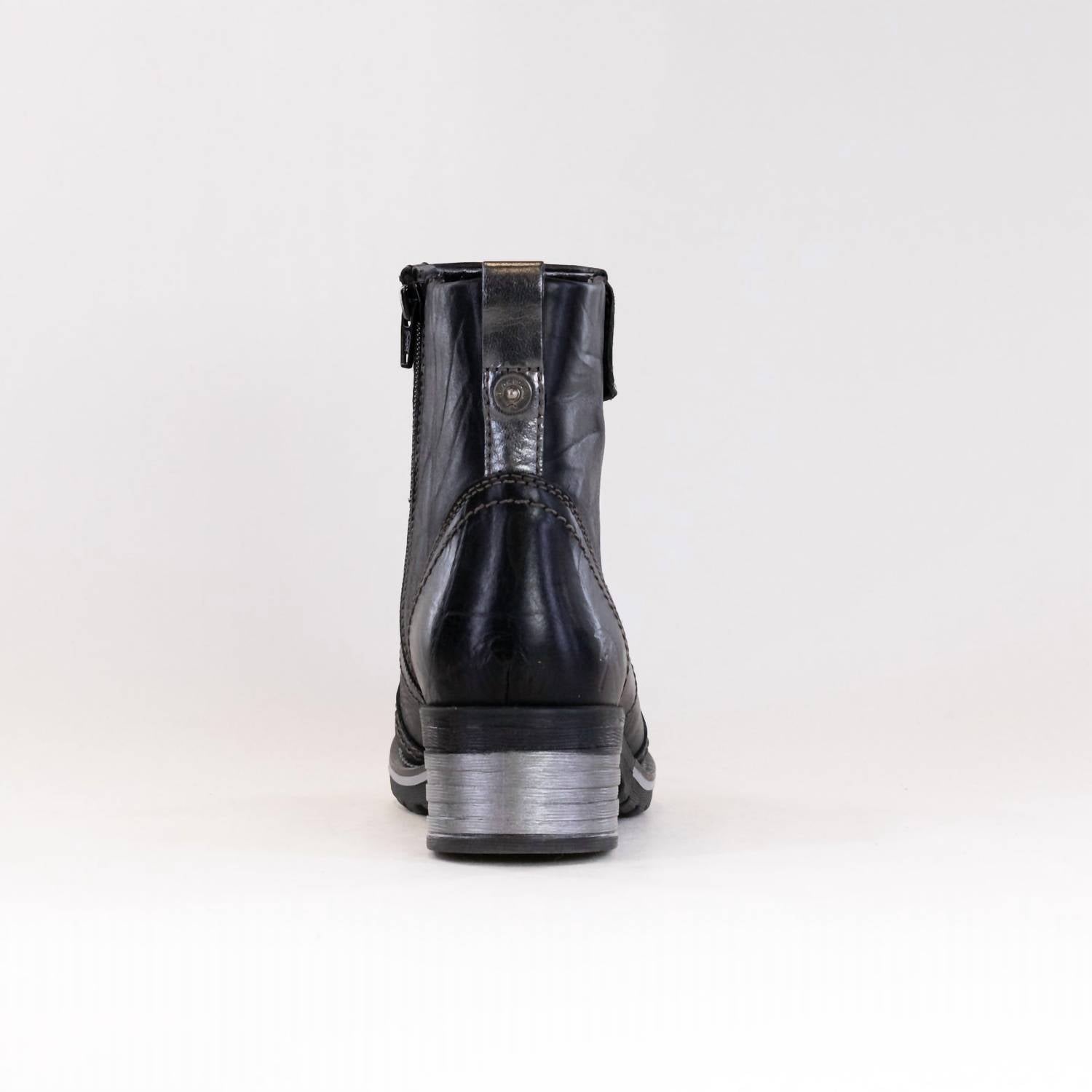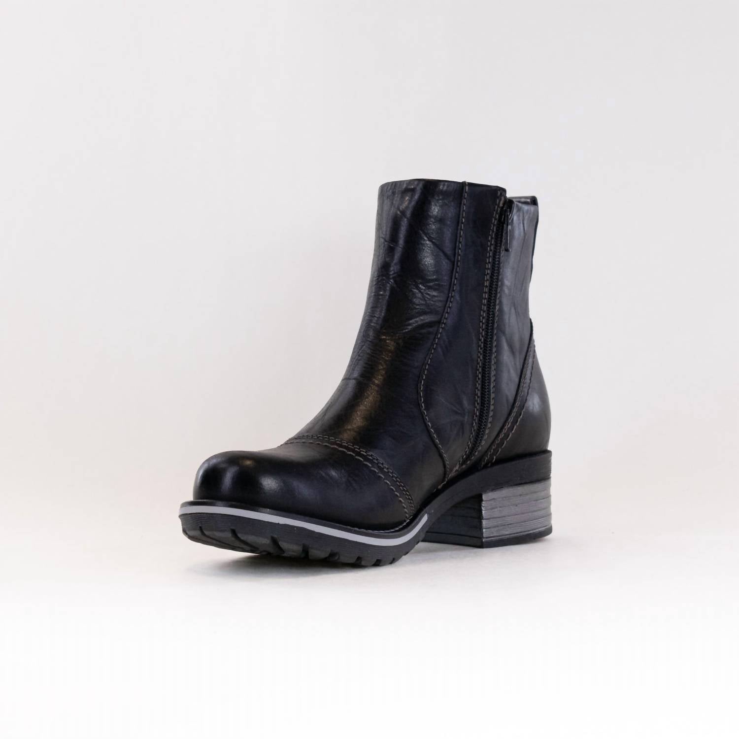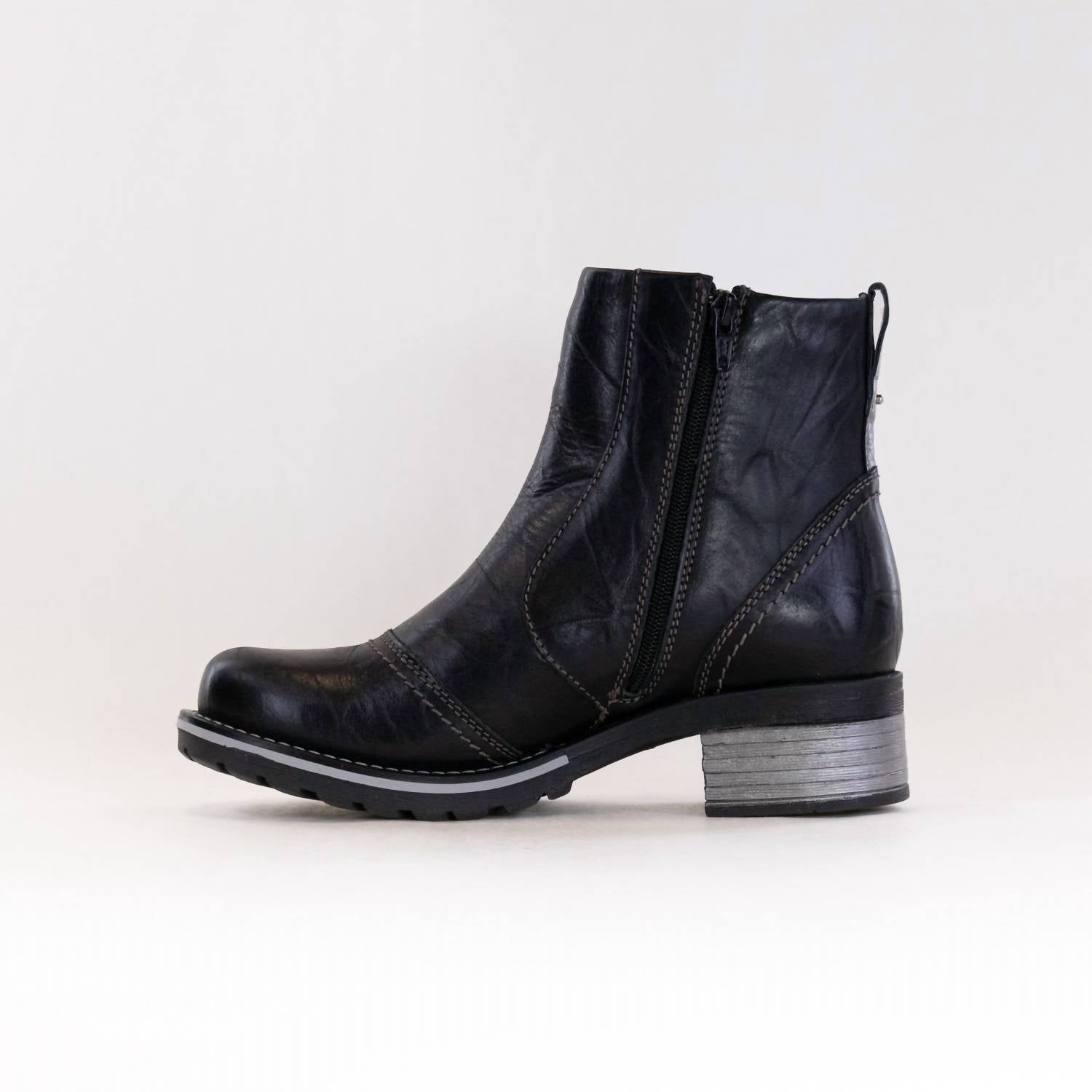 Step out in confidence and showcase your impeccable taste with these fashionable and versatile boots. Their classic style will have you reaching for these boots season after season. Discover the Women's Kassia Boot by DROMEDARIS, skillfully crafted for evening elegance and quiet luxury in eye-catching black. Made from soft, waxy leather with a creased effect, this ankle boot features an inside zipper for seamless entry and a top line elastic for enhanced ankle movement. Adorned with metallic trims and unique stitching, it ensures warmth and comfort with a faux fur lining, plus a removable "4D Technology" footbed for superior support and odor resistance. Ideal for staying stylish during spring evenings, this boot with a block heel and round toe design is made for women on their feet all day.