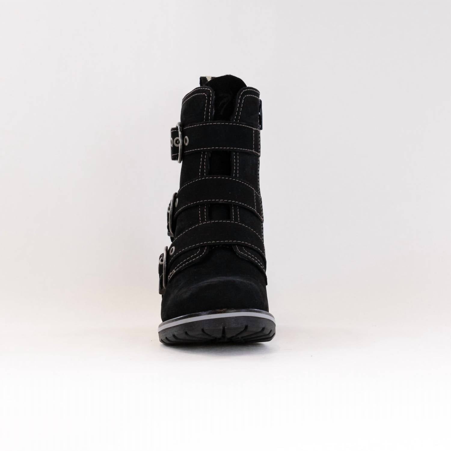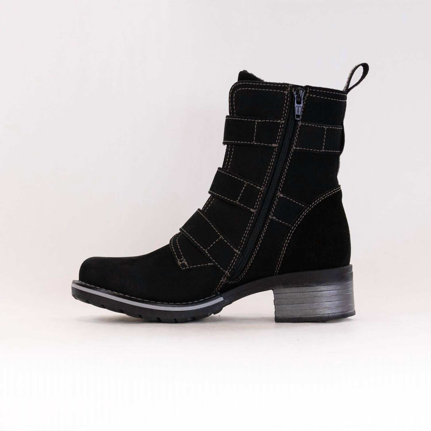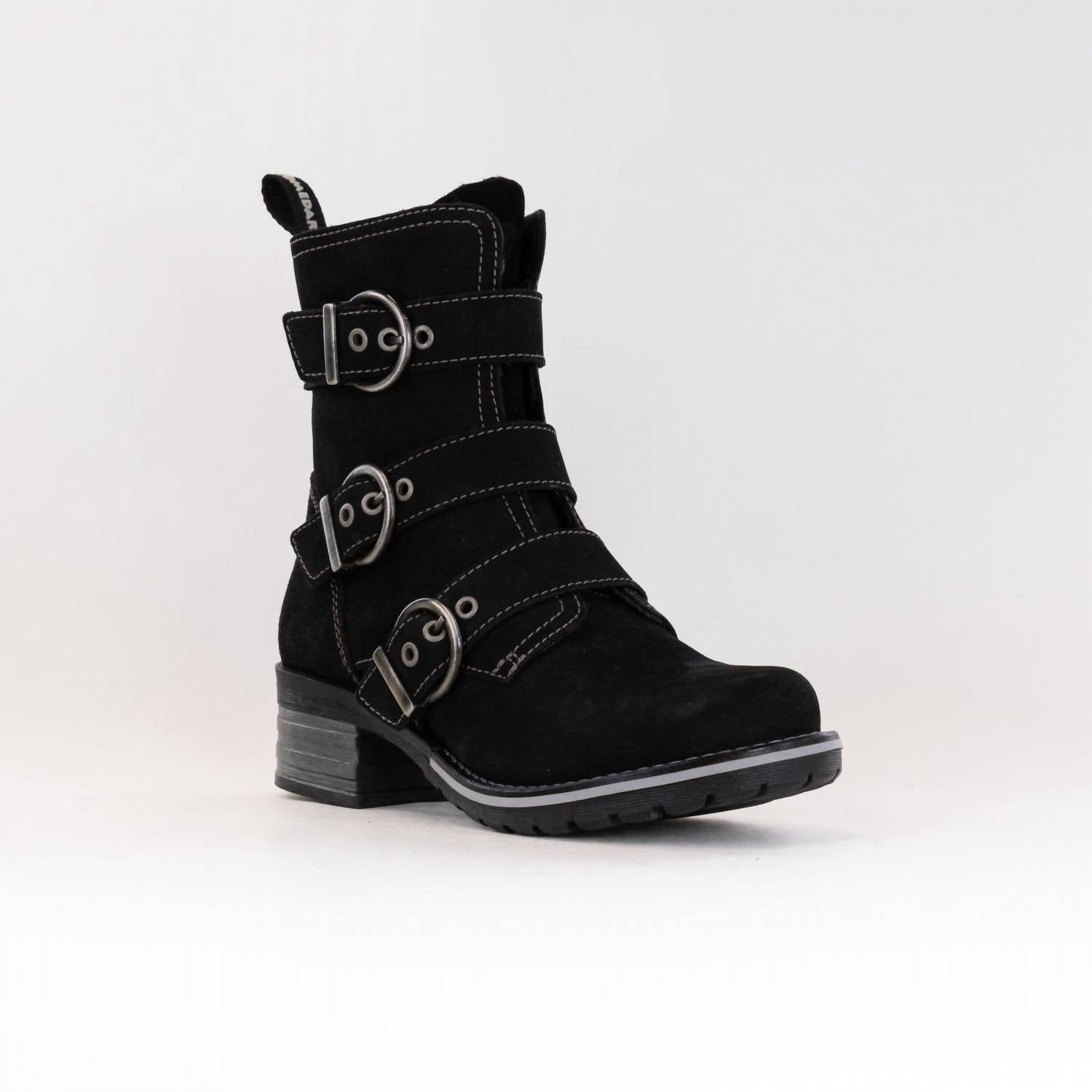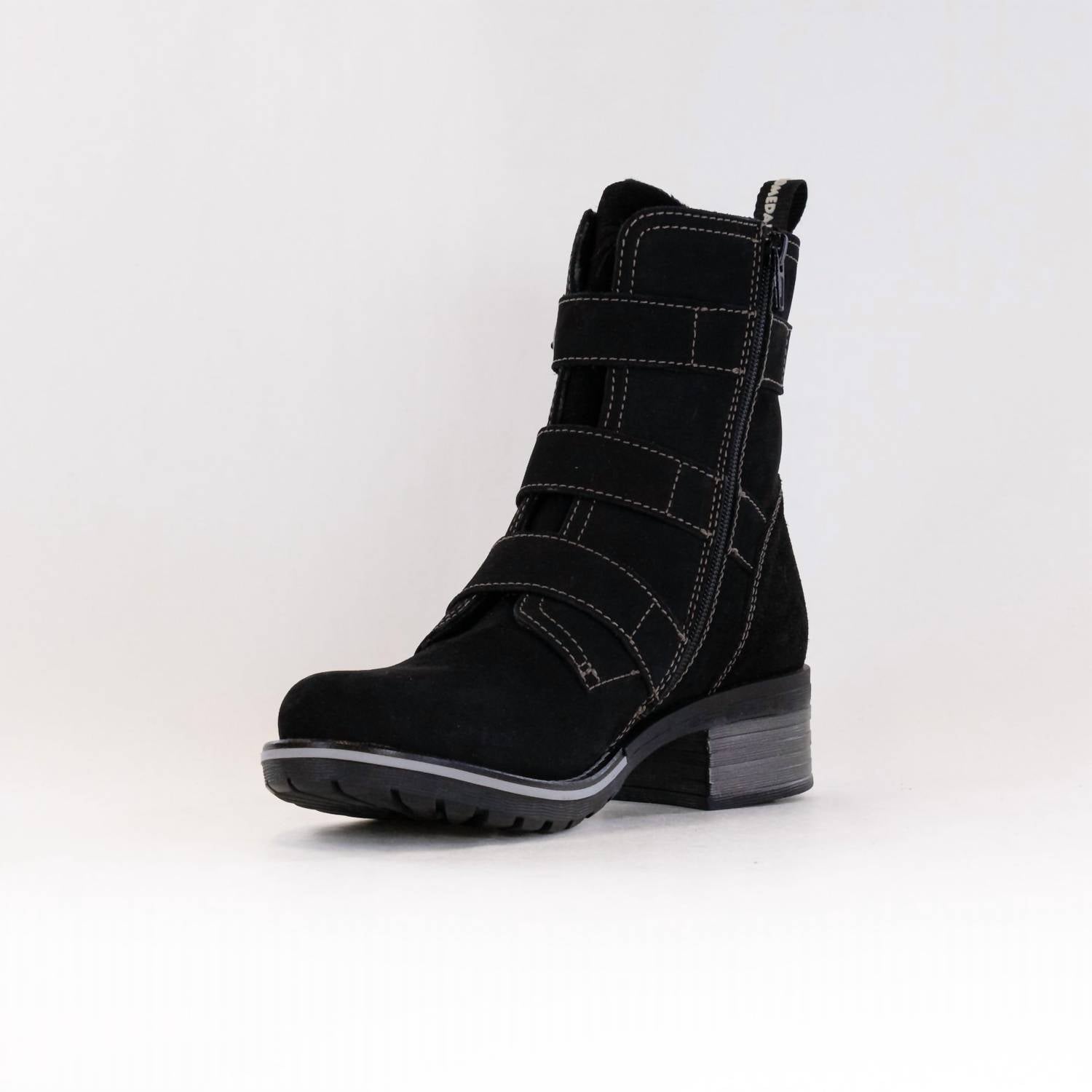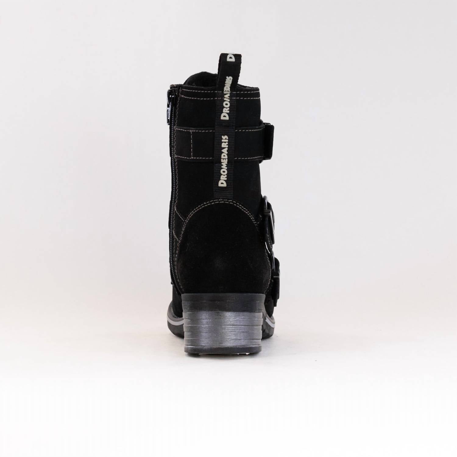 Upgrade your shoe game with these classic heeled boots, designed to merge sophistication and style. Comfortable enough for long days or a night out on the town. Step into elegance with the Women's Klara Boot by Dromedaris, crafted in sophisticated black suede, perfect for any evening event this spring. Featuring a high ankle design and adjustable triple buckle straps with an inner zipper for a secure fit, these boots combine comfort and style effortlessly. The block heel and round toe shape exemplify quiet luxury and ensure a fashionable stride, while the thermo-plastic rubber outsole with a rocker bottom enhances walking motion. With a removable "4D Technology" footbed developed in Germany, these boots offer exceptional support and comfort, ideal for women who are on their feet all day.