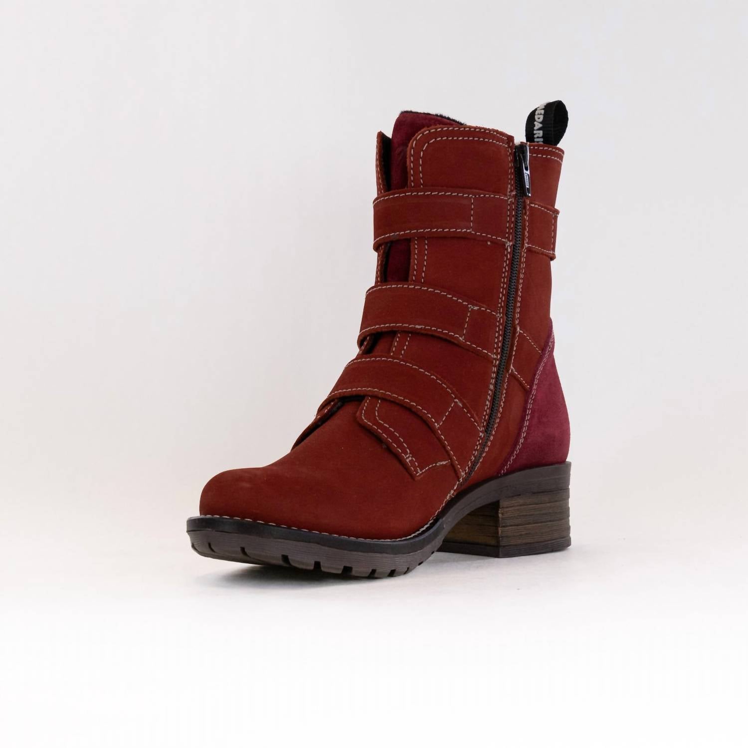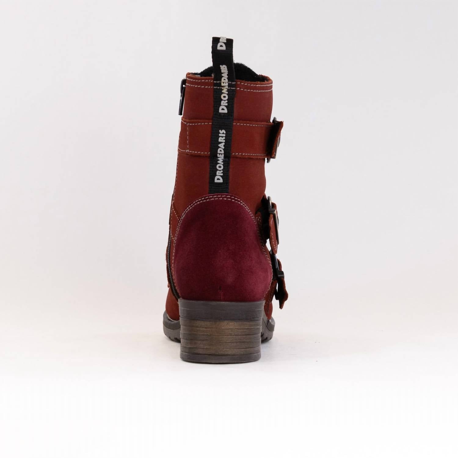 Step out in confidence and showcase your impeccable taste with these fashionable and versatile boots. Their classic style will have you reaching for these boots season after season. Introducing the Women's Klara Boot by DROMEDARIS, a stunning garnet ankle boot with triple buckle straps and an inner zipper for a custom fit. Crafted from soft suede, this boot offers a round toe and a comfortable block heel, making it the perfect choice for evening events. The Thermo-plastic rubber outsole, designed with a leather stack finish and rocker bottom, enhances walking motion and minimizes back strain. Its removable "4D Technology" footbed with advanced cushioning provides superior comfort and odor control, ideal for women who are on their feet all day.