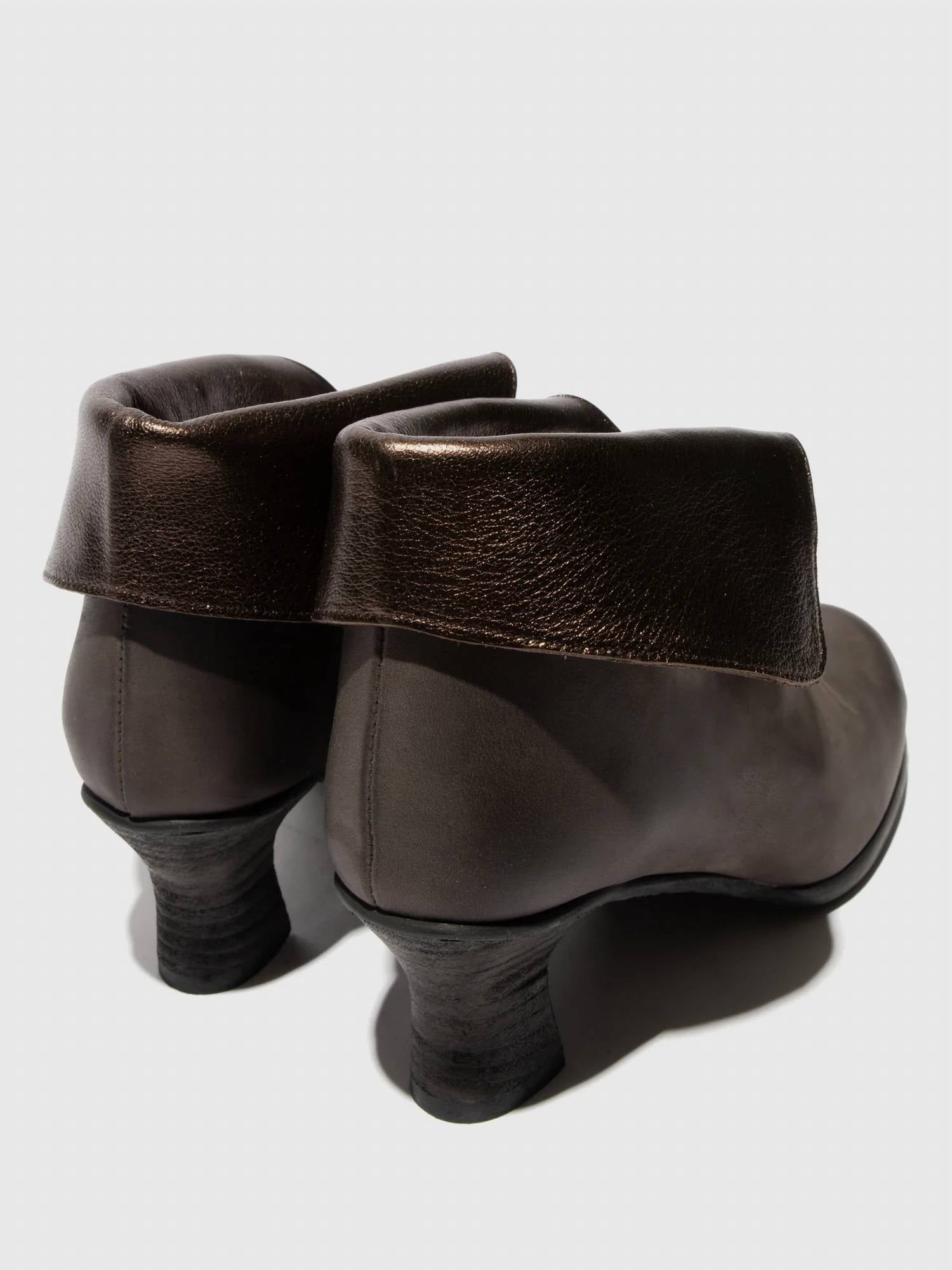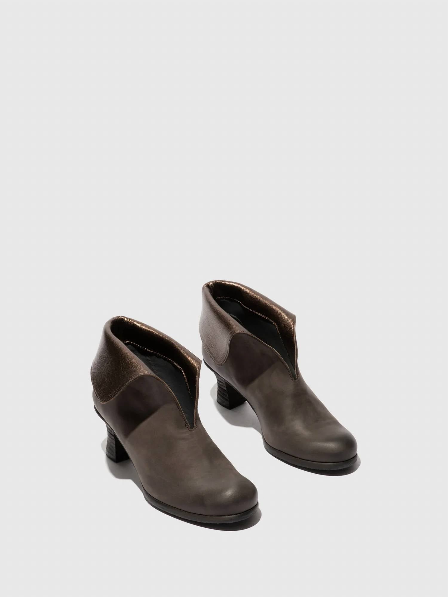 Step out in confidence and showcase your impeccable taste with these fashionable and versatile boots. Their classic style will have you reaching for these boots season after season. Introducing the Women's Zip Up Ankle Boots by FLY LONDON, a stunning choice for evening events with a vintage flair. These heeled boots, constructed from high-quality leather, feature a convenient zip closure and stylish spool heel, perfect for the fall season. Designed in a chic grey and dark gold color scheme, they offer a modern twist on a classic look. With a comfortable round toe shape, they seamlessly blend elegance and comfort.