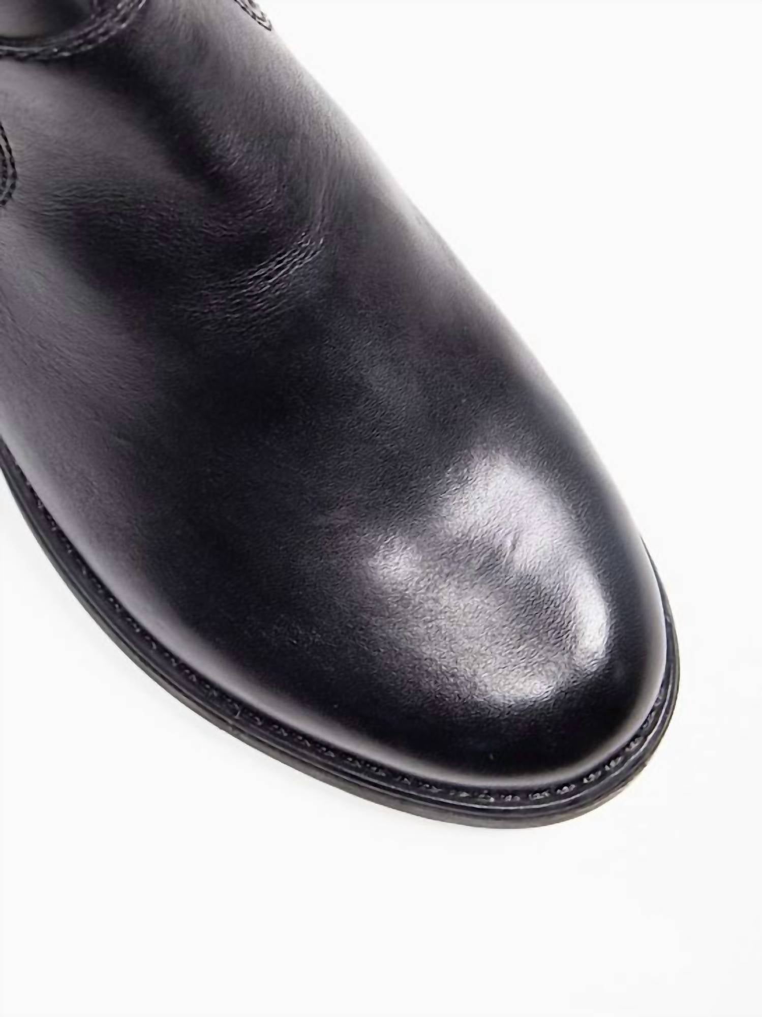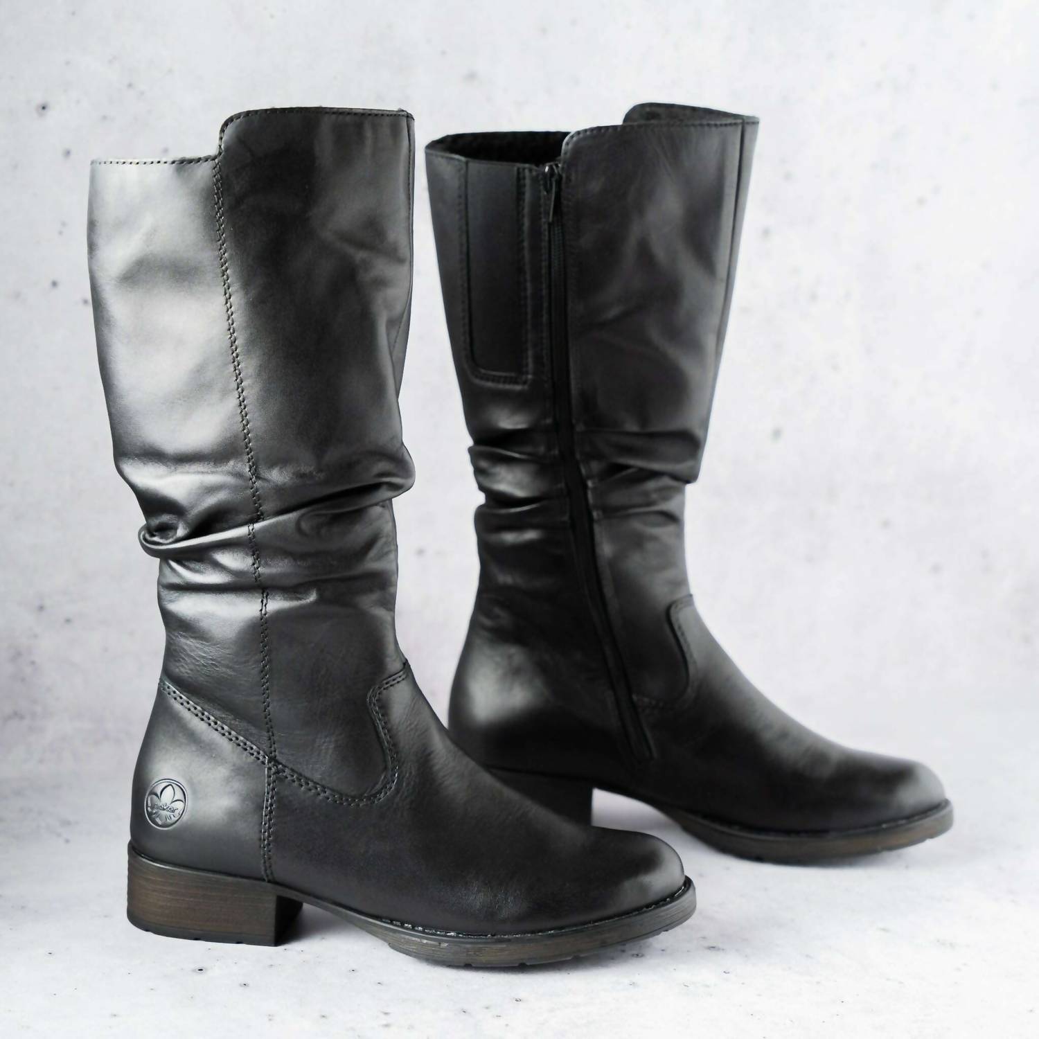 A stylish boot with a comfortable fit and the perfect amount of height. These classic boots are the perfect addition to any outfit and can be worn season after season. Step into versatility and comfort with the Women's Leather Boots by RIEKER, crafted in elegant black leather. Featuring a stretchable back panel and ruching, these boots are designed to move with you, ideal for a holiday party or a Western-inspired fall look. The almond toe and 1.25" block heel offer a stylish silhouette with a low heel height for all-day wear. Perfect with an expandable calf panel, these boots are a chic choice for Thanksgiving celebrations.