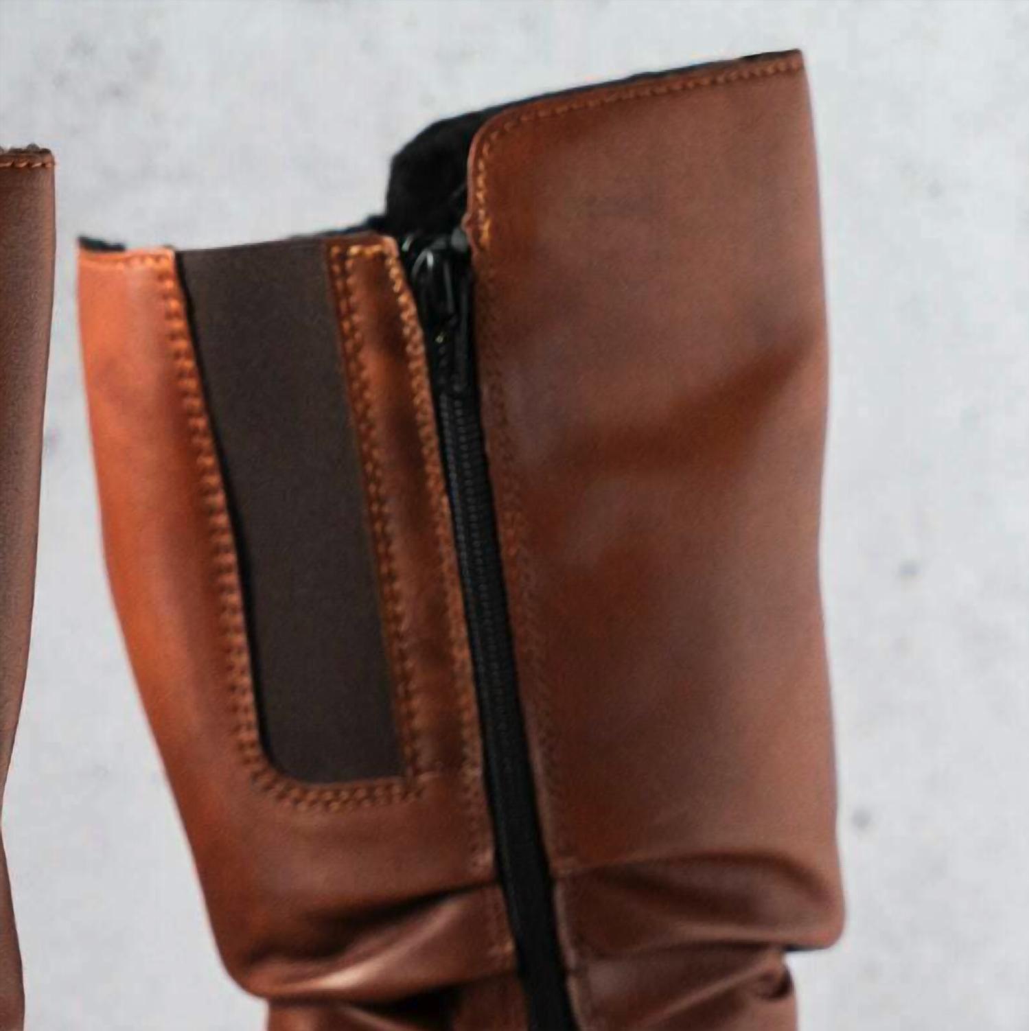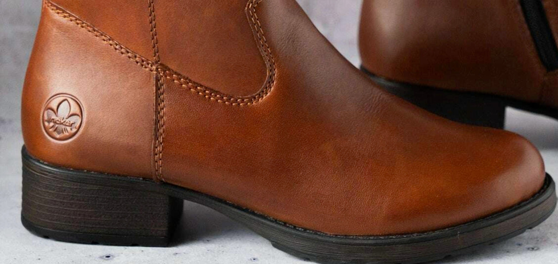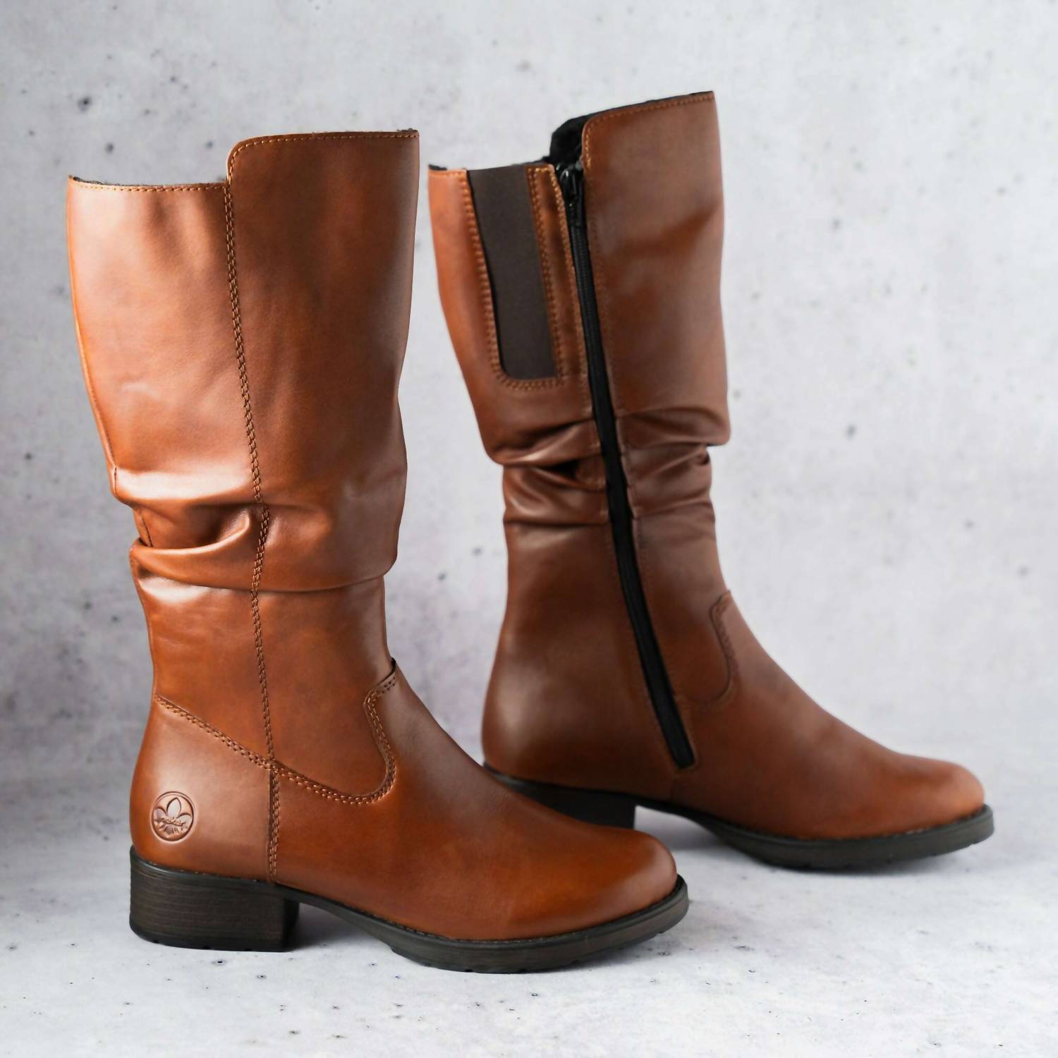 Upgrade your shoe game with these classic heeled boots, designed to merge sophistication and style. Comfortable enough for long days or a night out on the town. Elevate your style with the RIEKER Women's Leather Boots in a rich chestnut hue, perfect for a holiday party or Thanksgiving gathering. Crafted from supple leather, these boots feature a trendy Western style with a stretchy back panel and ruching that moves with you. They sit comfortably on a 1.25" block heel, making them ideal for all-day wear. With expandable calf panels for a customized fit, these boots are designed for the fashion-forward woman ready to embrace the fall season.