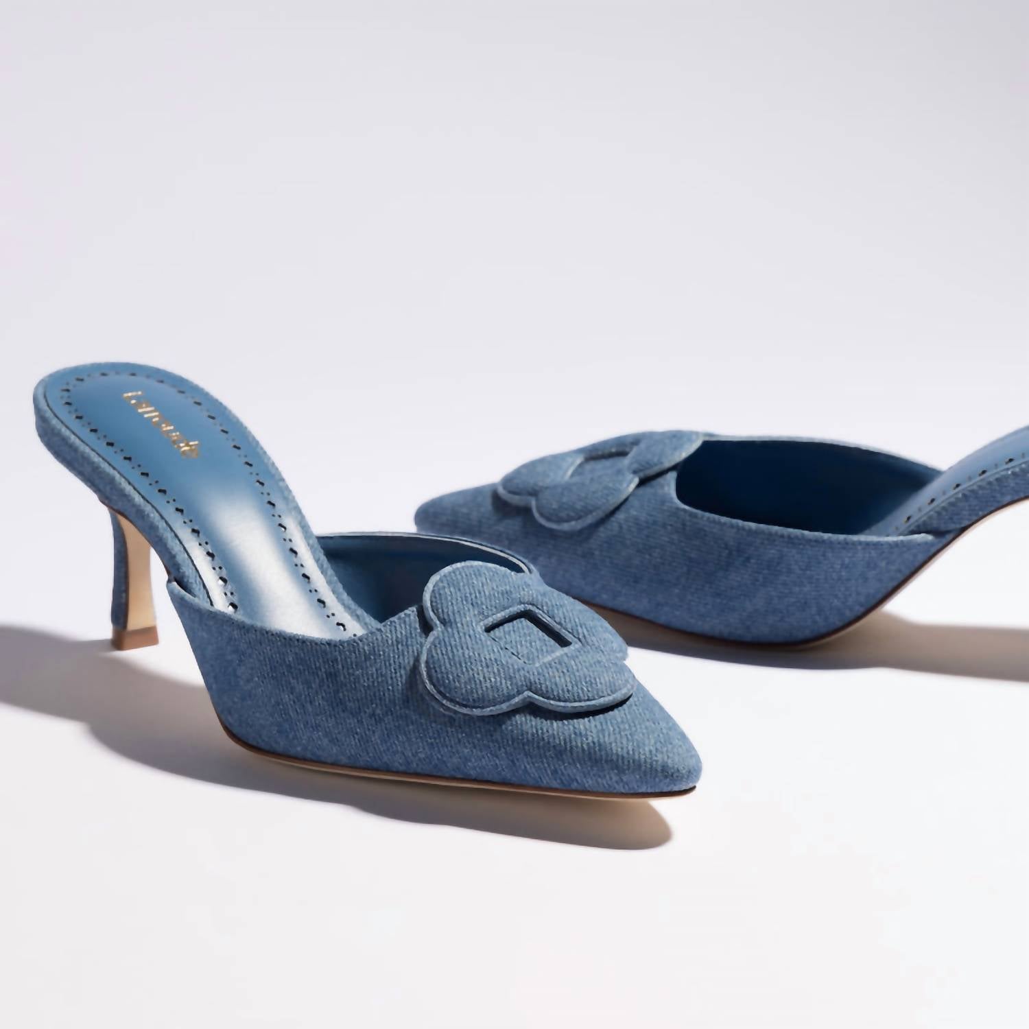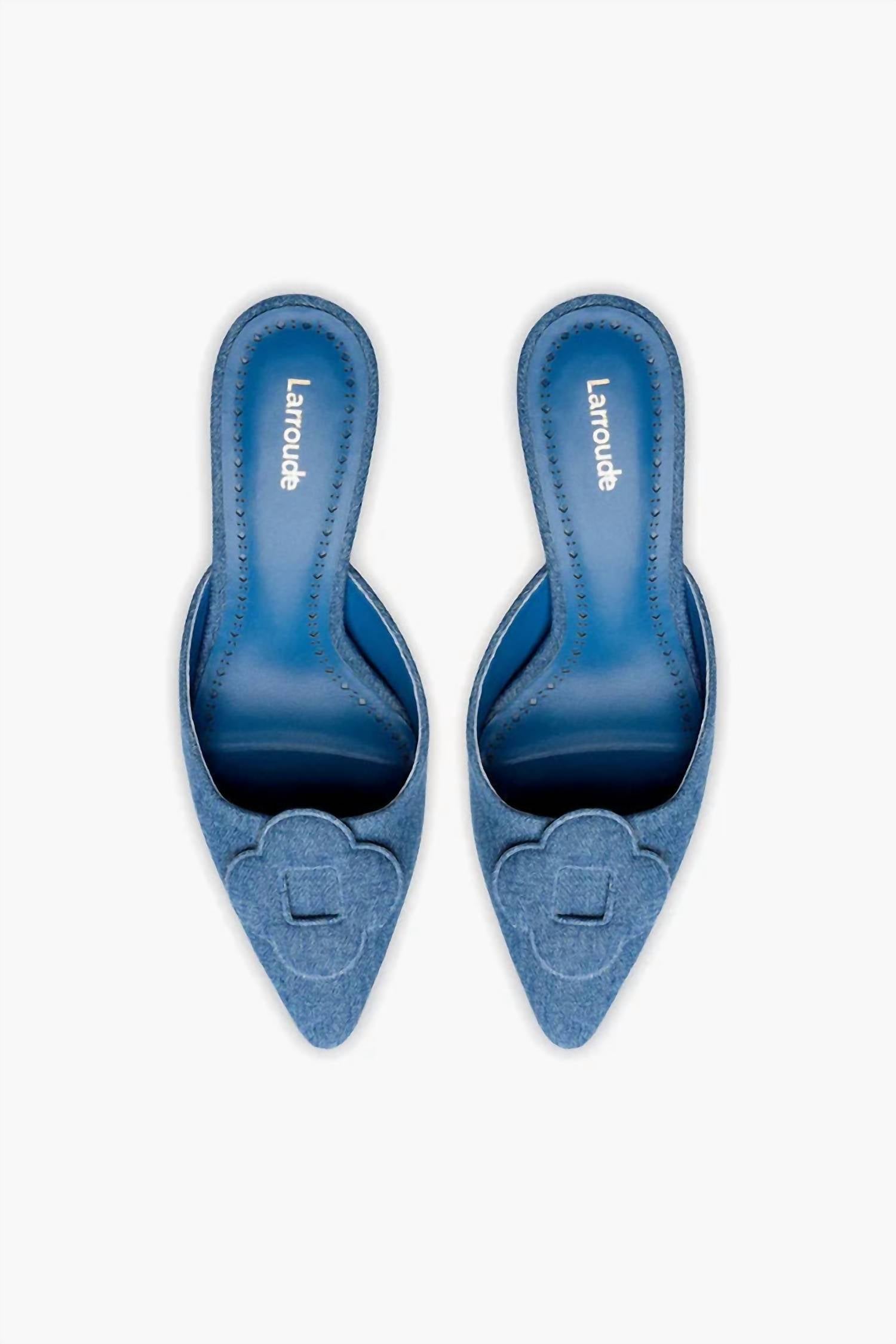 Pair these beauties with your favorite skinny jeans or dress for a night out on the town. Elevate your style with the Women's Flora Pumps by Larroude, a perfect blend of sleek and chic fashion. Crafted from denim fabric in a stunning stoned blue hue, these pumps feature a closed pointed toe and a sophisticated 2.5-inch kitten heel. The finely crafted leather sole ensures support, durability, and comfort, while a non-removable adornment adds a touch of elegance. Simply peel off the protector before wearing to enjoy instant sophistication for any occasion, from casual denim days to chic holiday parties.