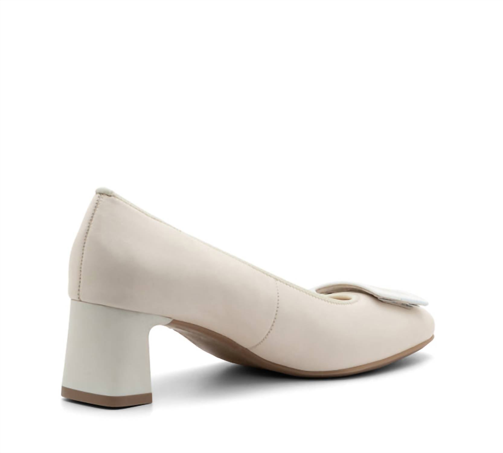 Don't be deceived, these heels are comfy as can be. Crafted from premium off-white leather, these shoes feature a chic buckle detail and a comfortable round toe design. With a 2" low block heel and HighSoft arch support, they offer the ideal blend of style and comfort. The medium width ensures a great fit, while they shine as a sophisticated choice for weddings or any spring event.