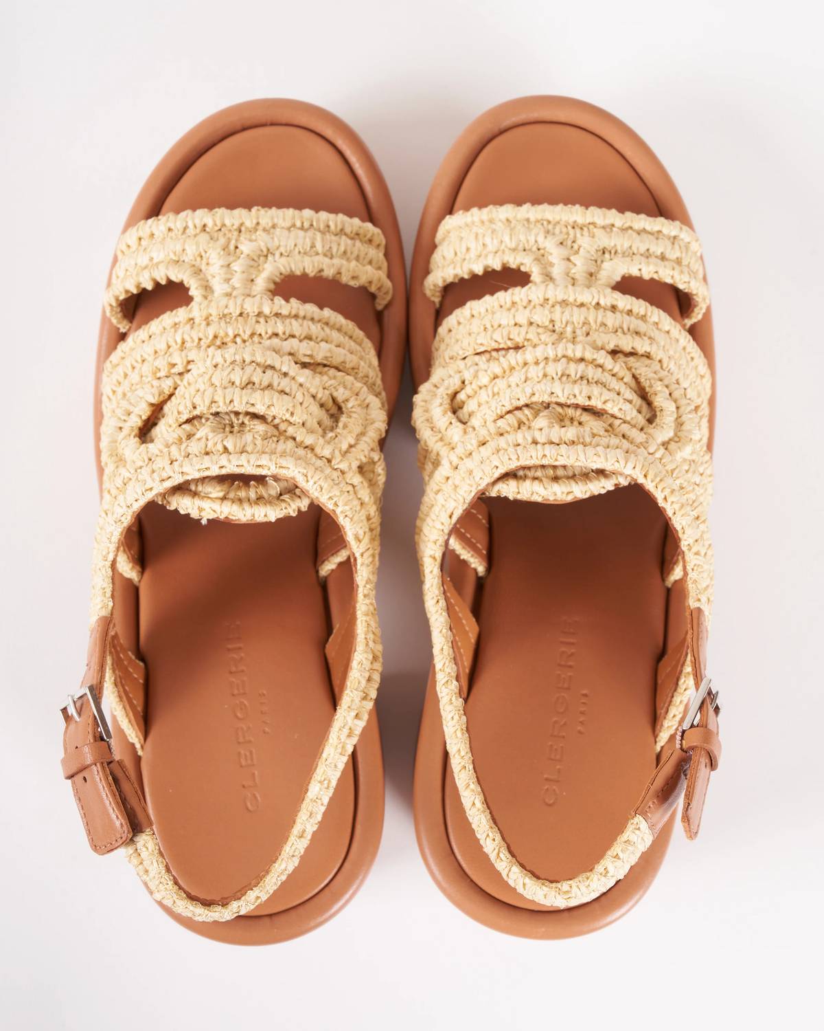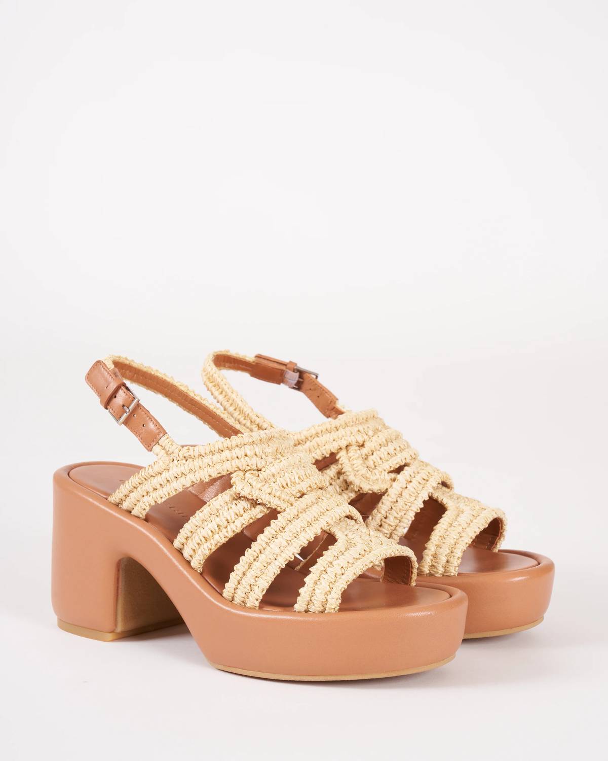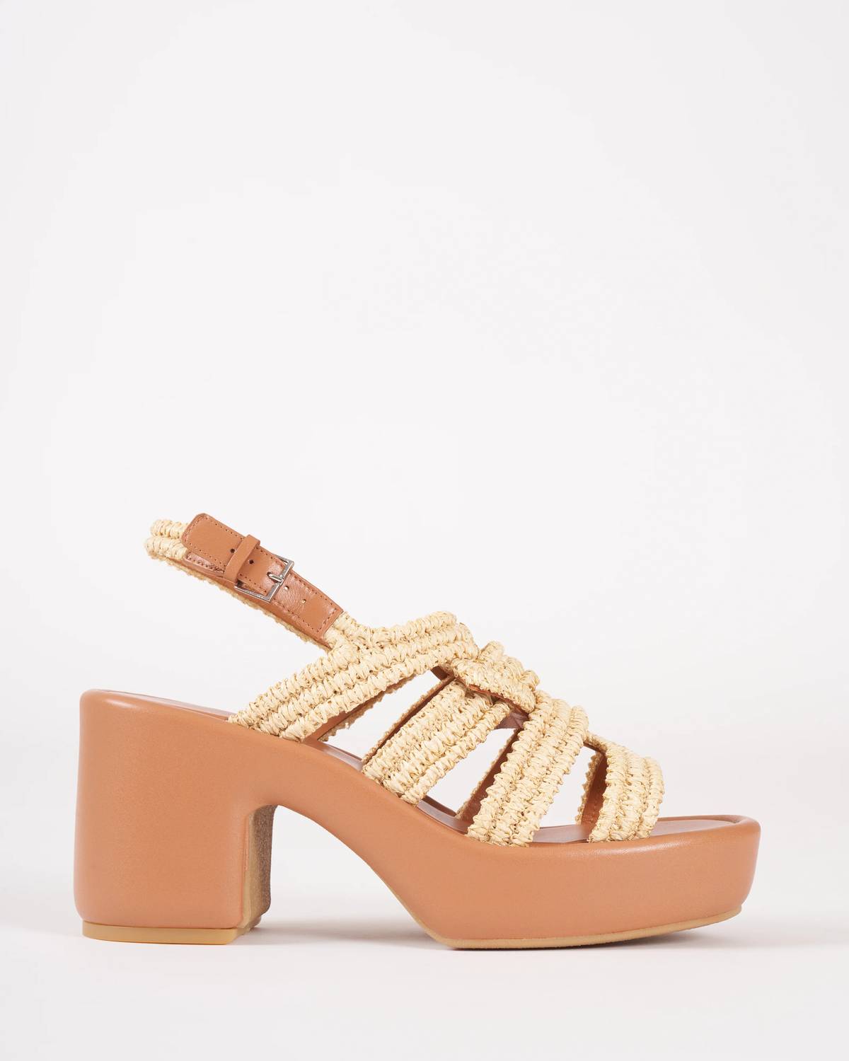 Nude chunky heels. Raffia upper. Leather lined. Ankle strap with adjustable silver buckle. Round toe. True to size. Heel Height: 3.5". Made in Spain.