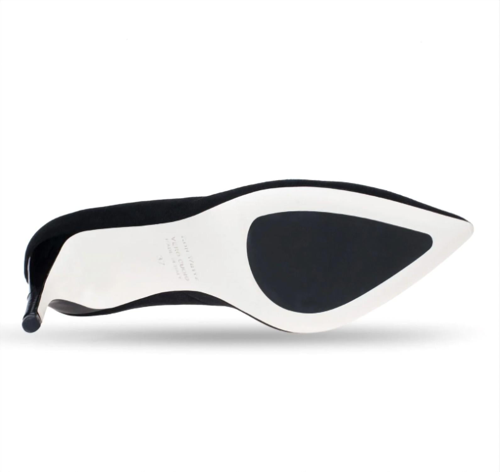 Pair these beauties with your favorite skinny jeans or dress for a night out on the town. Presenting the Women's Cindy Suede Pump by Ron White, a sophisticated choice for dinner parties and special occasions. Crafted in Italy, these onyx pumps feature a 3-inch stiletto heel wrapped in patent, with a pointed toe for an elegant look. The weatherproof cashmere suede upper and kid leather lining offer luxurious comfort, enhanced by Ron's Exclusive All Day Heels® technology, including PORON cushioning and arch support. Care for these high fashion heels by wiping them with a damp soft cloth.