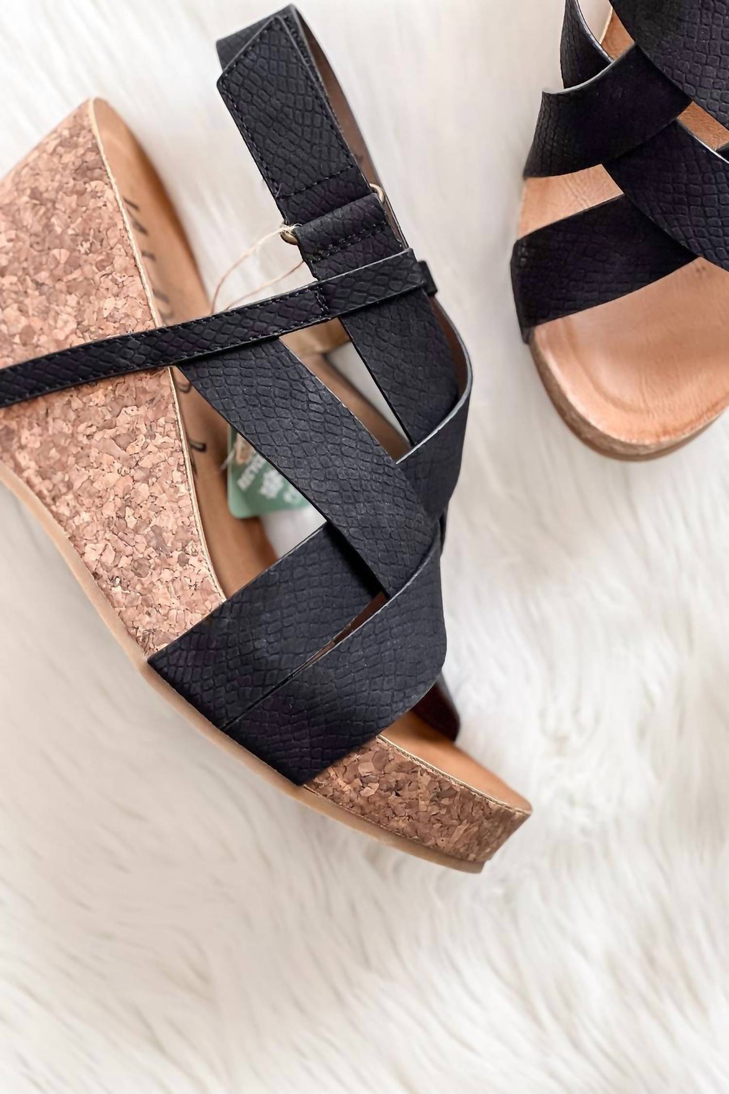 Don't be deceived, these heels are comfy as can be. Step into elegance and sustainability with the Blowfish Hotsun Wedge Sandals in Black. These stylish wedges feature a multi-strap upper made from recycled plastic and a comfortable 3.5-inch wedge heel. Designed with a practical velcro closure, they ensure easy wearability and all-day comfort with a cushioned footbed. Made for women, these sandals offer a perfect blend of fashion and eco-friendliness.