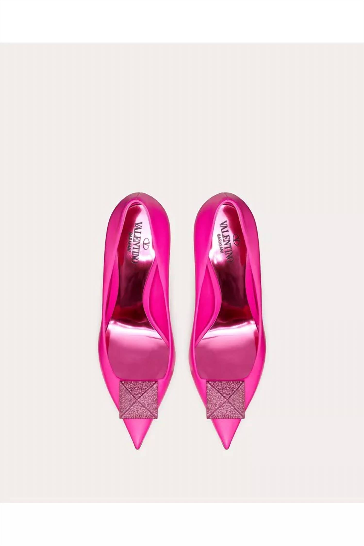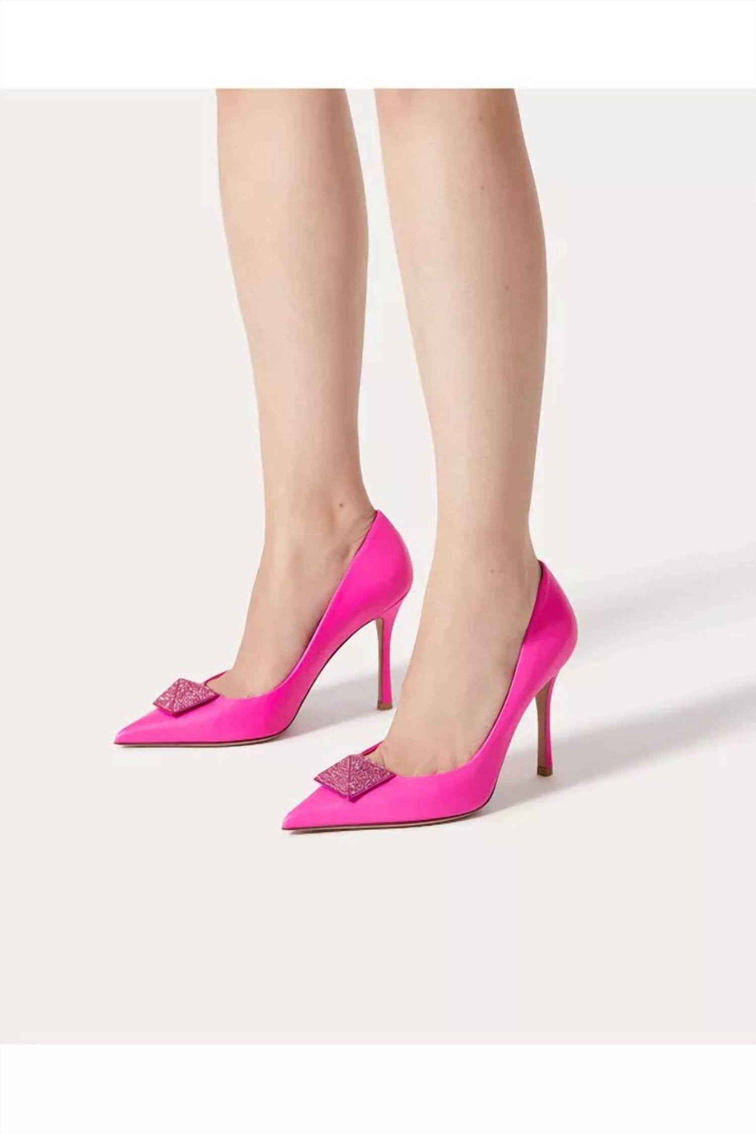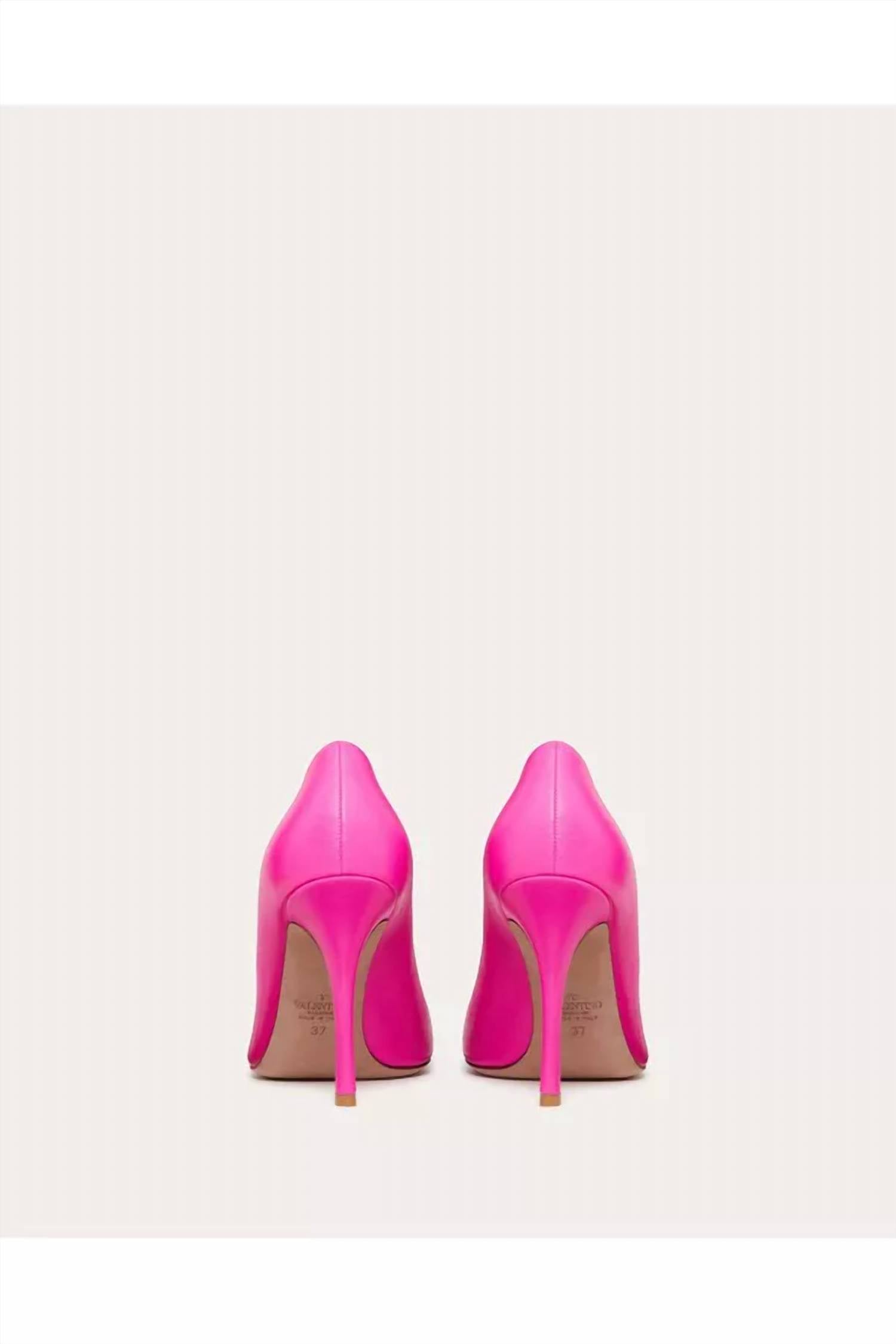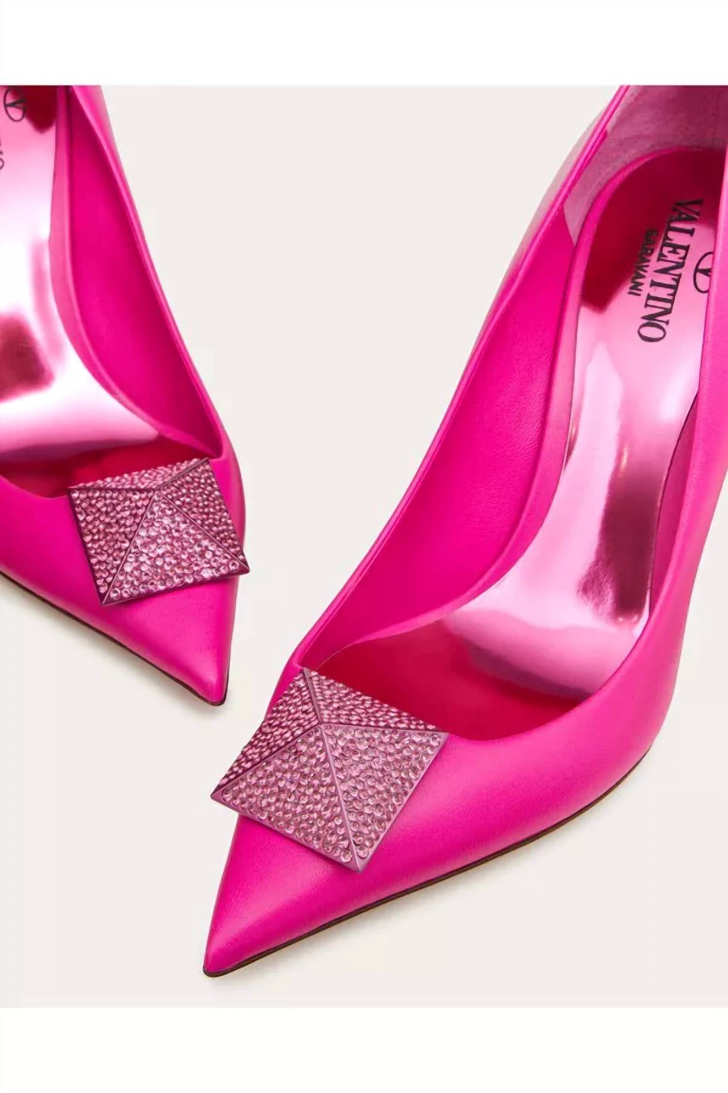 Pair these beauties with your favorite skinny jeans or dress for a night out on the town. Introducing the Valentino Garavani Women's One Stud Nappa Leather Pumps in an elegant pink hue, designed for a striking appearance. These pumps are crafted in Italy with premium nappa leather and feature a pointed toe along with a high stiletto heel measuring 100 mm (3.9 inches) for a sophisticated lift. The standout maxi stud decoration is adorned with tone-on-tone appliqué crystals, complemented by the signature Rockstud detailing. These slip-on style pumps boast a branded leather insole for added comfort.